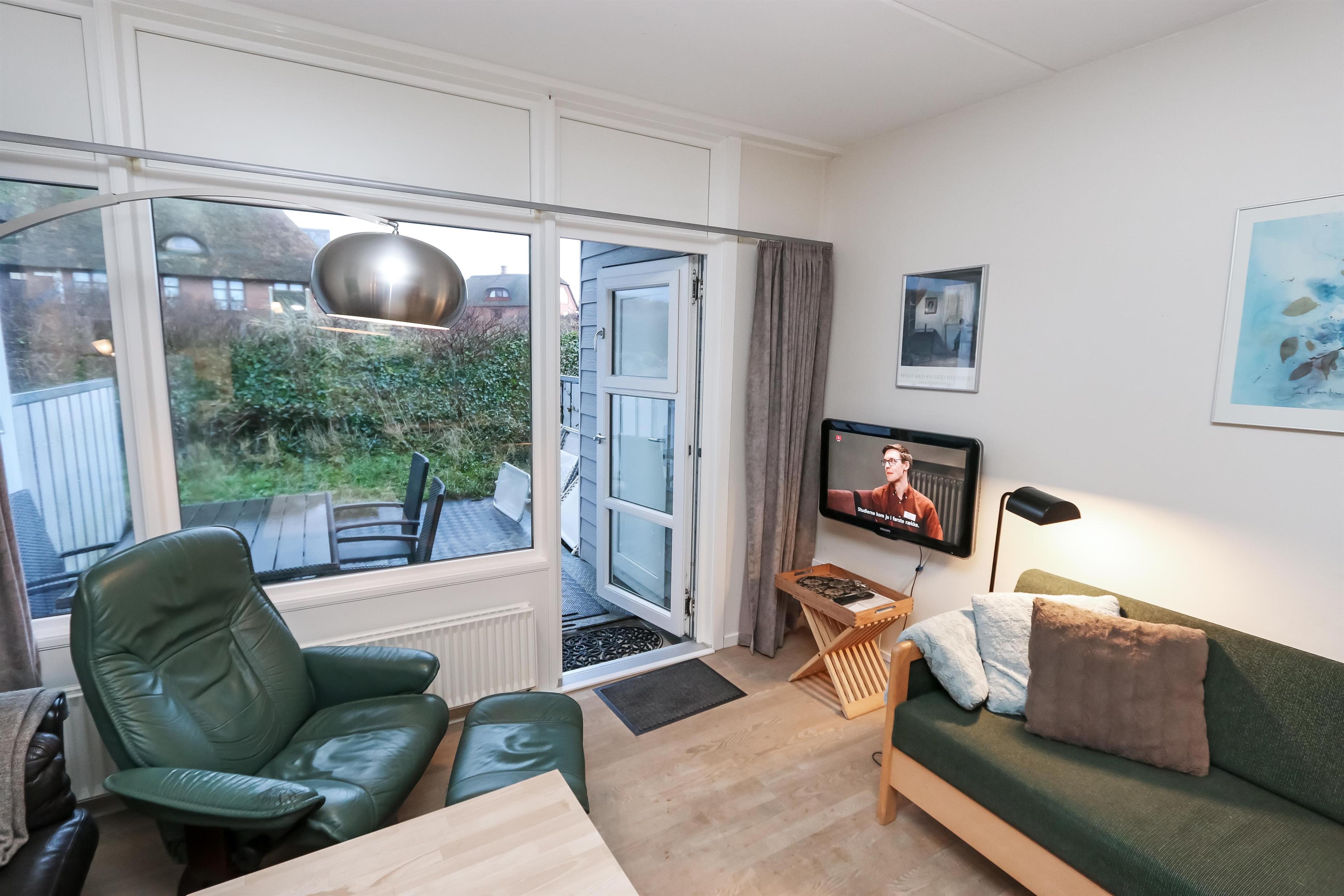 Hyggelig indrettet ferielejlighed til 4 personer beliggende i stueplan. Kombineret køkken og opholdstue. Stuen er indrettet med polster og lædermøbler, sovesofa som kan slåes ud så der blir plads til 2 personer, kabel-TV og linolium på gulvet. Køkkenet er indrettet med glaskeramisk komfur, emhætte køleskab, opvaskemaskine og mikroovn. 1 soverum med 1 DS og 1S og linoliumsgulv. Badeværelse med bruser, toilet og håndvask. Fra stuen er der udgang til lille indhegnet og delvis overdækket terrasse med havemøbler.