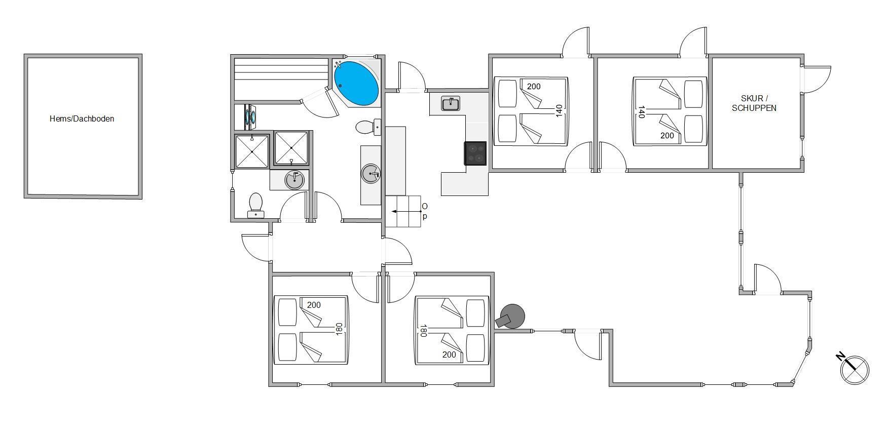 Sommerhuset har 2 badeværelser med gulvvarme, 4 soveværelser med dobbeltsenge og det store alrum, der forener køkken, stue og spisestue. I alrummet er der en brændeovn, der sætter prikken over i’et for feriestemningen. Fra alrummet kan I også kravle op på en hems, som børnene helt sikkert vil elske.