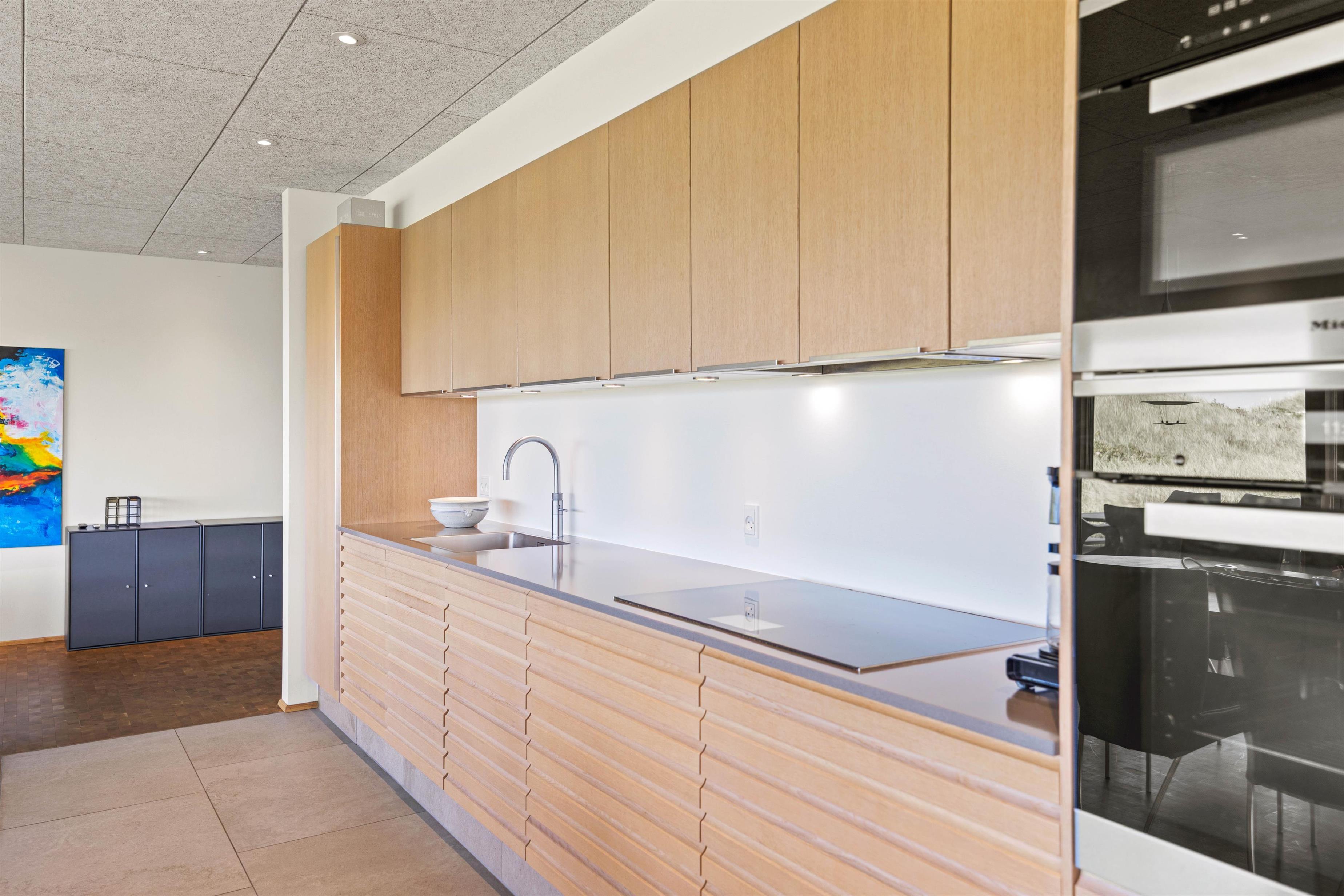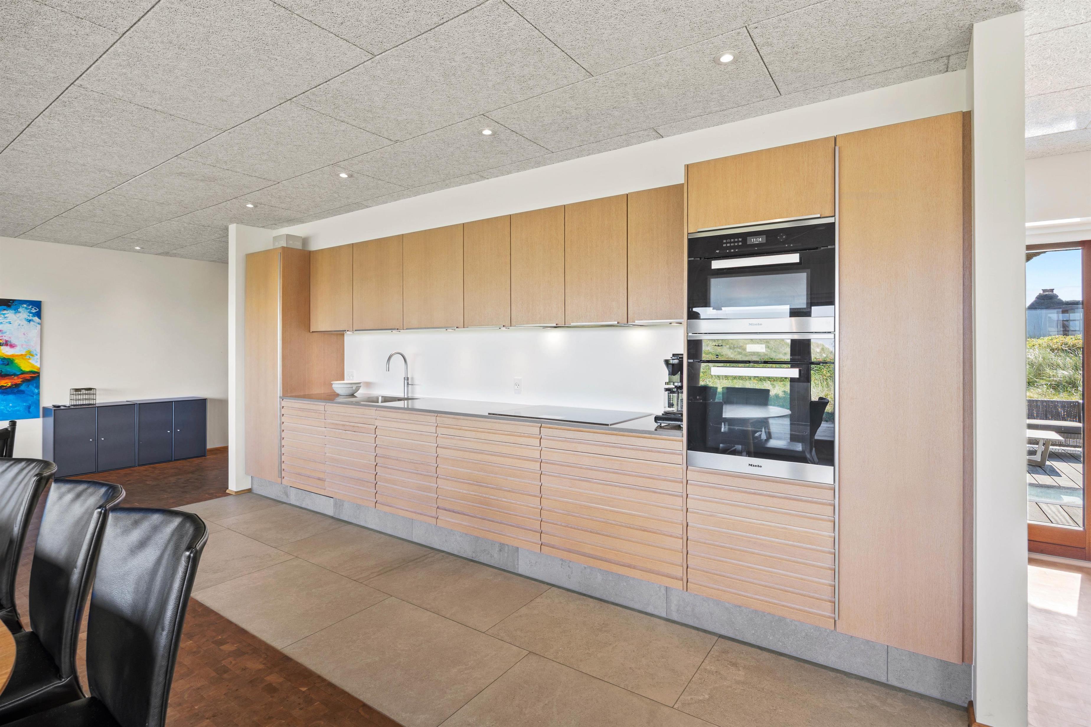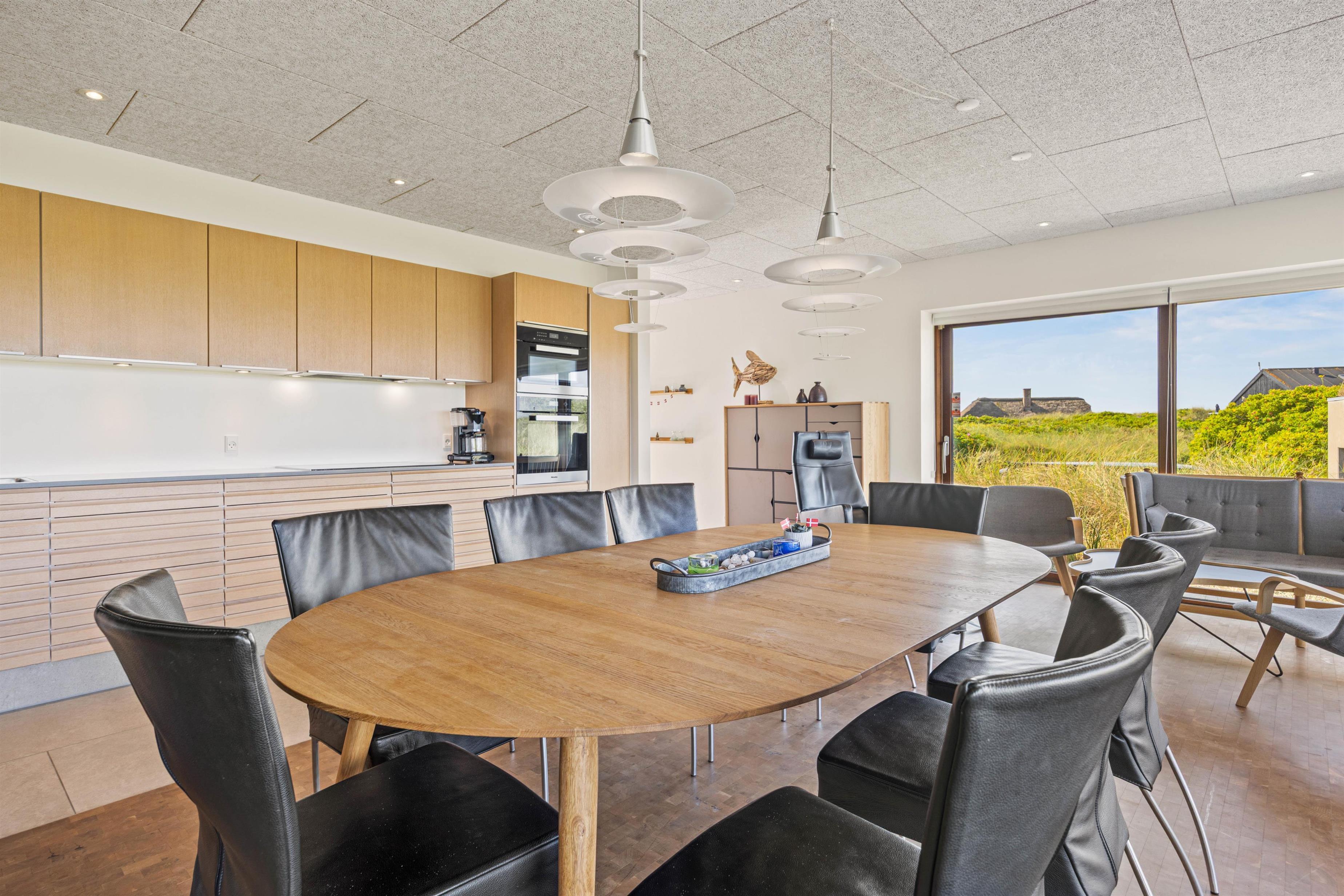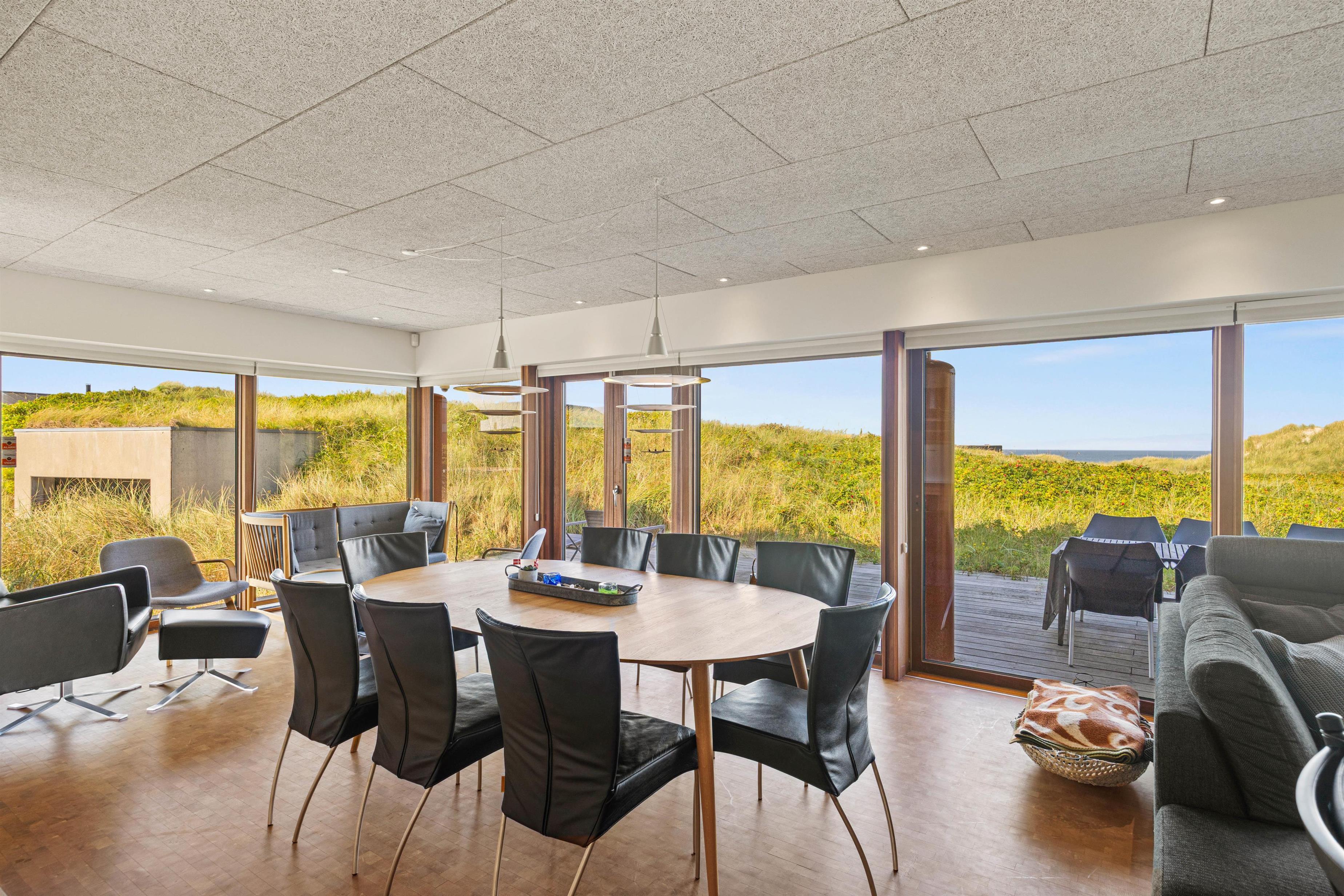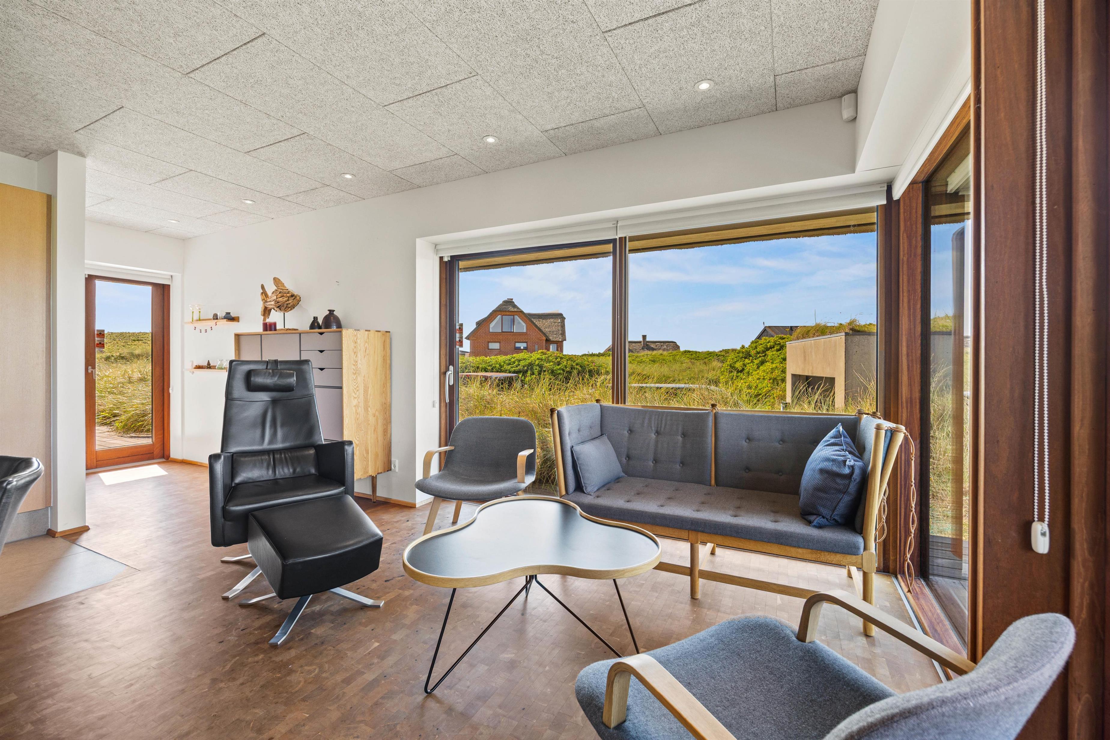 Det eksklusivt beliggende feriehus garanterer med sine 180 m2 et skønt ferieophold for op til 10 personer. Det ene af sommerhusets 4 soveværelser med eget bad ligger på husets første sal – her kan du stå op til den mest fantastiske udsigt og straks tjekke, om du ikke lige skal have en morgendukkert før morgenmaden. Bor du i et af de 2 øvrige værelser, kan du åbne terrassedøren og på bare tæer liste ud og nyde morgenluften ved Vesterhavet. I kælderen er der værelse med dobbeltseng og køjeseng, indrettet som familierum med TV.