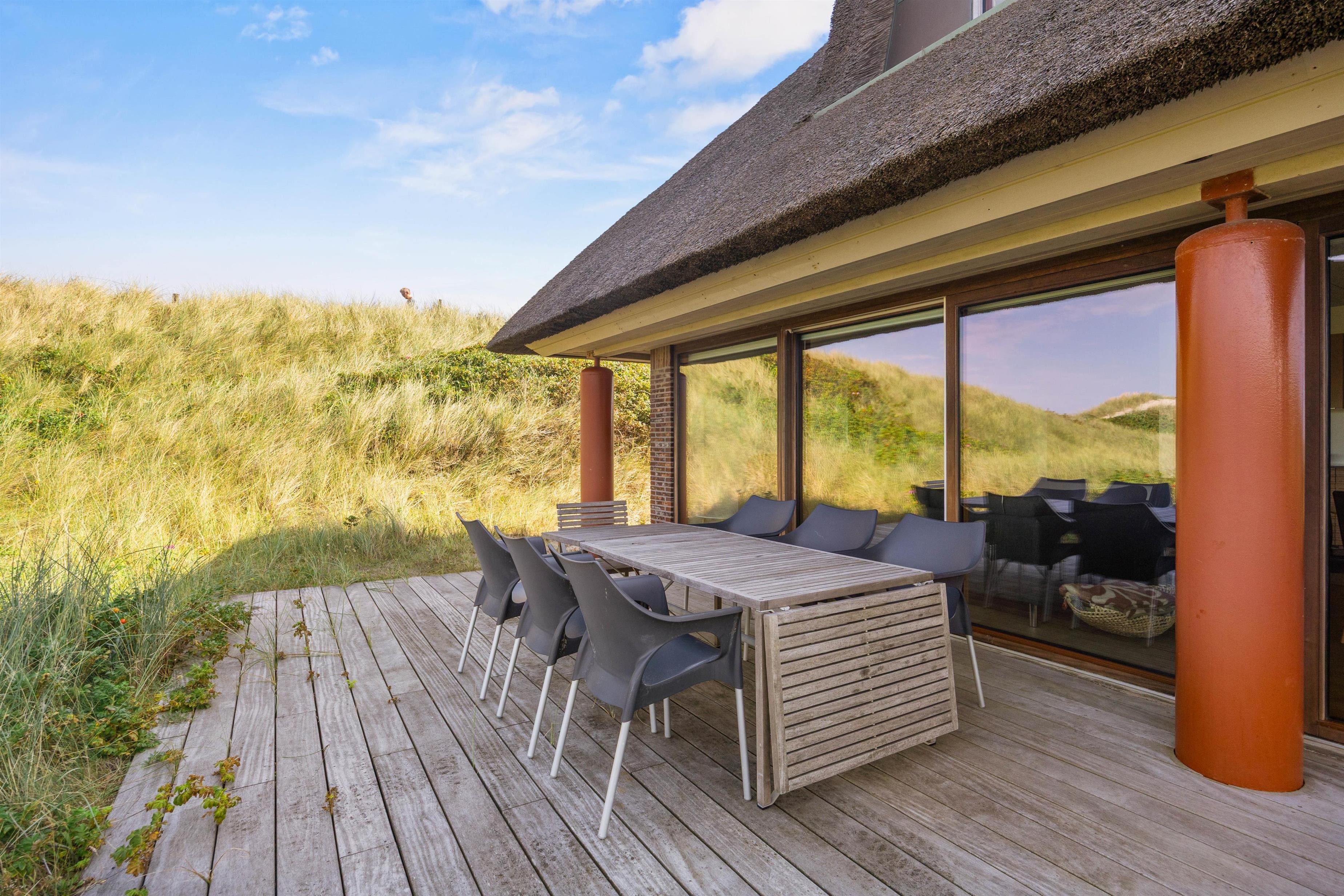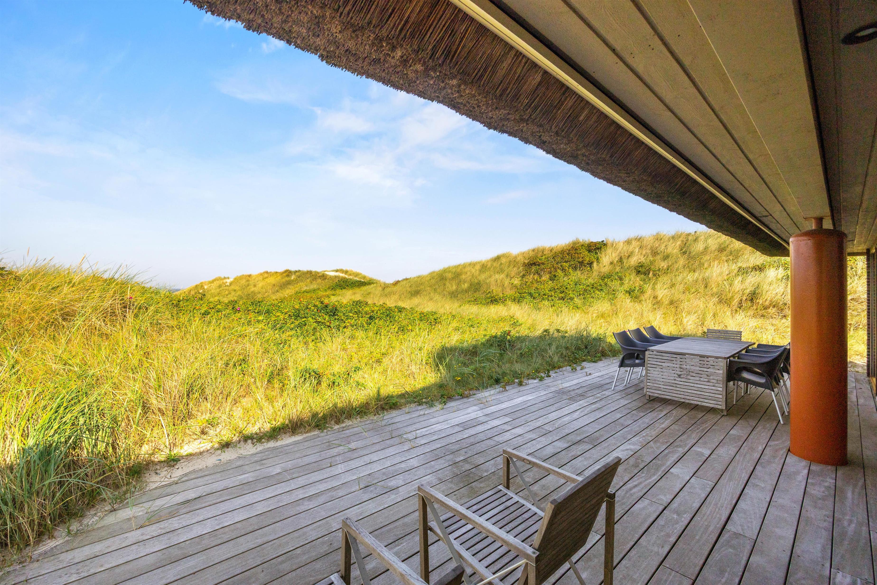 På Klitvej 23 bor I lige ved stranden, så tæt, at I kan tilbringe dagen på feriehusets skønne træterrasse, der omkranser huset og er delvist overdækket. Her står der gode liggestole og naturligvis også en grill til jeres rådighed. Når du trænger til en dukkert i havet, kan du blot hænge håndklædet over skulderen og tage bølgebrættet under armen. Slutteligt sidder I på terrassen absolut på 1. parket, når himlen farver sig rød, og solen langsomt går ned i havet - det bliver ikke smukkere.