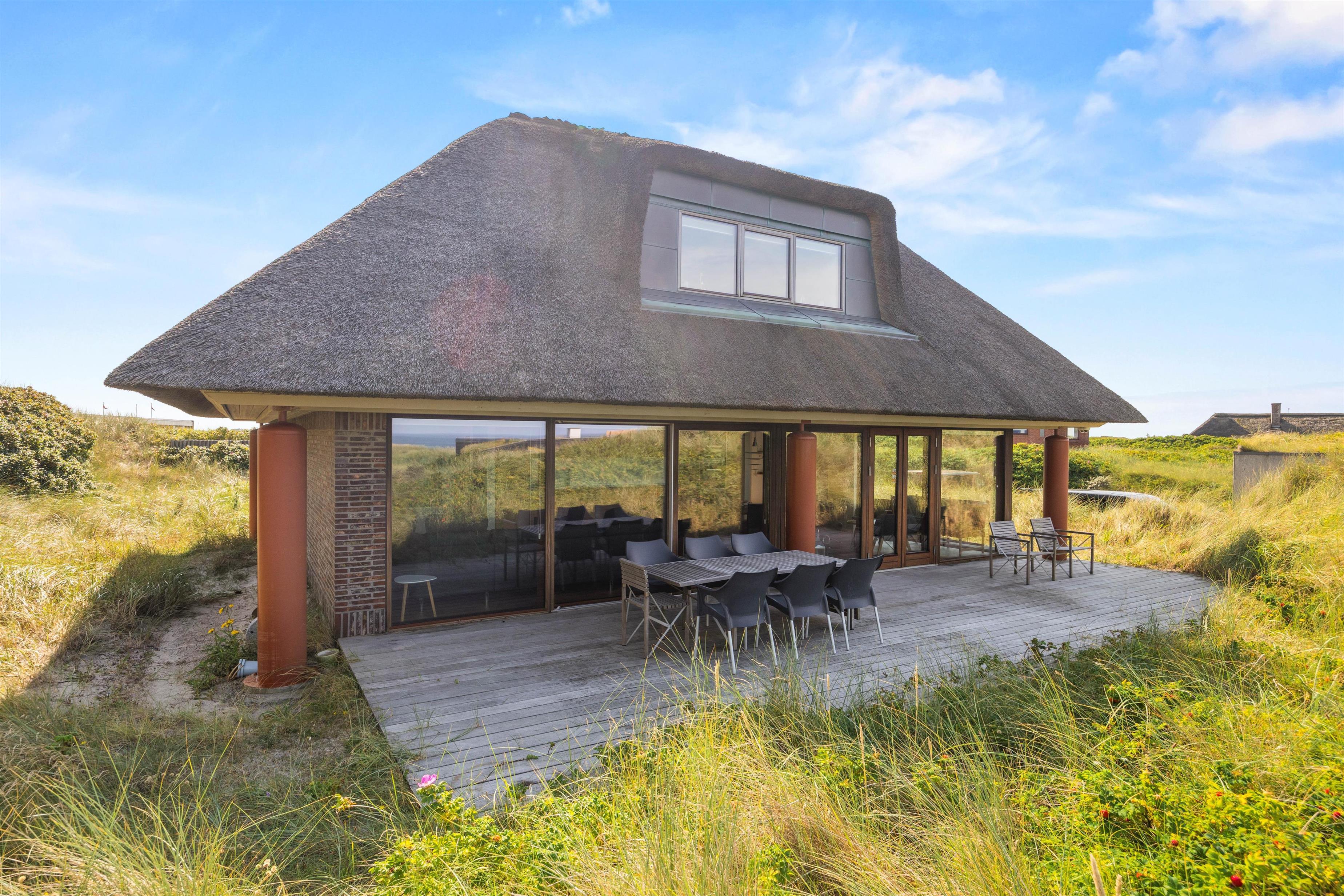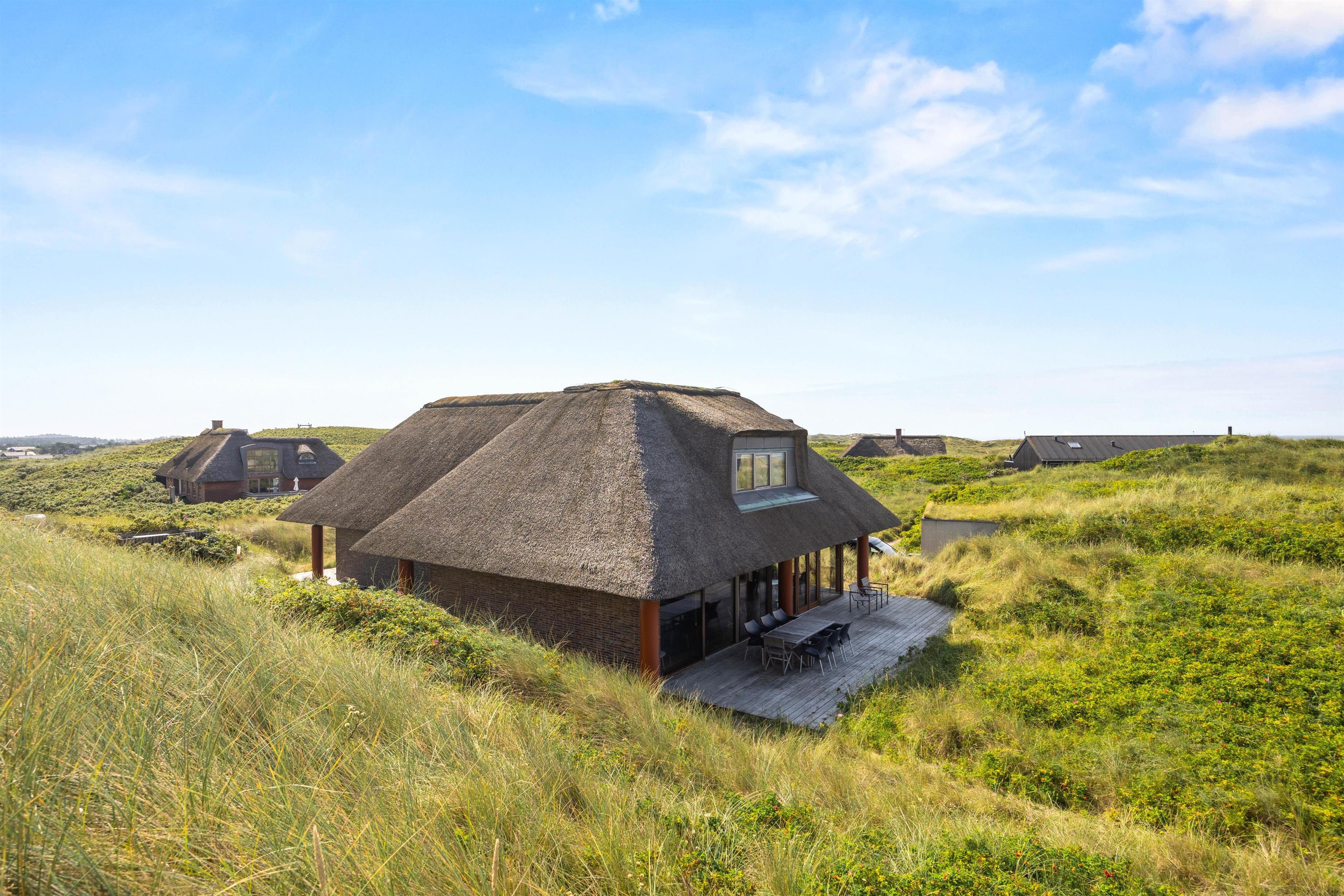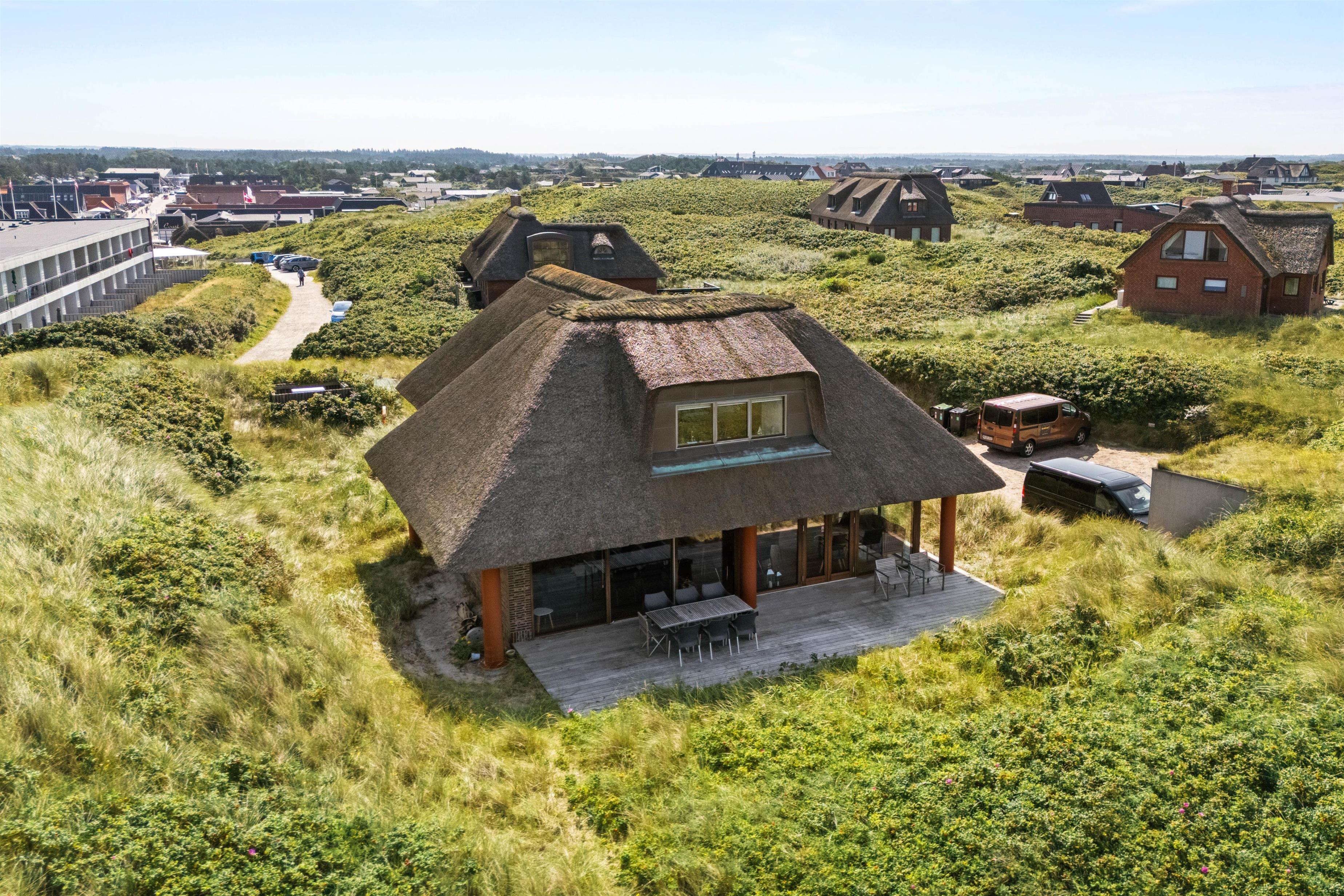 En skøn udsigt, der lover masser af sommer, sol og strand: Dette stilfulde feriehus er til dig, der også i ferien lægger værd på smukke omgivelser og luksus, og hvor intet mindre end den perfekte beliggenhed kan gøre det. Det smukke stråtækte feriedomicil ligger på en klittop med udsigt til Vesterhavet og i gåafstand til feriebyen Henne Strand, der emmer af sommerstemning med udendørsliv foran cafeer og butikker.