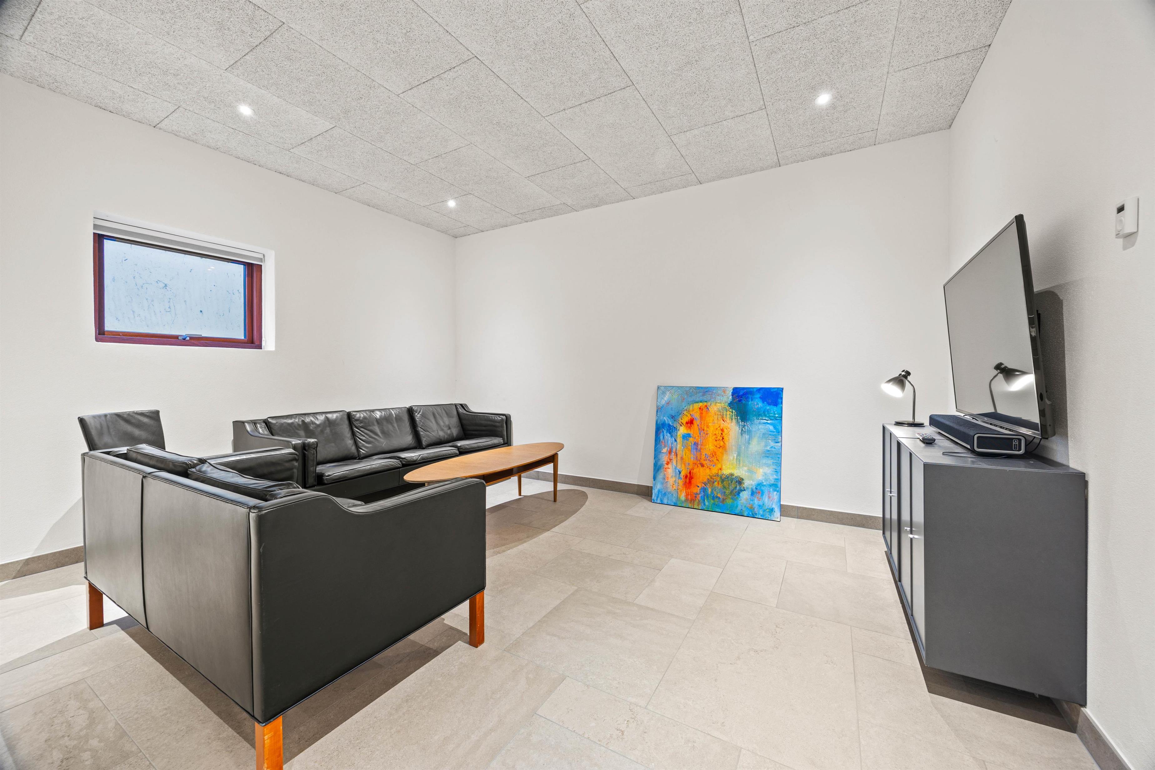 I husets underetage er der både et ekstra fjernsynsrum og et rum med praktiske faciliteter som vaskemaskine og tørretumbler. Ikke mindst har du en stor garage, så du ubesværet kan nyde den salte havluft, men bilen står tørt og sikkert.