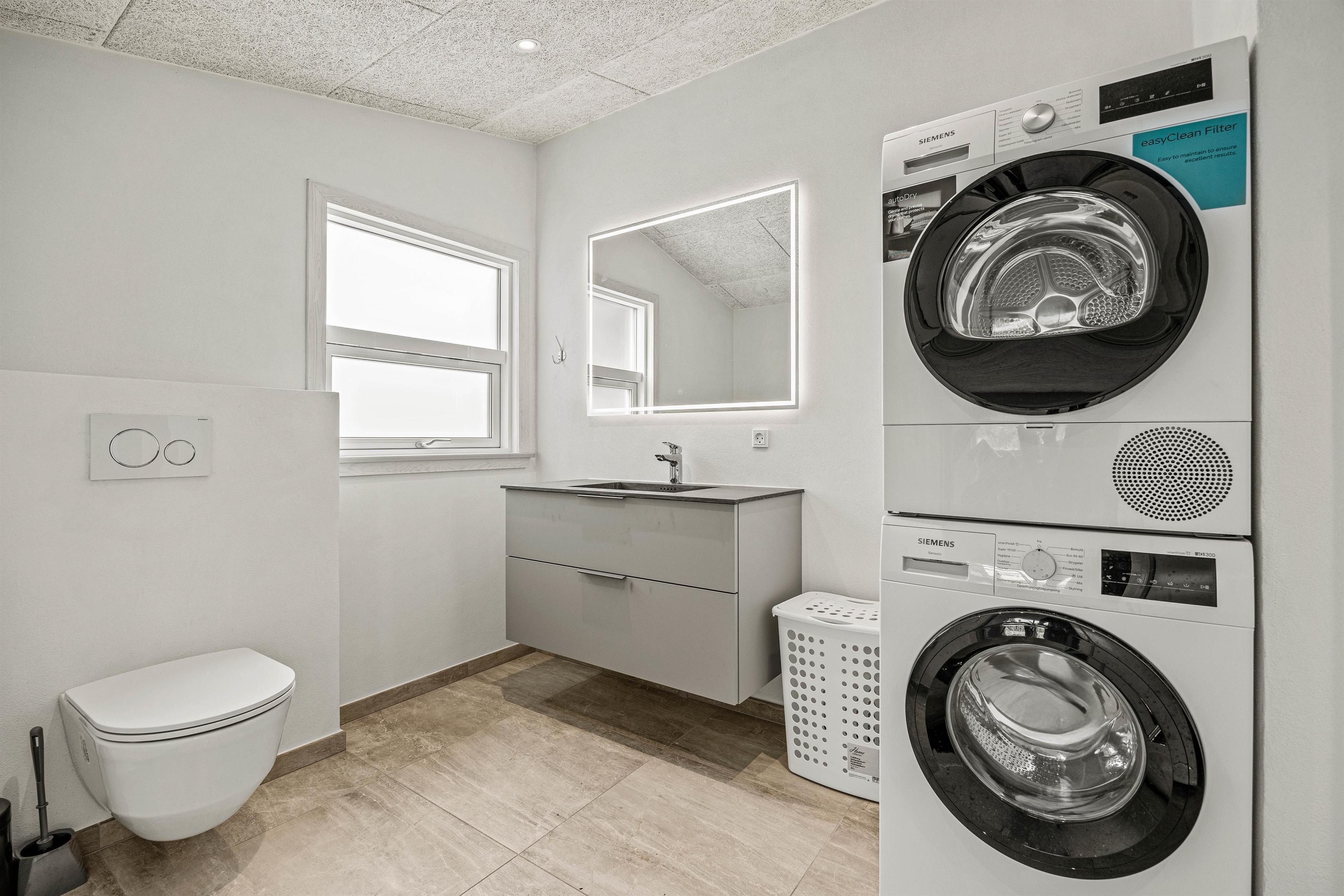 Indendørs byder sommerhuset på en hyggelig stue med en brændeovn, der skaber en varm atmosfære til hyggelige aftener. Køkkenet er fuldt udstyret med opvaskemaskine, og vaskemaskine og tørretumbler for maksimal komfort og bekvemmelighed. Den rummelige entre og de veludstyrede opholdsrum sikrer, at I har rigelig plads til alle.