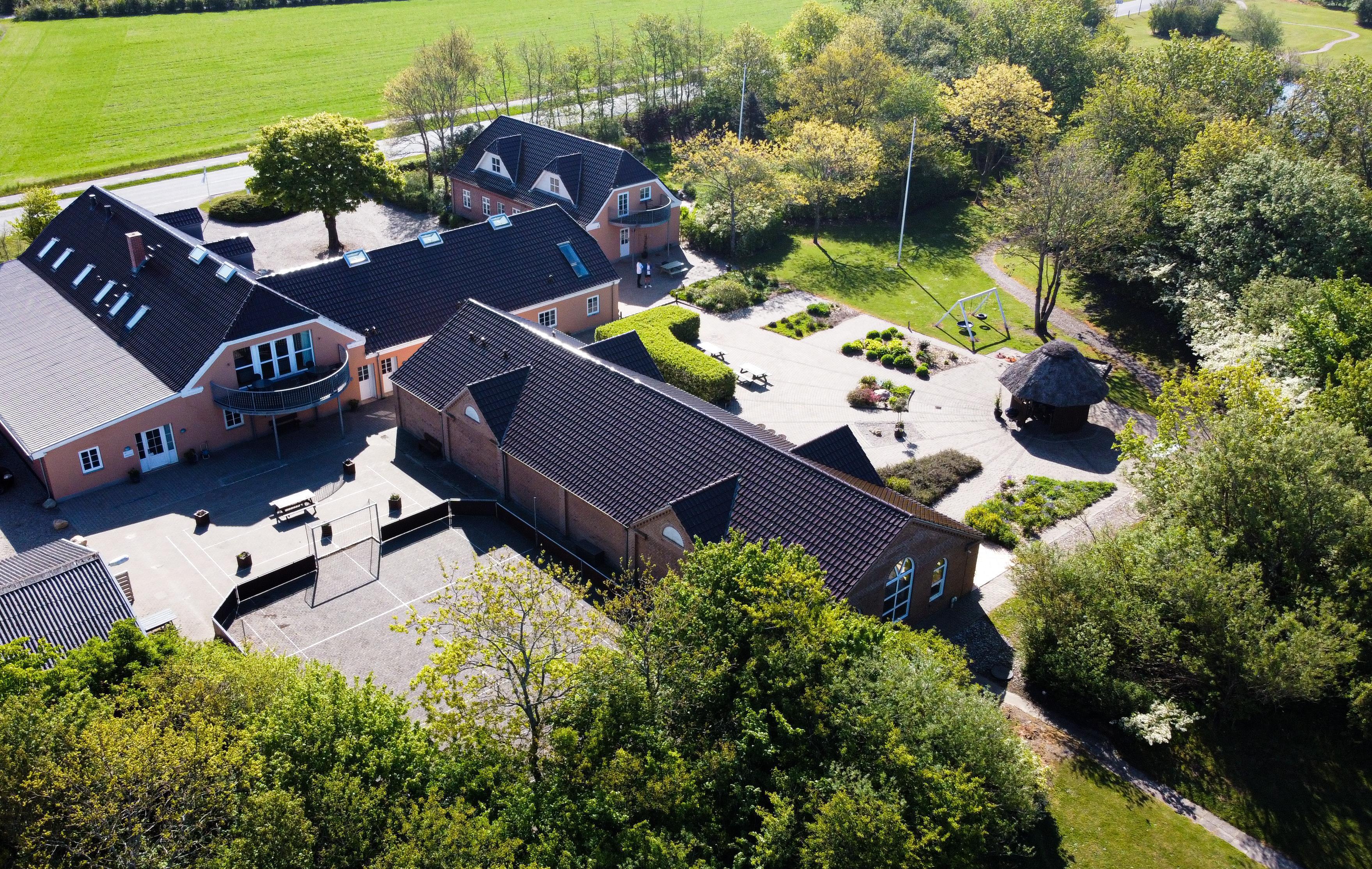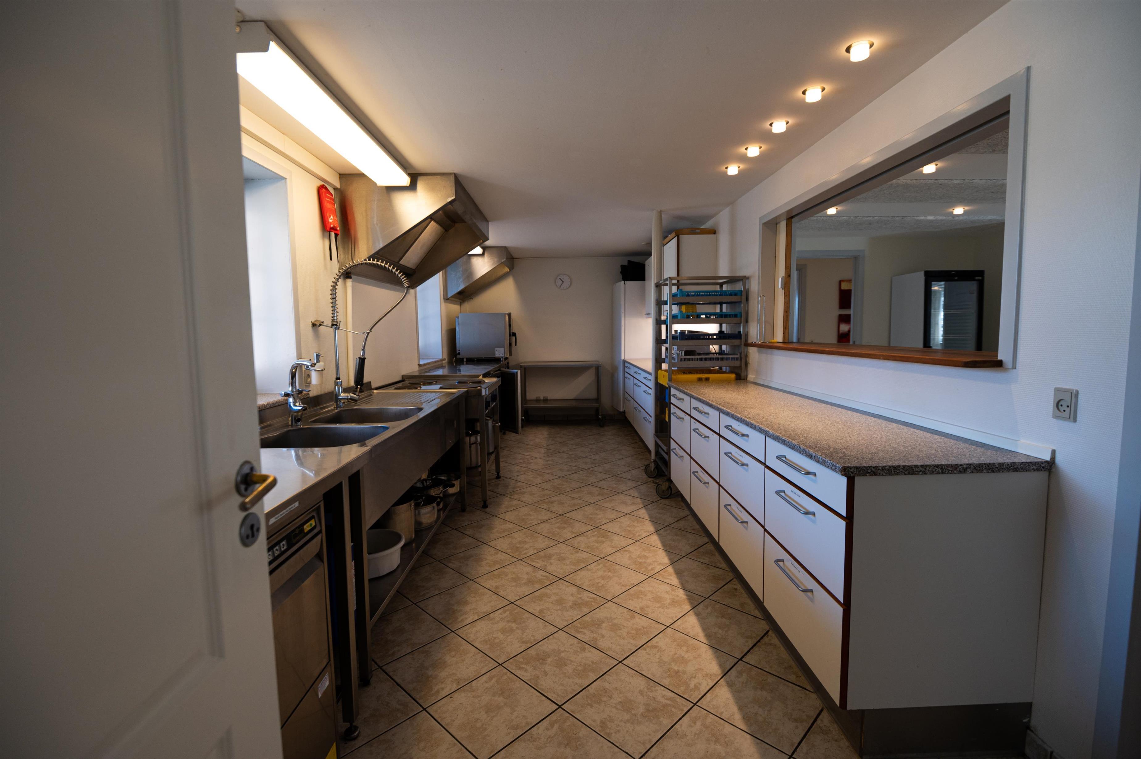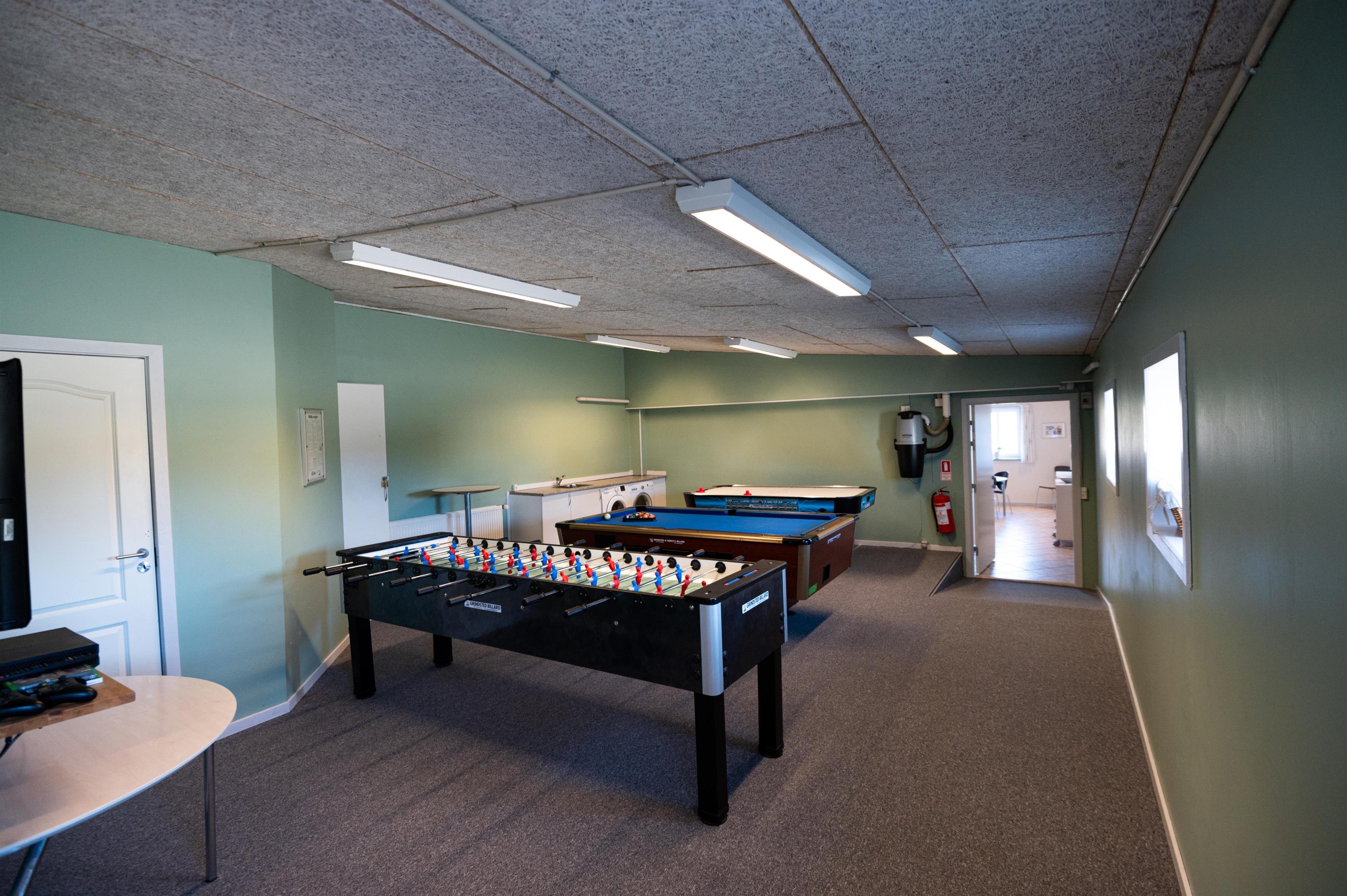 Hovedhuset indeholder et aktivitetsrum med pool, bordfodbold, dart og X-box spillemaskine, en spisestue med tilhørende industrikøkken med service til 60 personer, industriopvaskemaskine, stegeovn og alt til madlavning I køkkenet er der en madelevator op til 1 salen hvor opholdsstue, værelsesfløj og konference lokalet findes.