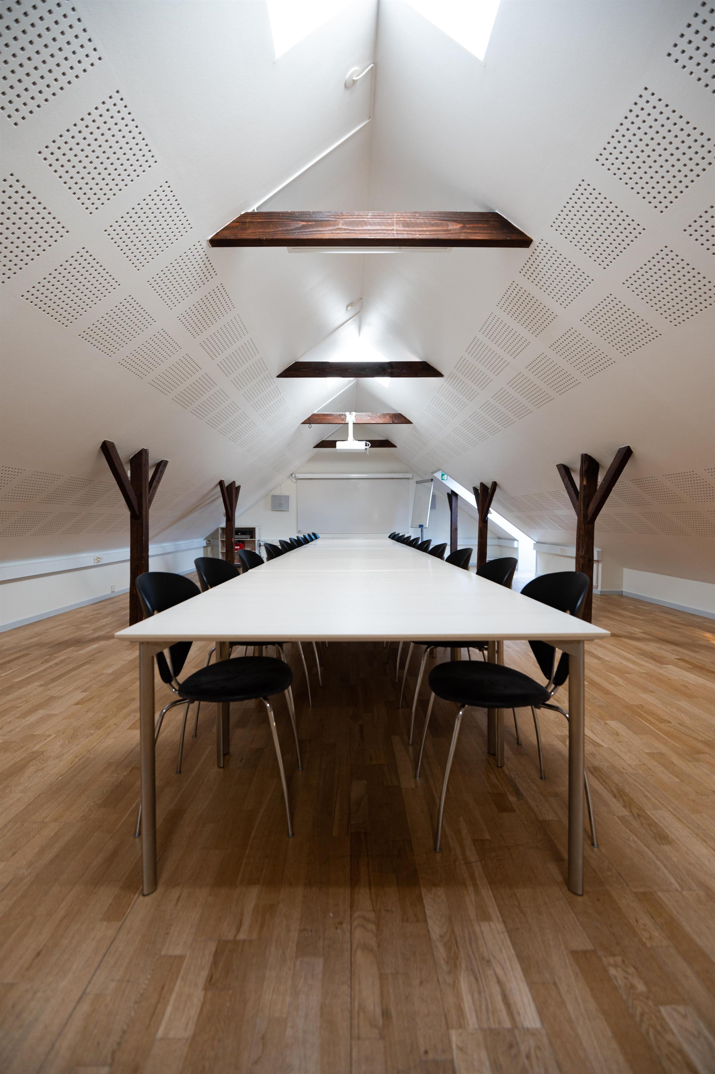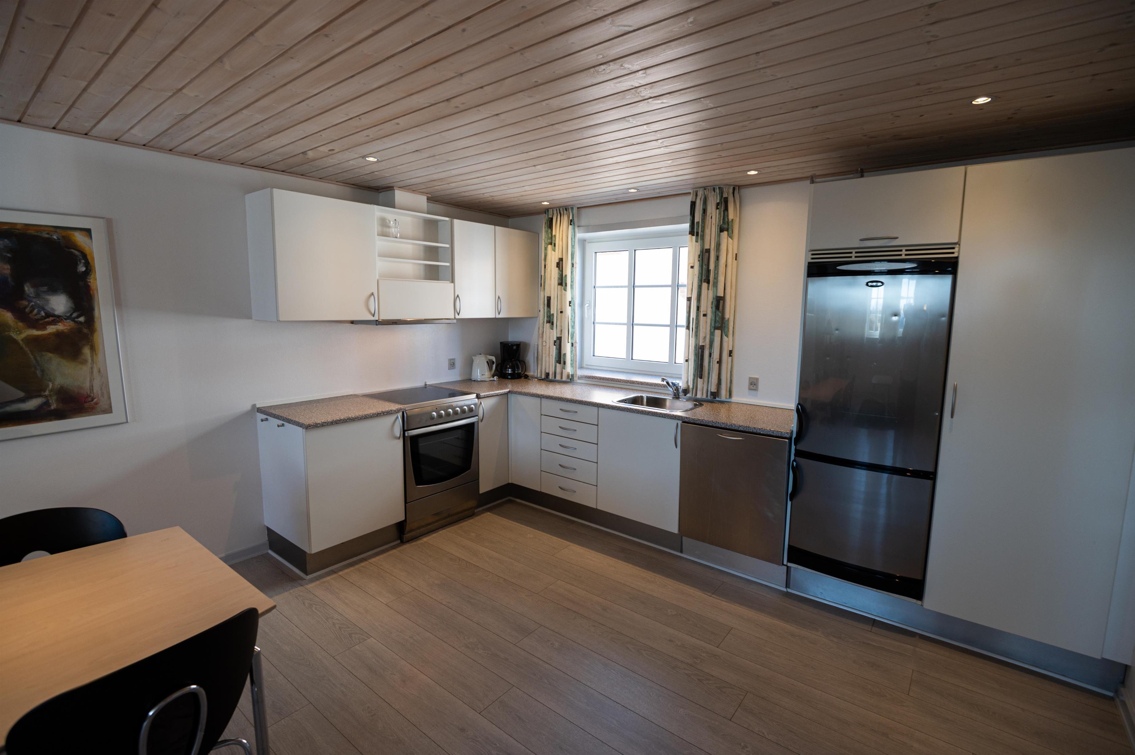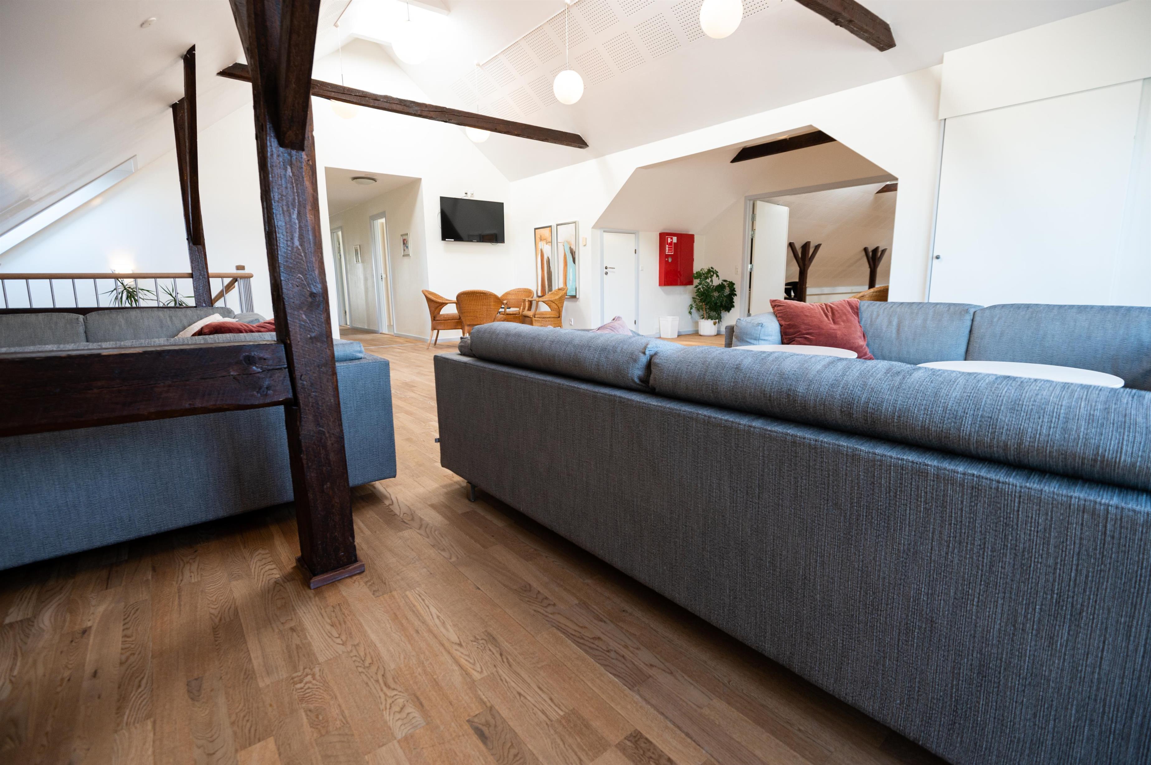 Hovedhuset indeholder et aktivitetsrum med pool, bordfodbold, dart og X-box spillemaskine, en spisestue med tilhørende industrikøkken med service til 60 personer, industriopvaskemaskine, stegeovn og alt til madlavning I køkkenet er der en madelevator op til 1 salen hvor opholdsstue, værelsesfløj og konference lokalet findes.