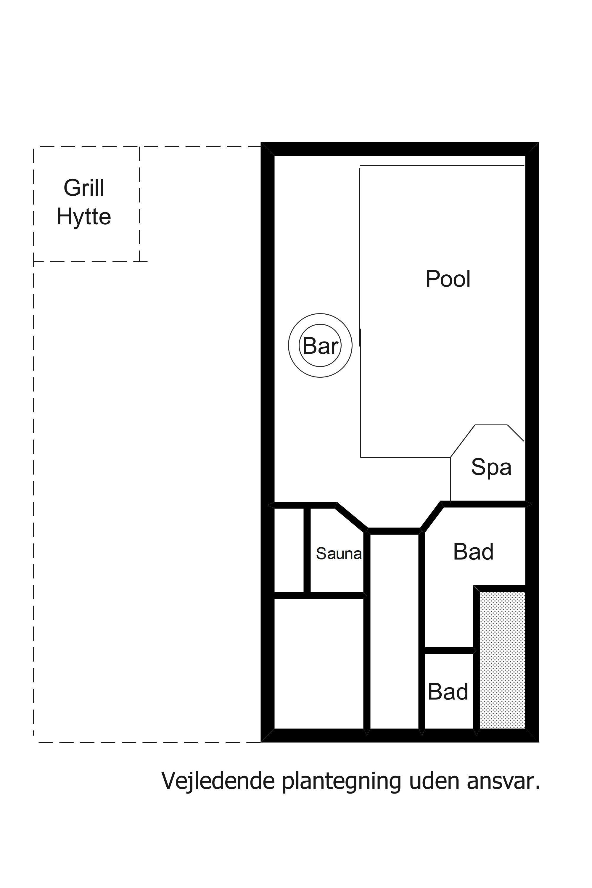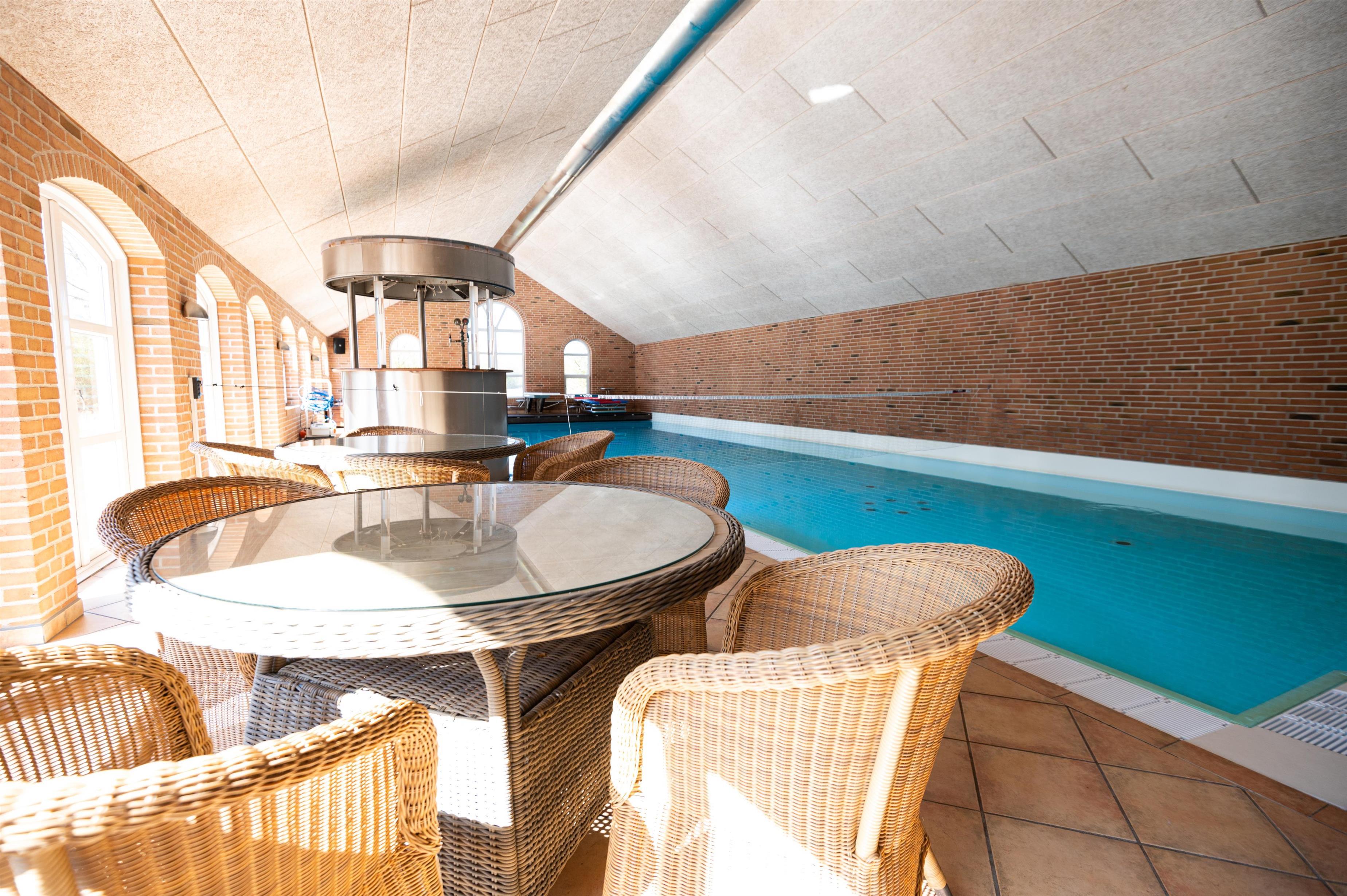Det imponerende 200 m2 store poolområde byder på en funklende stjernehimmel med 7500 små lys, den 80 m2 store swimmingpool med vippe og trampolin indbyder til flere timers leg, og det 8 personers spabad lokker med behagelig undervandsmassage. Som noget helt ekstraordinært findes en underjordisk bar, man kan hæve op fra gulvet i poolområdet - helt ideelt til poolpartys.