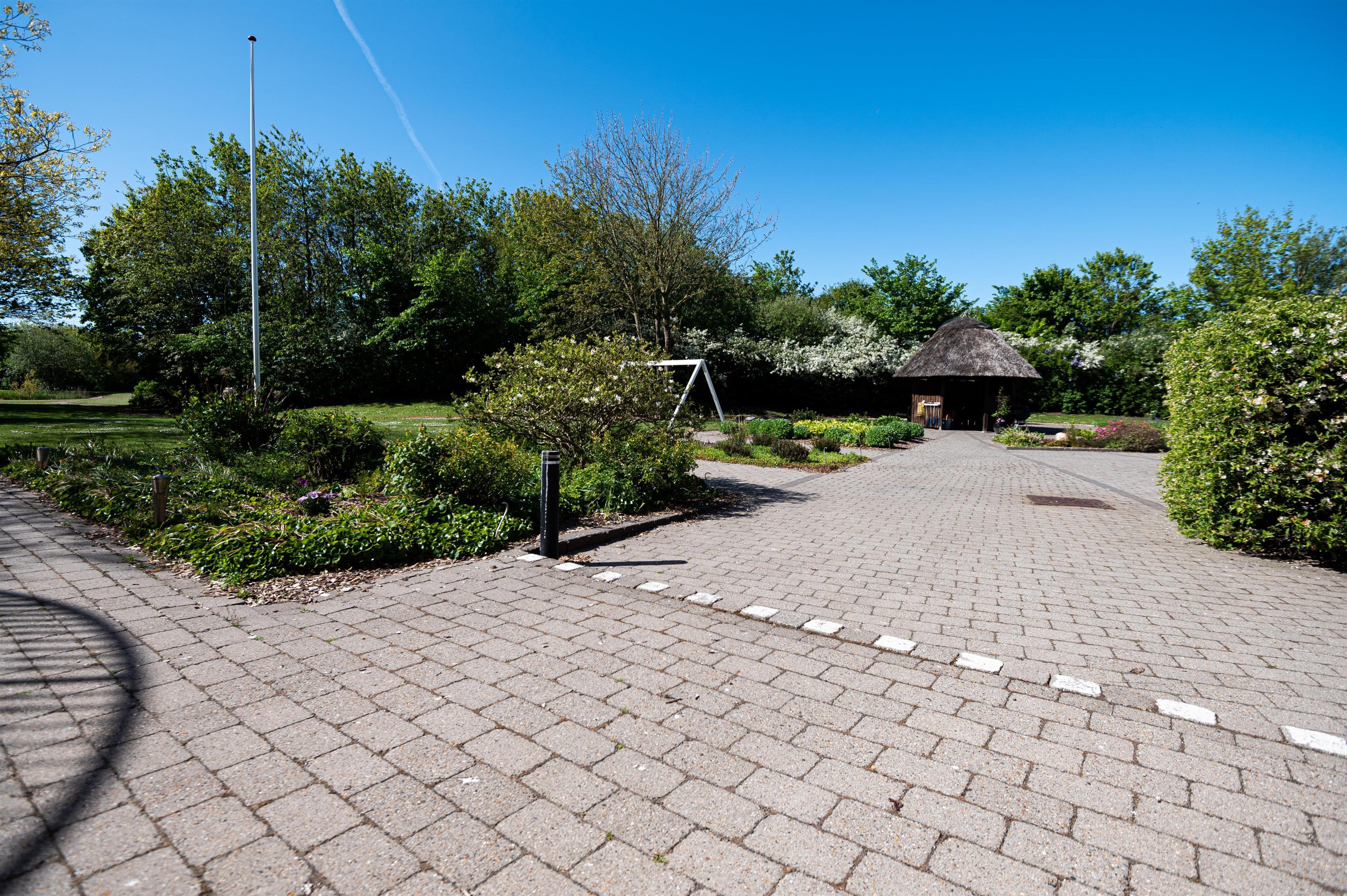 På de store udenoms arealer er der anlagt en multibane, hvor der kan dystes mod hinanden i fodbold, badminton, hockey, osv. I den 1 tønde land store have findes en lille sø, Beach Volley og hoppepude. I umiddelbar tilknytning til haven er der mulighed for en god naturoplevelse med en gå, eller løbetur i Axelgaards 6 ha. store privat skov. Den dejlige solfyldte terrasse indbyder til solbadning og grillaftener ved den store grillhytte.
