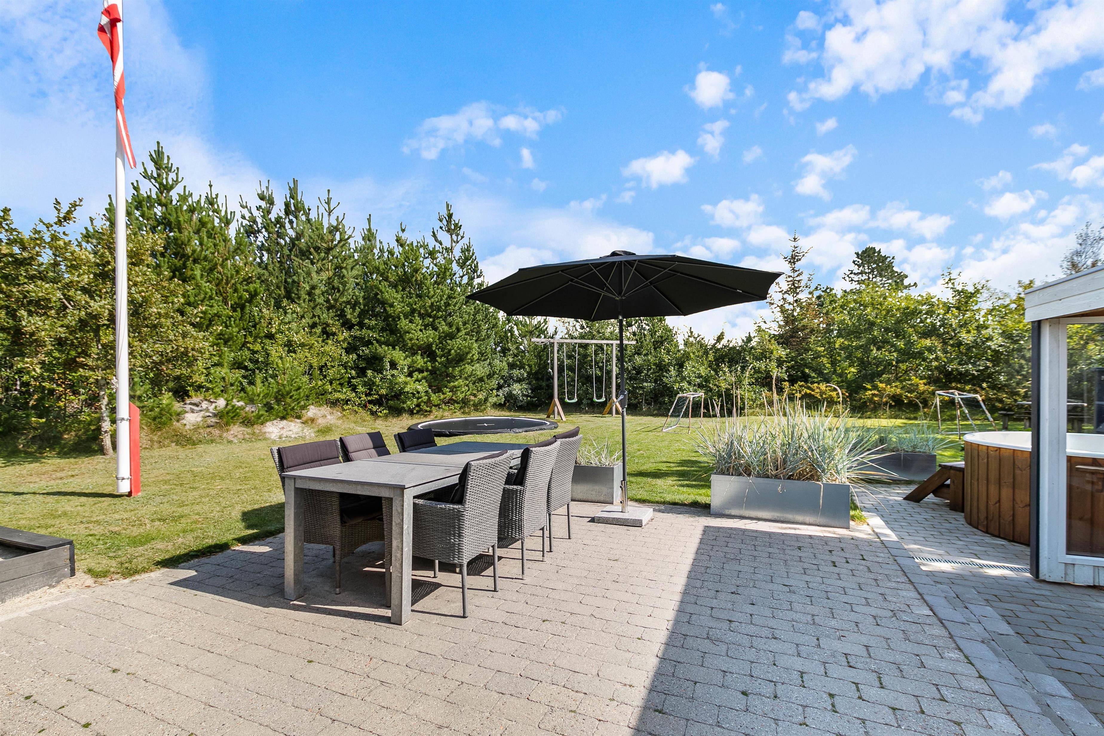 Et højdepunkt på Lunden 8 er klart det dejlige uderum. Her er en stor flisebelagt terrasse, et vildmarksbad og en stor grøn græsplæne! For de yngre gæster er her både sandkasse og gynge, mens en trampolin på den rummelige plænegrund giver mulighed for sjov og leg under åben himmel. Hele familien kan desuden nyde godt af vildmarksbadet, som har plads til 6 personer. På terrassen finder I også en udebruser*, praktisk hvis man hurtigt skal køles ned efter en tur i vildmarksbadet eller skylle tæerne efter en dag på stranden.