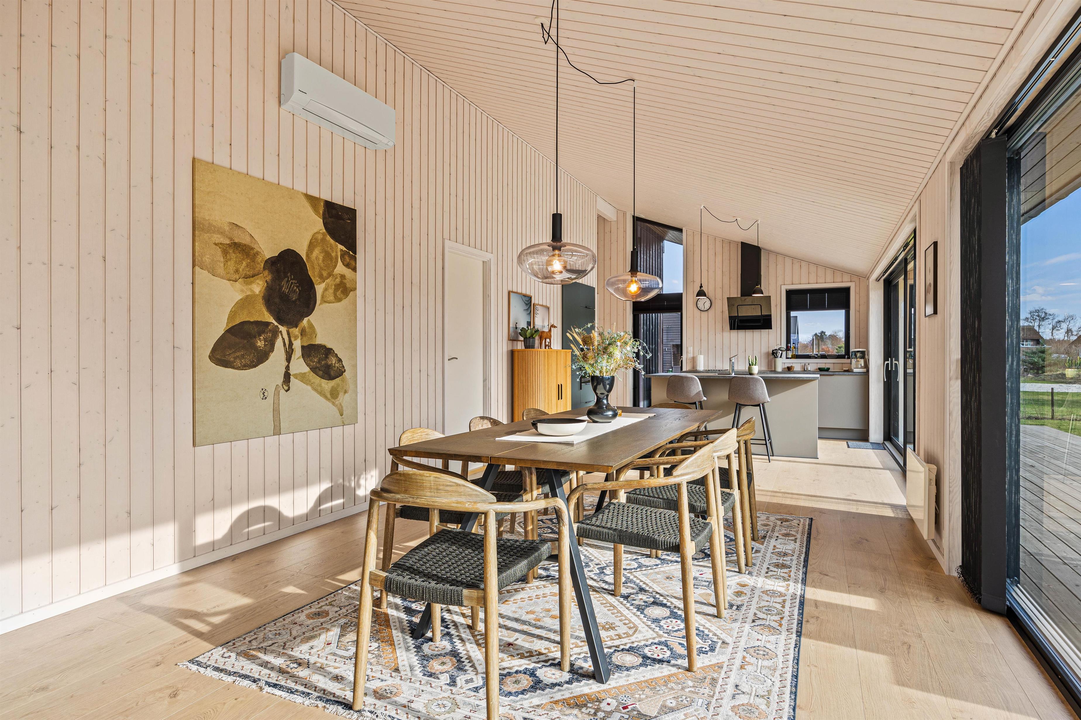 Den tilstødende spiseplads er velegnet til mange hyggelige timer med bræt- eller kortspil med hele familien. Det moderne køkken er udstyret med opvaskemaskine, mikrobølgeovn, køleskab og en 80l fryser – og byder i den grad op til fælles madlavning.