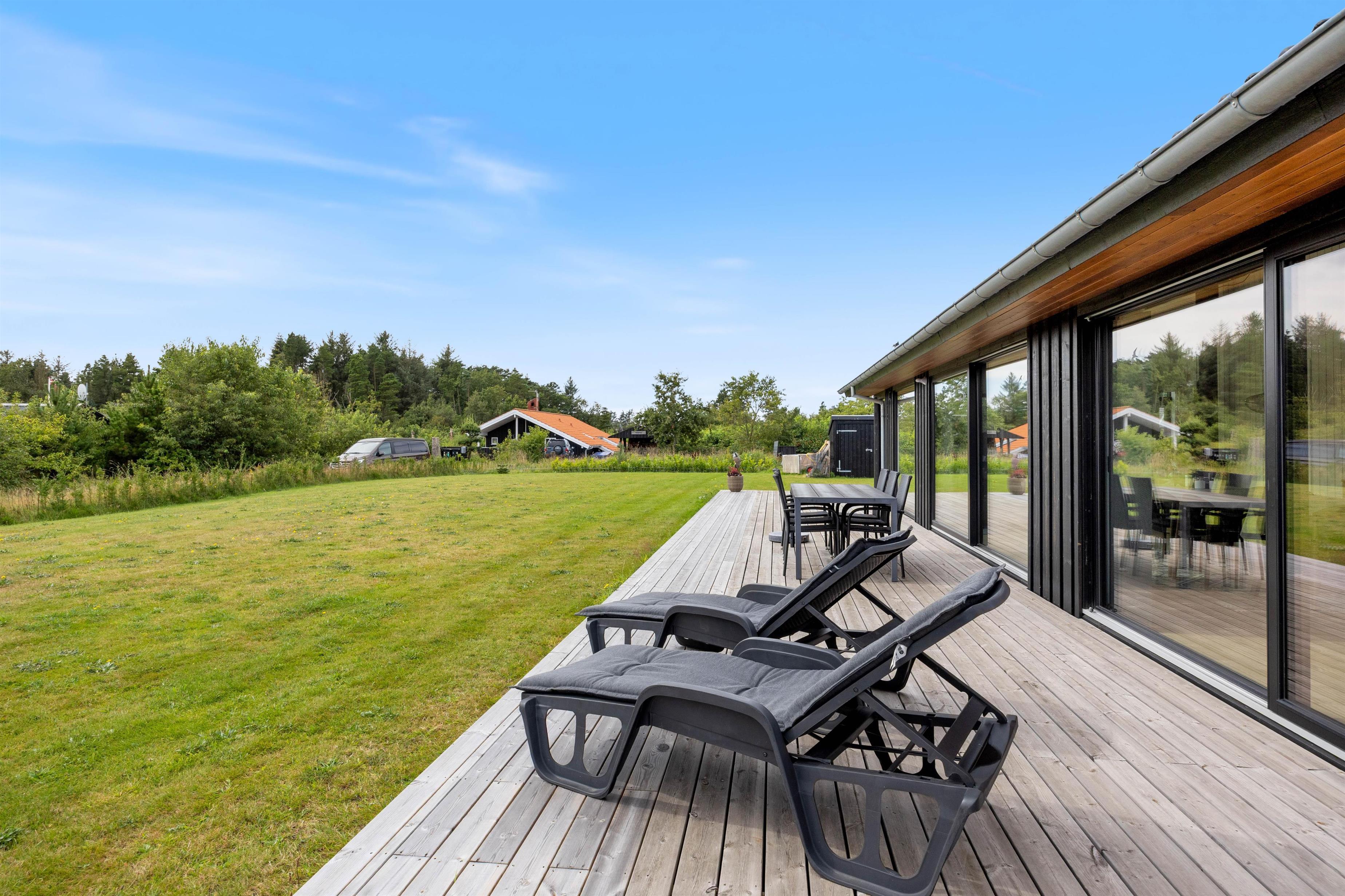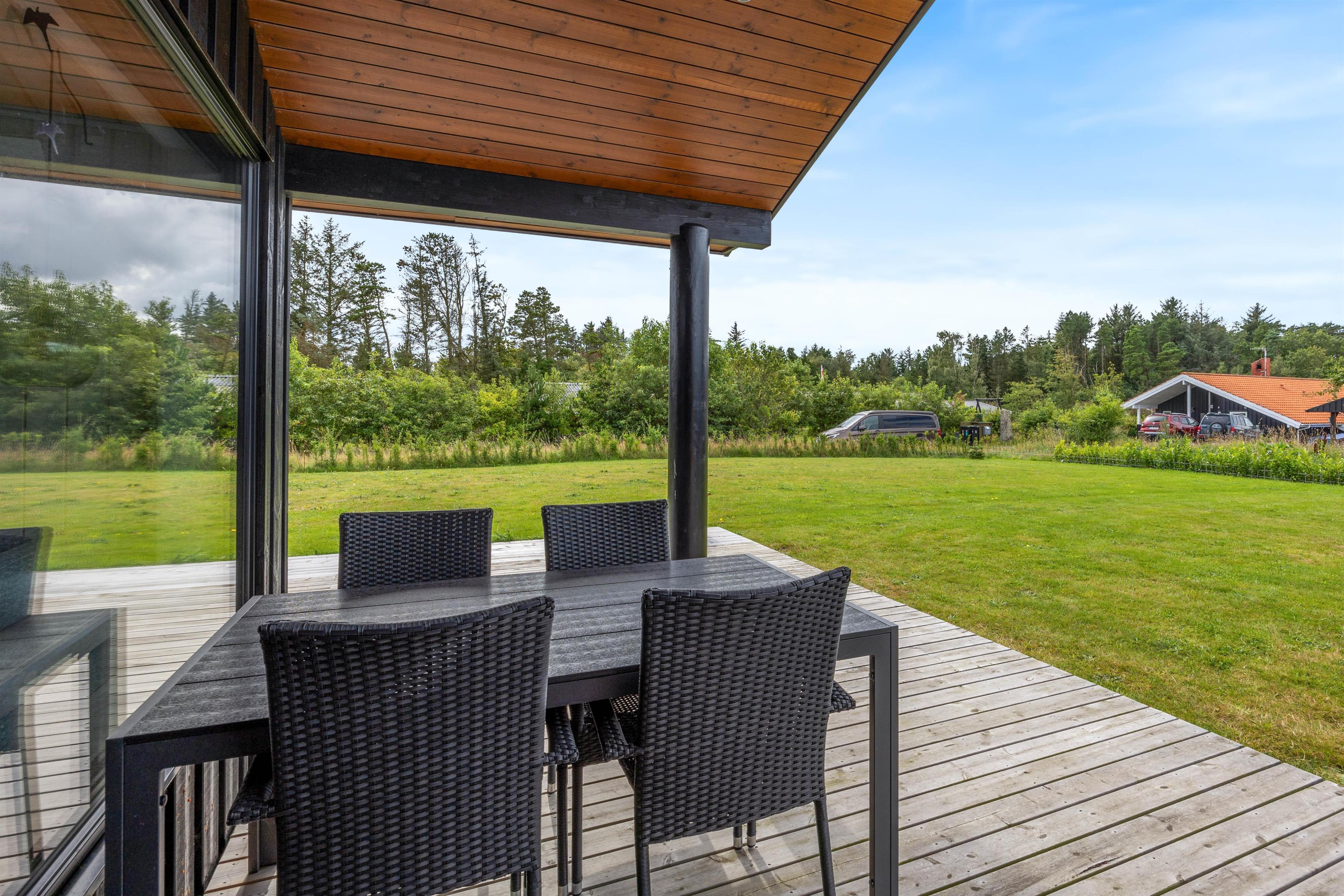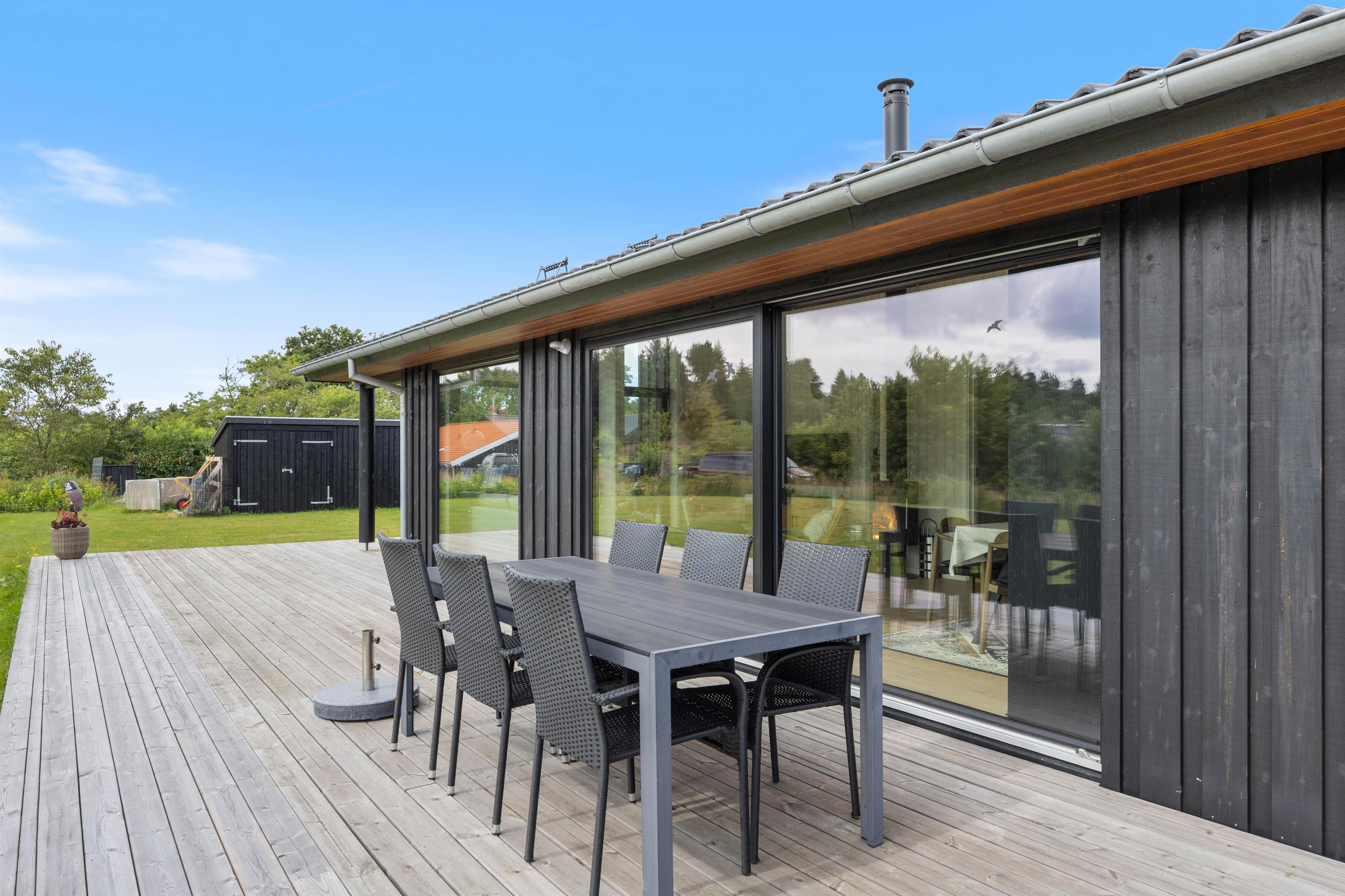 Fra sommerhusets stue er der direkte adgang til den flotte og gennemførte træterrasse, som inviterer til mange gode timer i den friske luft, hvor I kan slappe af i sommerhusets komfortable havemøbler og liggestole.