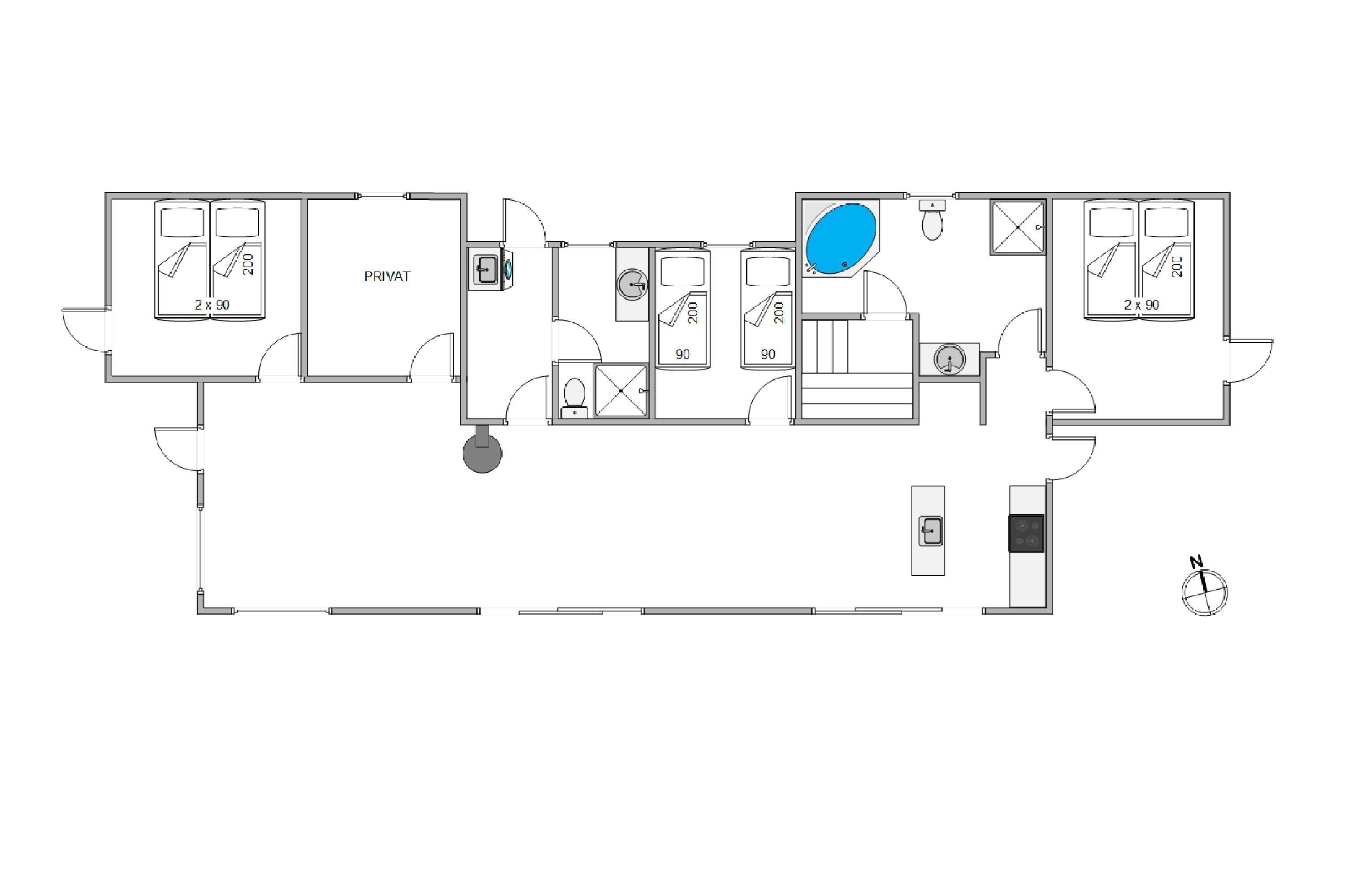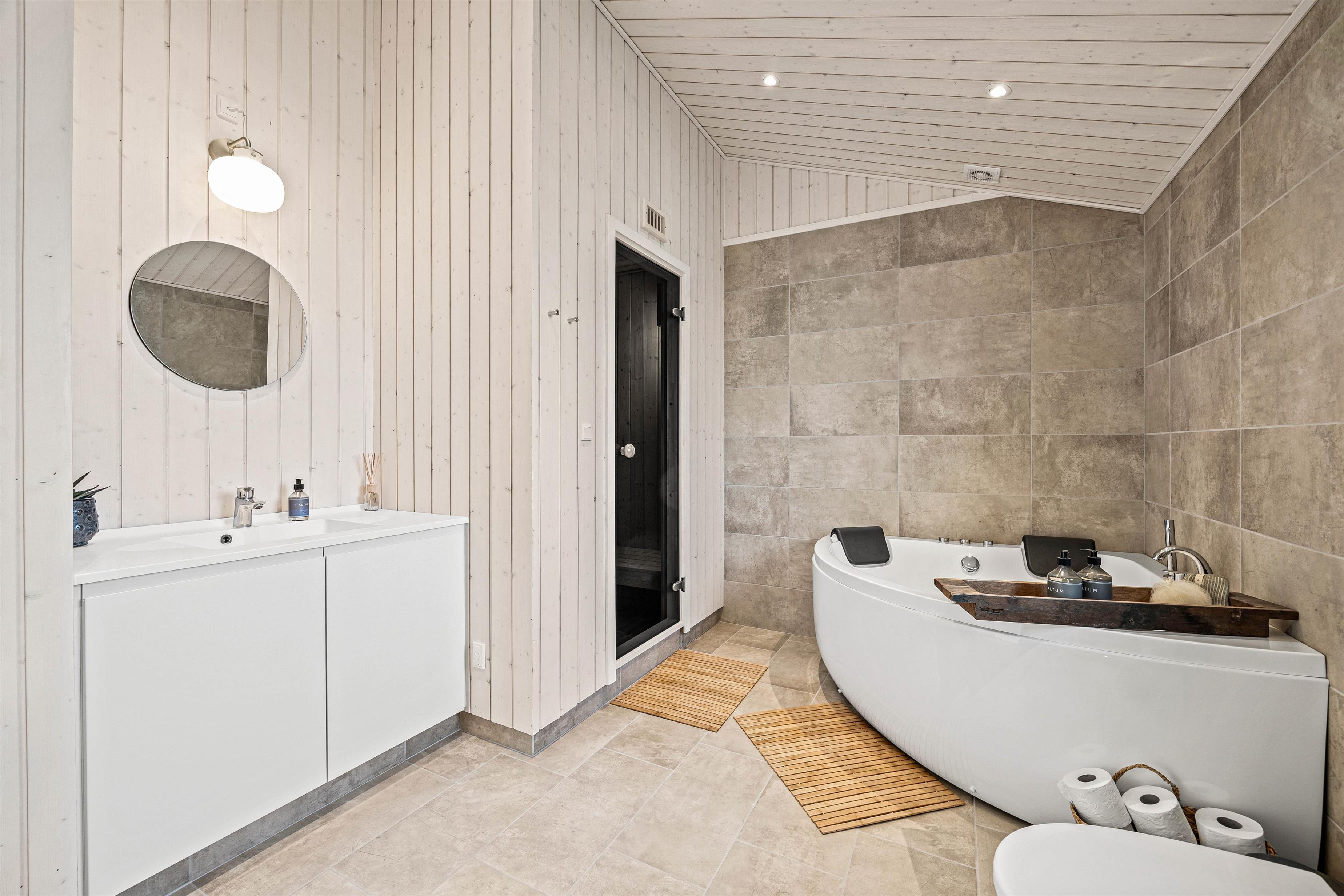Dette skønne sommerhus er udstyret med 2 velindrettede badeværelser. Begge har indlagt gulvvarme, som er meget praktisk, især når I er flere medrejsende. På det største badeværelse er der både sauna og et spabad – en yderst skøn wellnessoase, hvor I for alvor kan slappe af og nyde en velfortjent pause fra hverdagen.