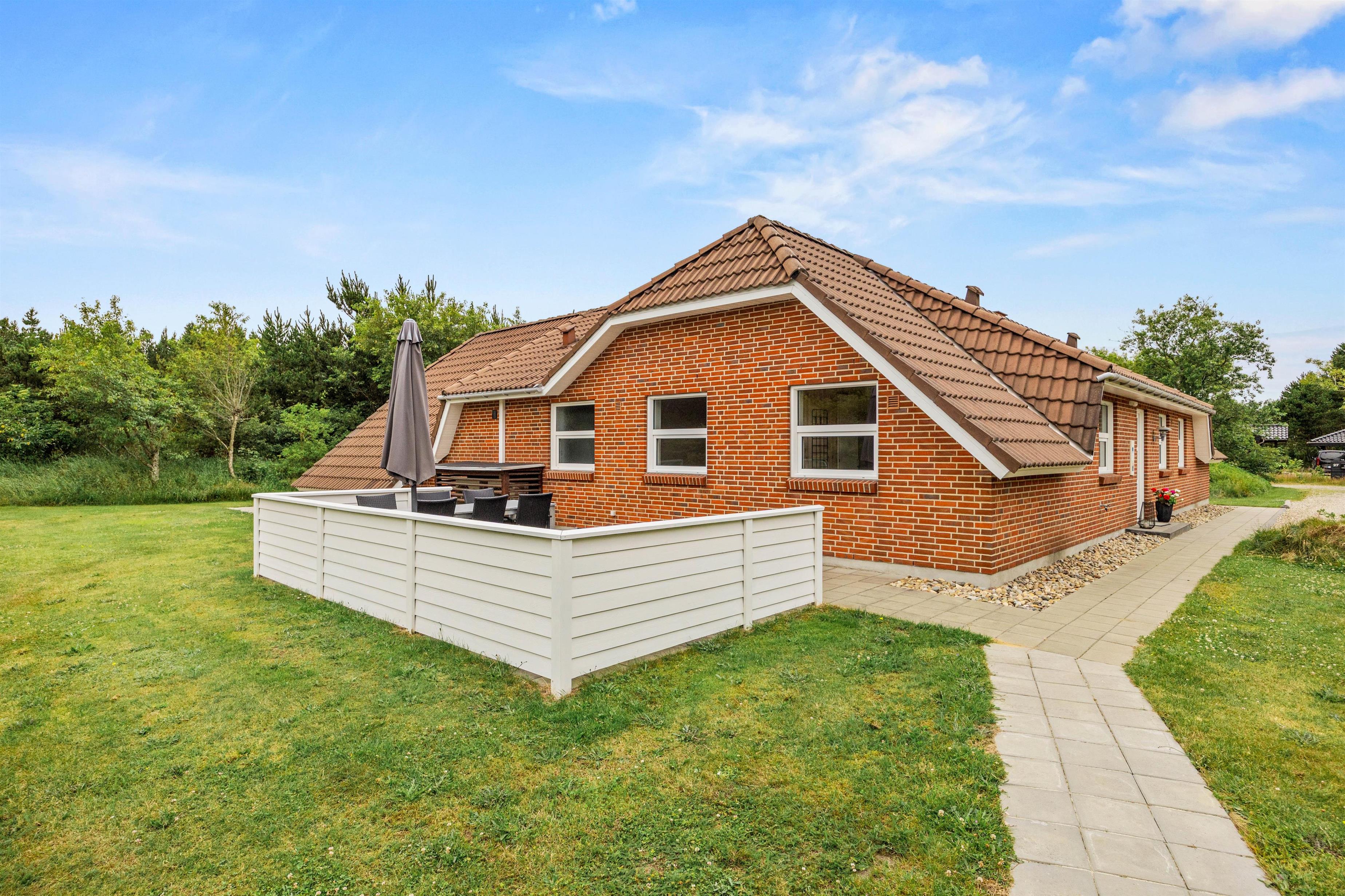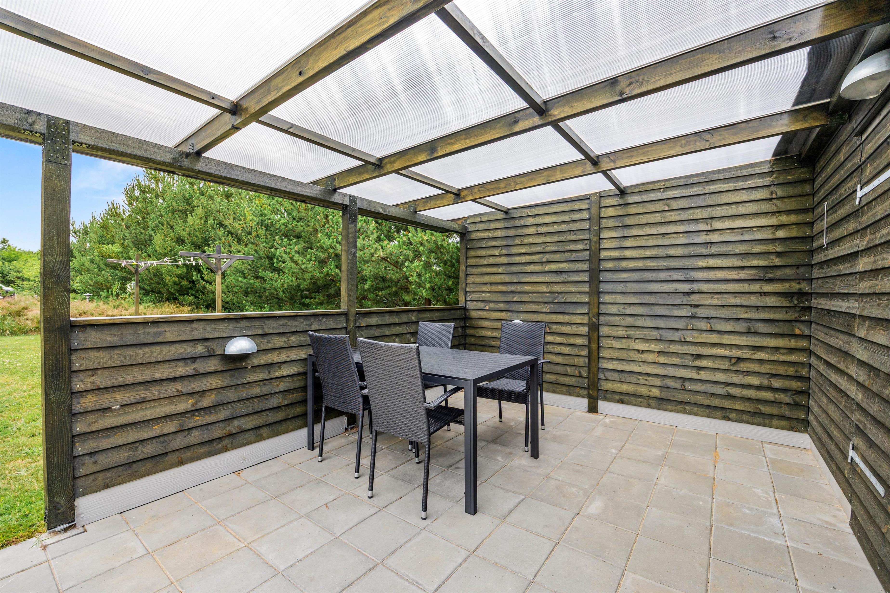 Gennem stuen kommer I ud på den hyggelige terrasse, hvor havemøblerne og grillen er sat frem til at skabe den rette feriestemning. Sommerhuset er omgivet af en stor grøn græsplæne, hvor børnene kan slå sig løs ved at gynge, sandkasse og fodboldmål, mens I slapper af i solen.