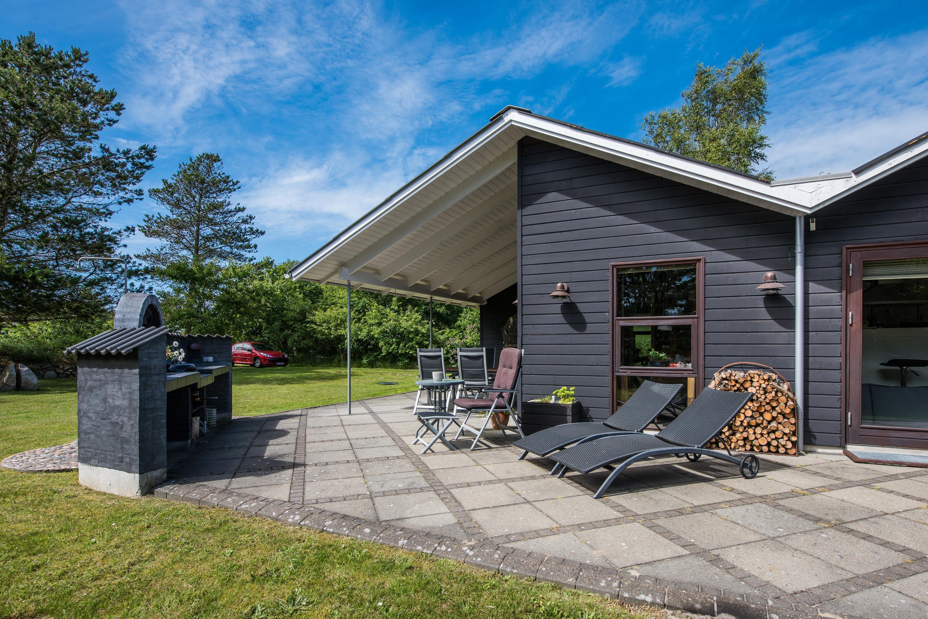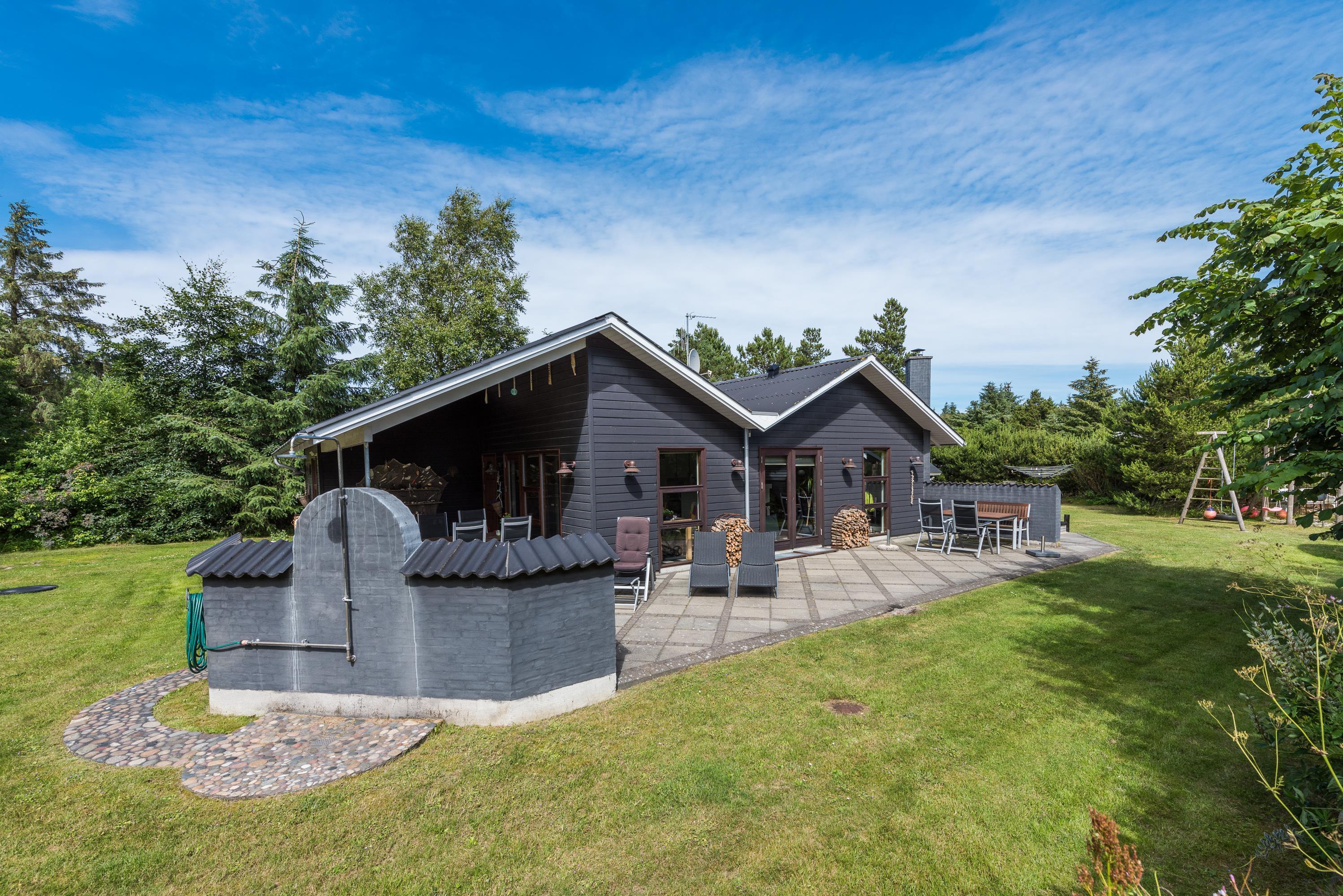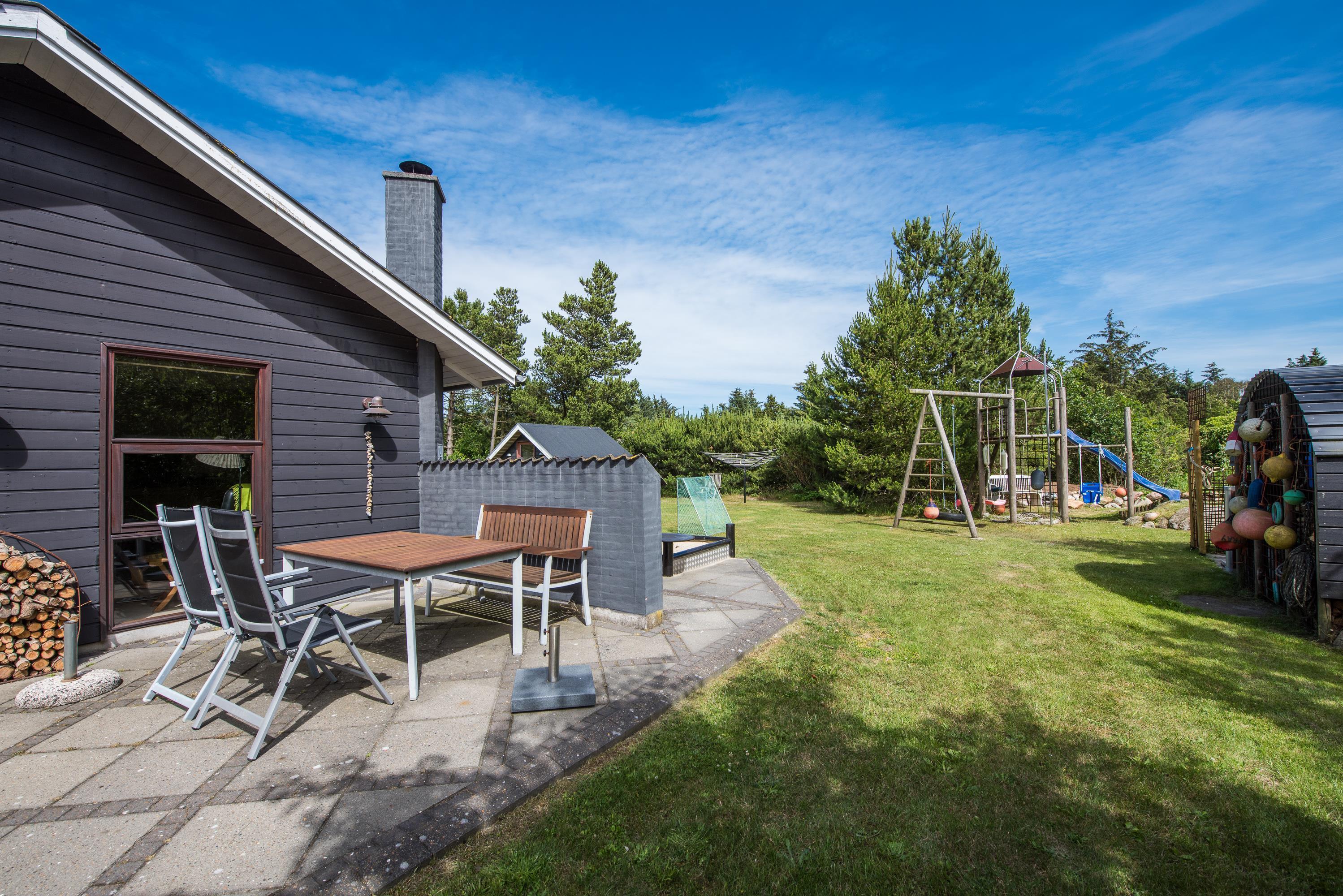 På Hyttestien 2 i Henne vil I rigtigt kunne nyde udelivet. Her er skabt et ægte terrassemiljø, men både en overdækket- og afskærmet del, - i udekøkkenet kan I sikkert trylle alverdens lækre grillretter og salater imens børnene hygger sig med fodboldspil, på gyngerne, i sandkassen eller hopper om kap på trampolinen.