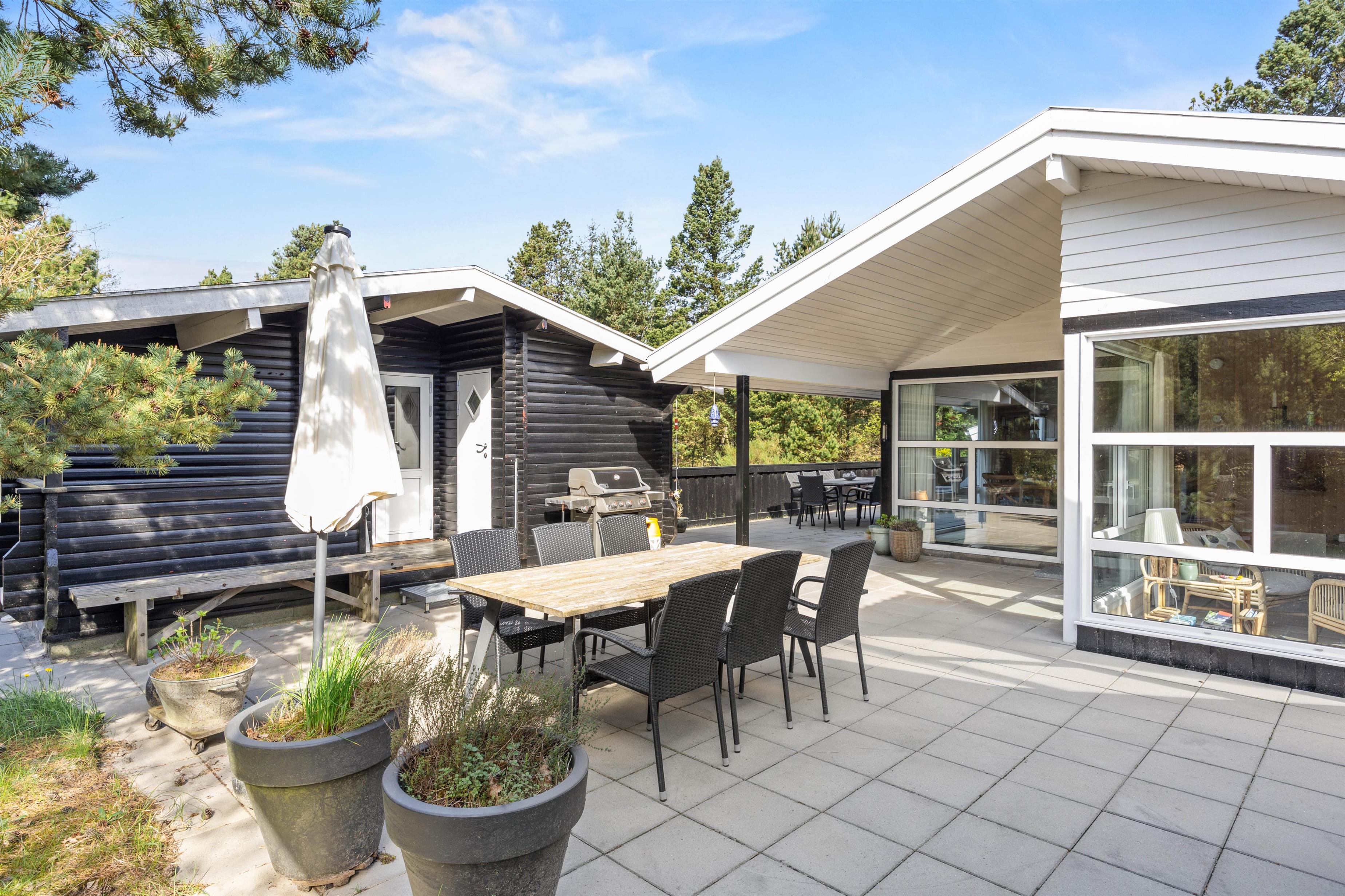 Mod vest er terrassen, hvor I hvor man rigtig kan nyde udelivet. Her, bag fyrretræerne, er I godt afskærmet for vind og de omkringliggende naboer. Udenfor finder I en udebruser, hvor I kan skylle tæerne efter en tur ved vandet. Udover den store græsplæne gemmer her sig også en overraskelse til børnene; nemlig en sandkasse og en trampolin, hvor der kan hoppes løs.