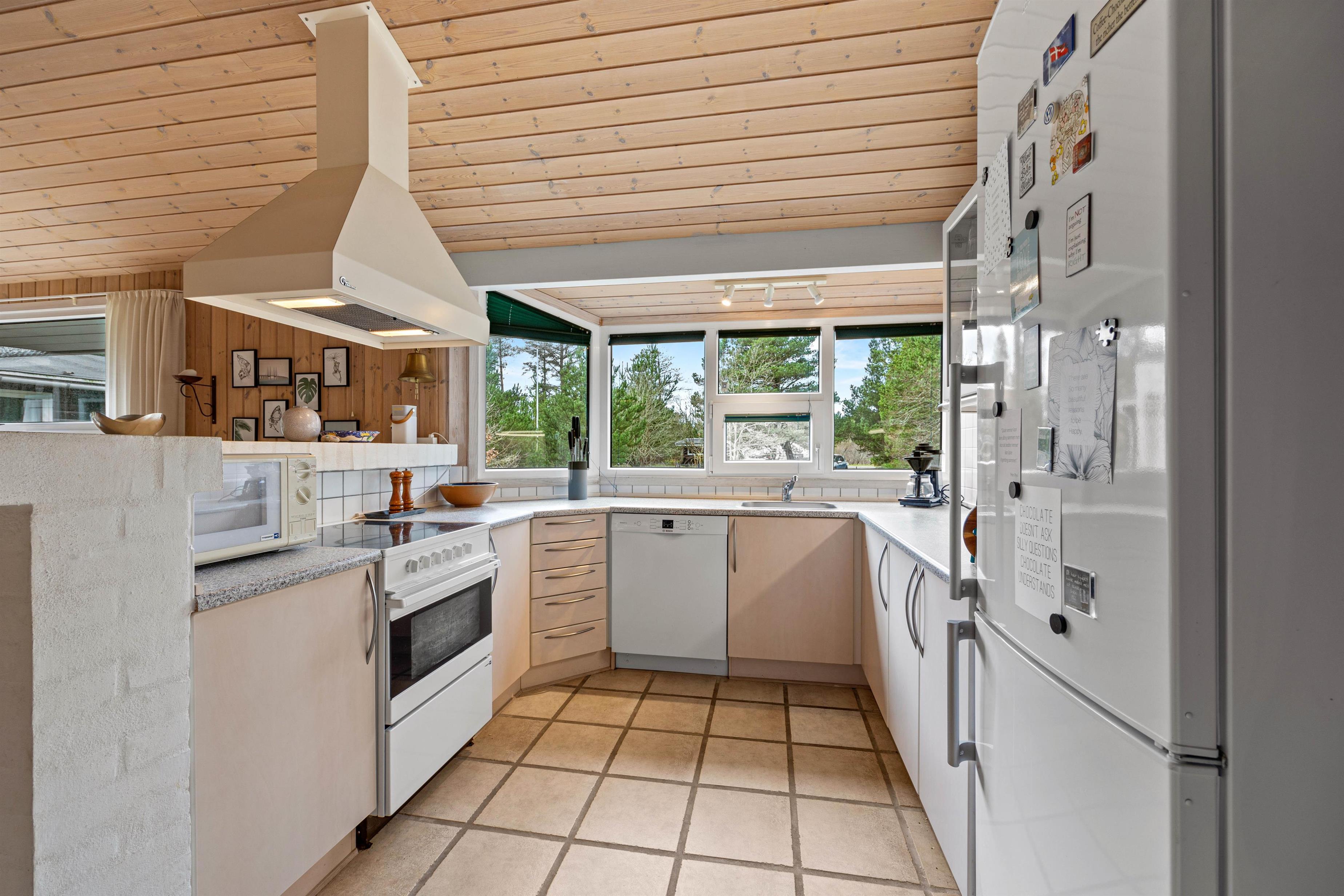 Samlingspunktet bliver uden tvivl det lyse opholdsrum, som er forbundet med køkkenet. Her er træpaneler, god loftshøjde samt nogle store vinduer, der lukker dagslyset ind. Her er en rar atmosfære og plads til det hele. I den fine køkkenafdeling kan I sammen lave dejlig mad, og efterfølgende lade opvaskemaskinen klarer arbejdet for jer. Imens kan I bevæge jer mod stuen. Fra alrummet er der et enkelt trin ned i stuen, hvor komfortable møbler indbyder til afslapning - evt. med en god bog og kop kaffe eller en hyggelig film, som kan streames vha. et Chromecast. Brændeovnen kommer jer til undsætning på de køligere og regnfulde aftner.