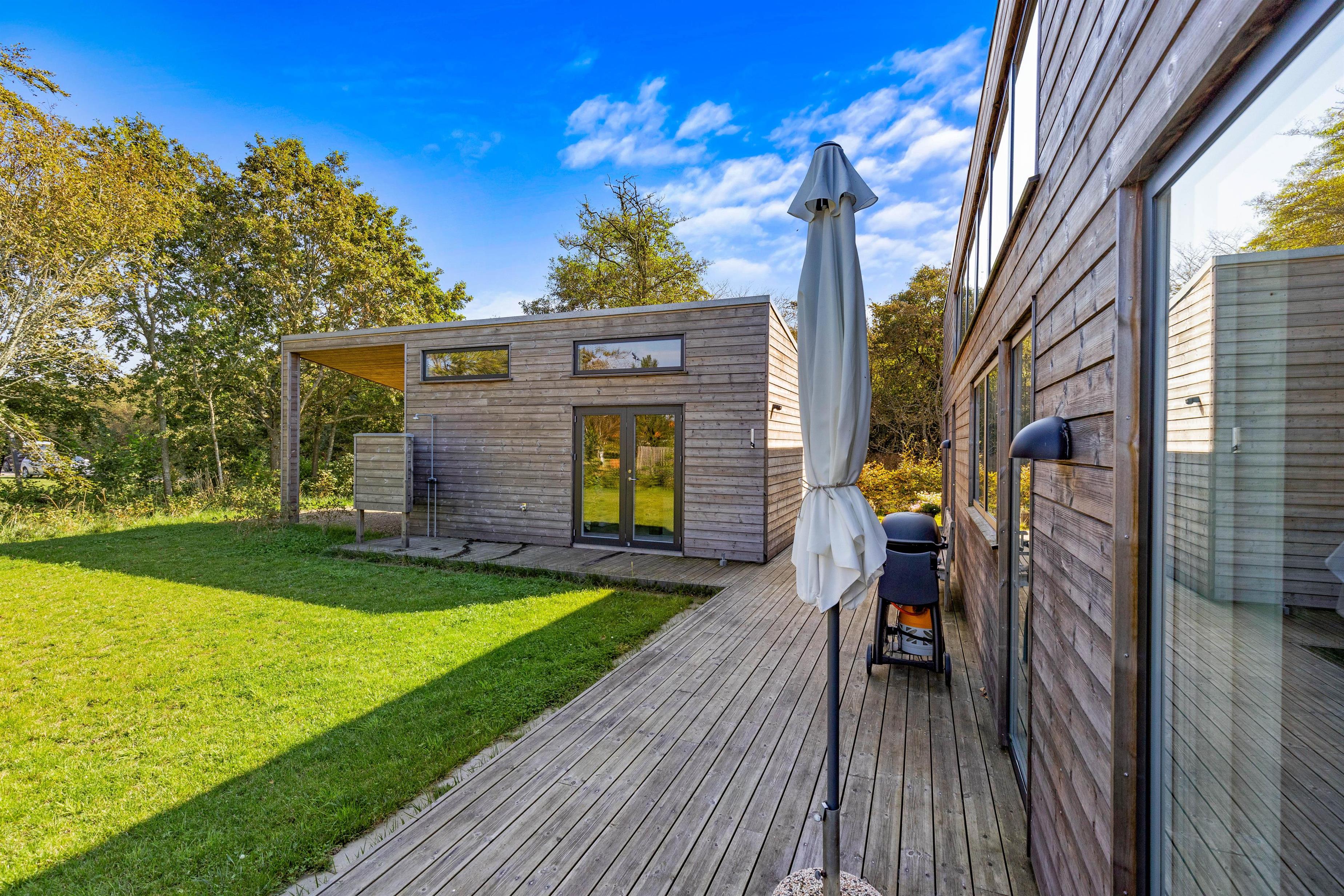 Den skønne terrasse foran feriehuset indbyder til masser af udeliv. Den delvis overdækkede terrasse forlænger udesæsonen og gør, at I også kan nyde den friske luft og naturen over en kop kaffe i knapt så godt vejr, imens I læner jer tilbage i feriehusets komfortable havemøbler. Og skulle det blive for varmt. kan I blot tage ne tur under feriehusts udebruser*.