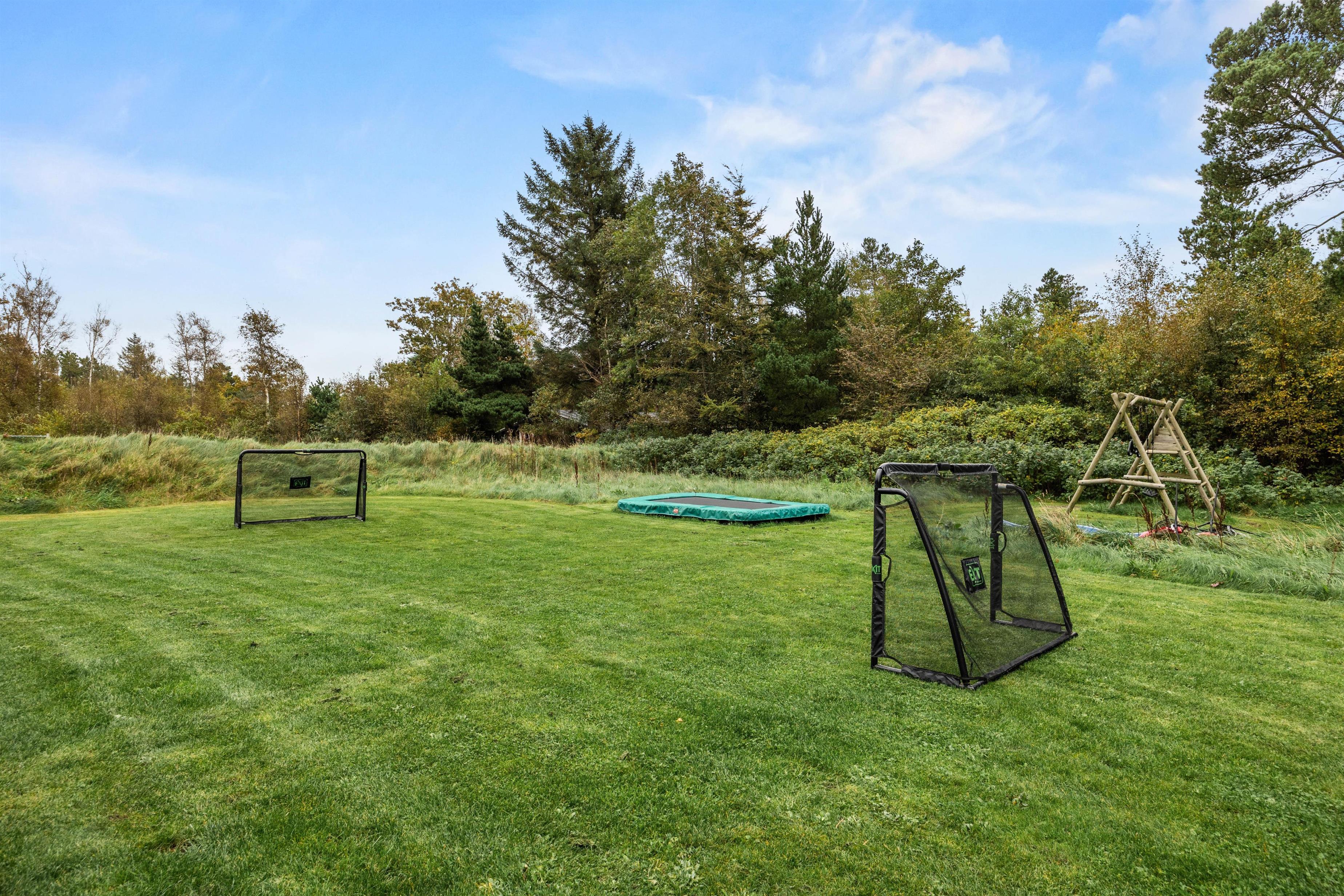 På den 1752 kvadratmeter store naturgrund er der rigelig plads til at boltre sig på udendørs - med gynger, trampolin og en sandkasse er der plads til leg for de mindste. Ejendommen grænser op til et grønt område og en skov, hvor I kan gå en god tur.