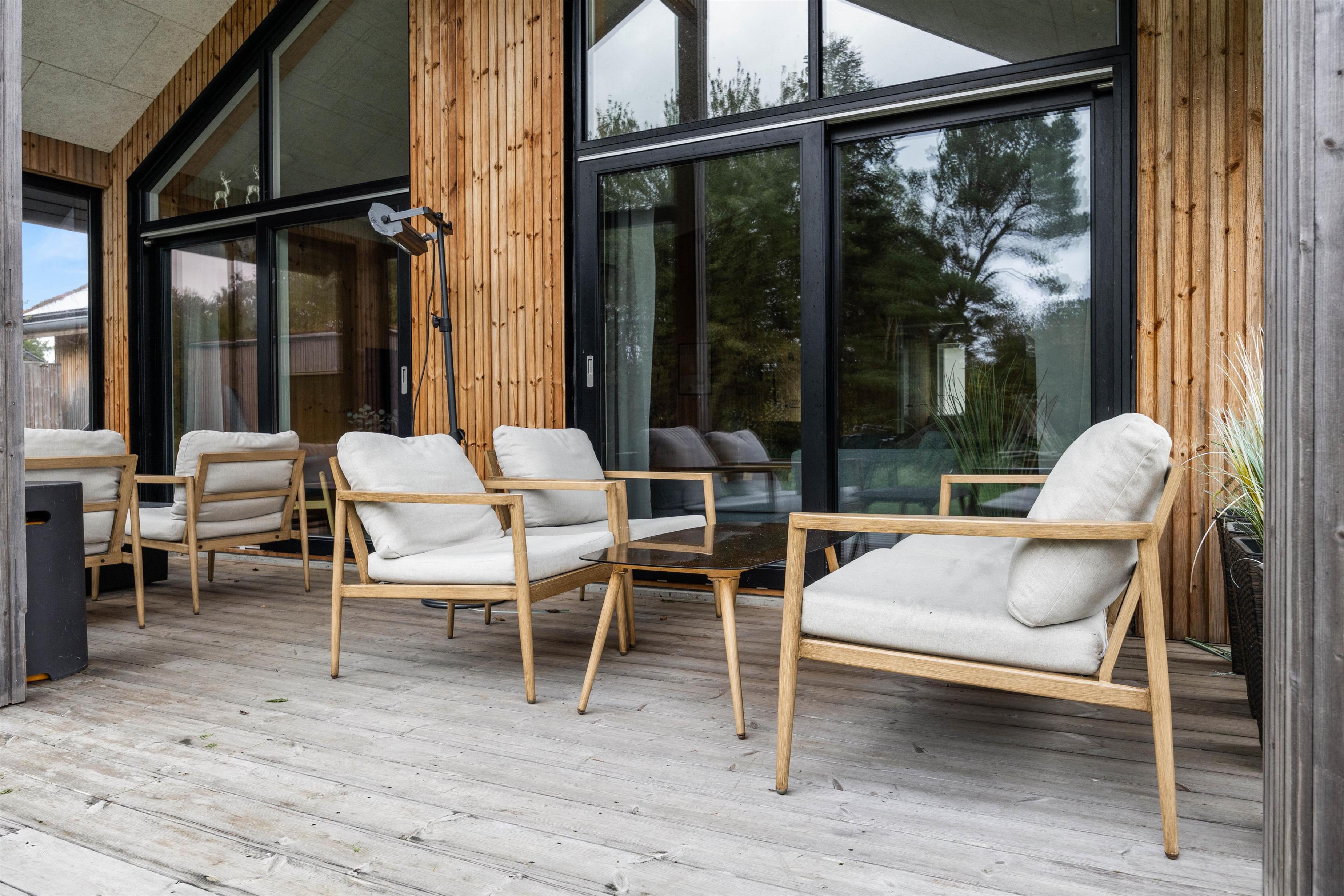 I sommerhusets baghave finder I terrassen og udekøkkenet. Her kan I lave mad under åben himmel og benytte jer af sommerhusets grill. Der er både havemøbler og solvogne, så I kan slappe af i solen - eller finde et sted i læ. En udendørs bruser* sørger for, at I kan få et forfriskende skyl under åben himmel.