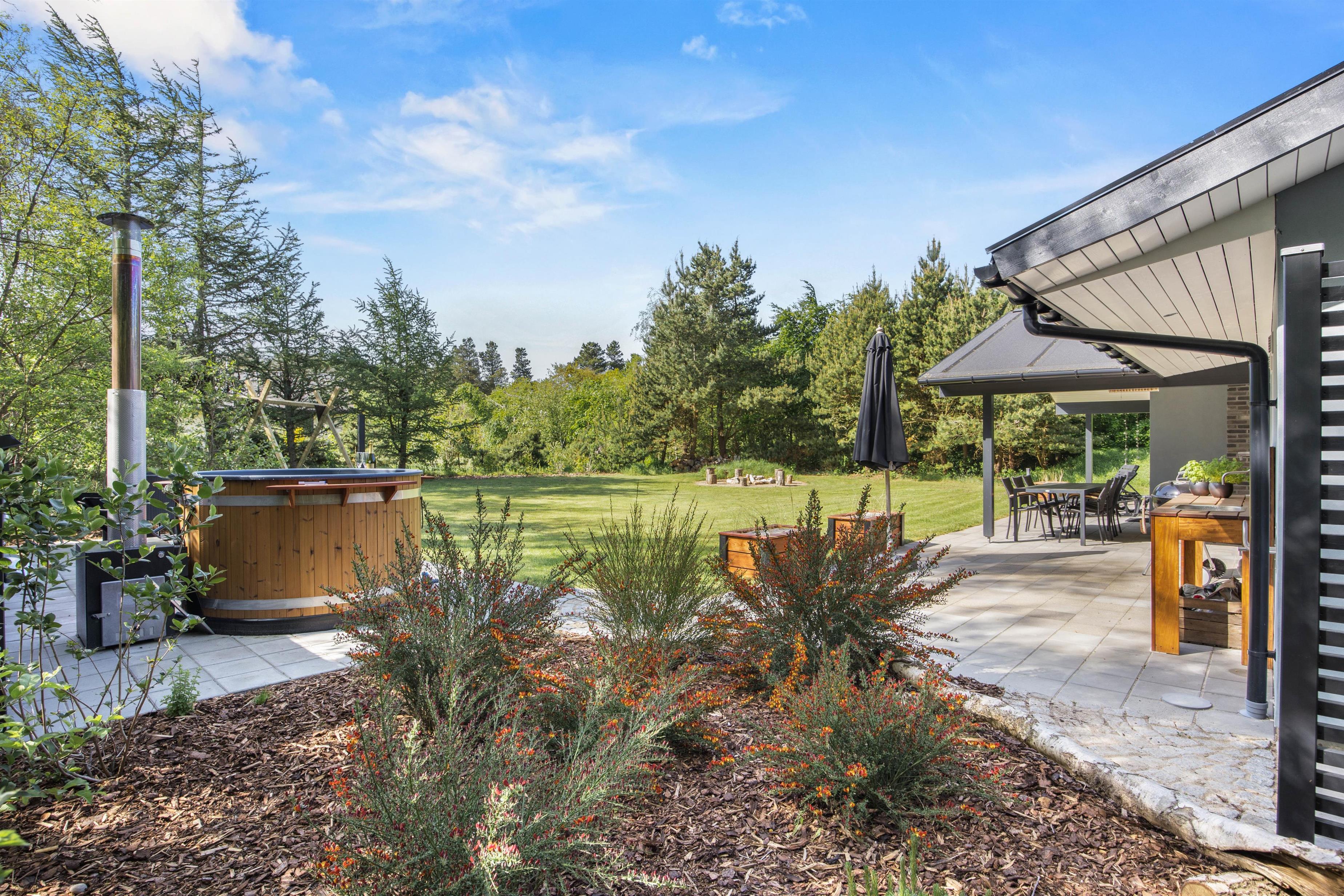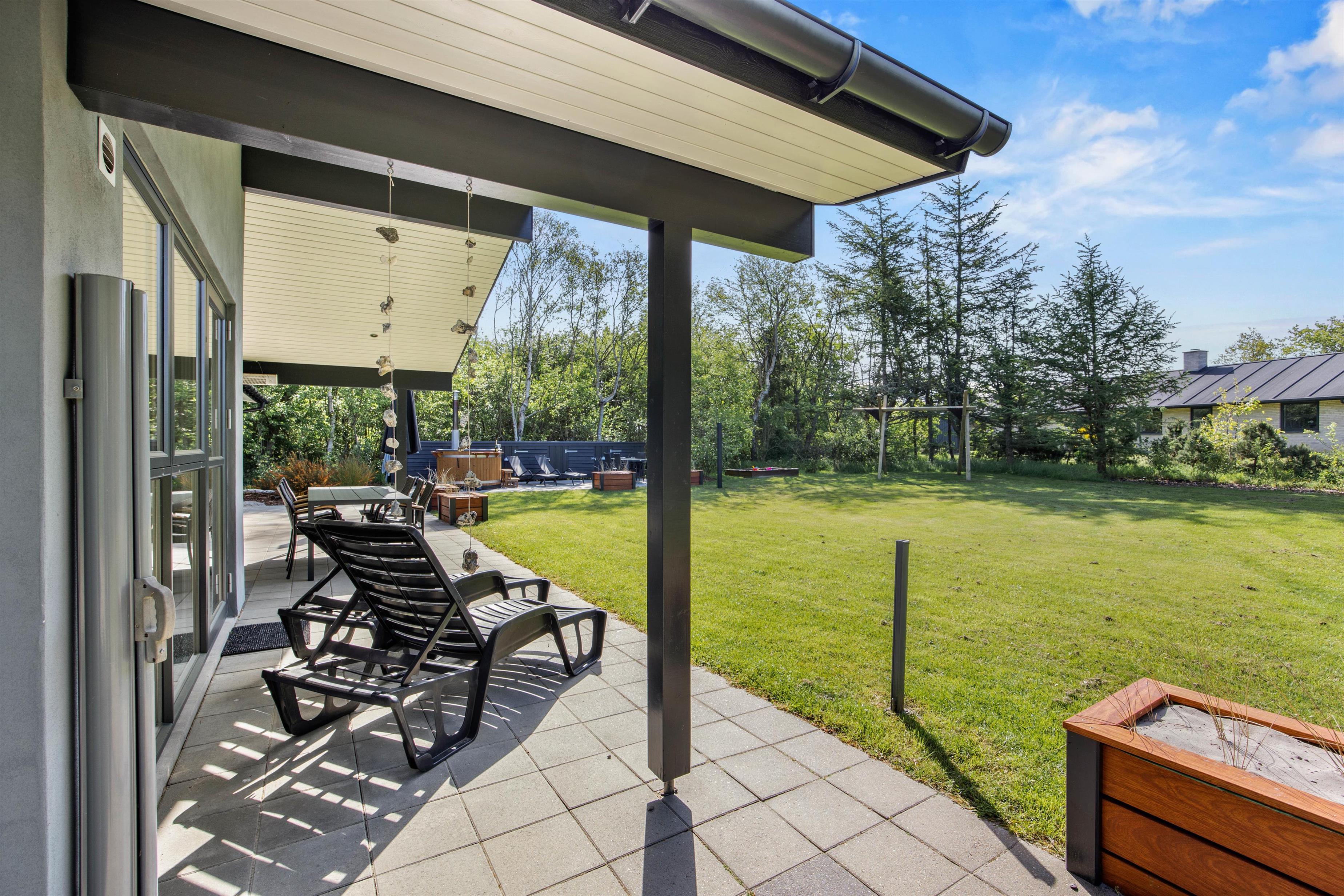Mens børnene leger, gynger og bygger sandslotte i haven, kan de voksne slappe af på terrasserne. De skønne store terrasser er klar til alle slags udendørs hygge – her kan der både laves mad ved det dejlige udekøkken og slappes af. Under den delvist overdækkede terrasse kan I sætte jer til rette, når der er brug for skygge eller læ.