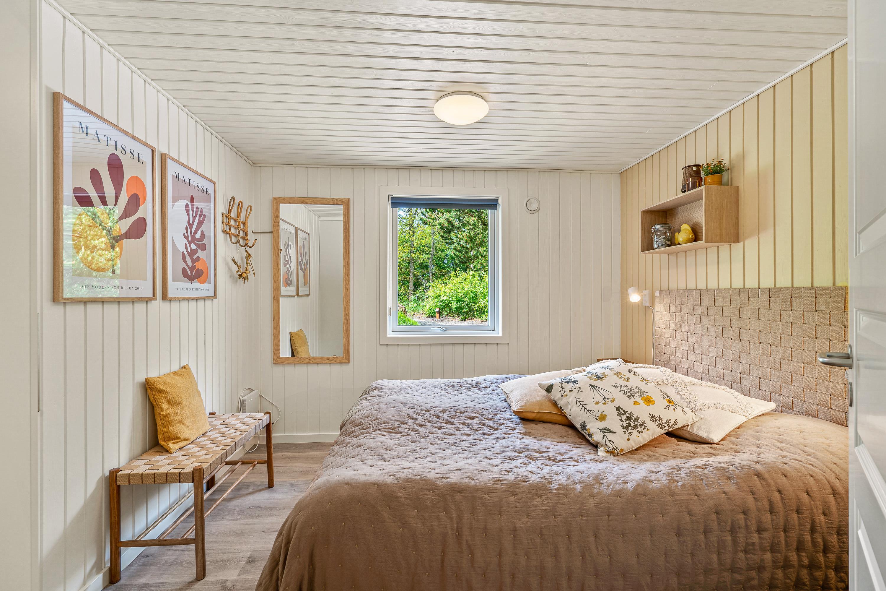 Sommerhusets sovepladser fordeles over 3 gode soveværelser. 2 af soveværelserne er indrettet med én dobbeltseng hver, mens det tredje soveværelse har 2 enkeltsenge.