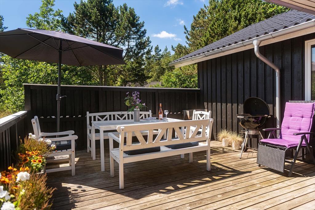 Opholdsafdelingens terrassedøre gør det nemt at smutte ud i det fri, når vejret viser sig fra sin smukkeste side. Står du tidligere op end resten af familien, kan du tage en kop kaffe med ud på den østvendte del af terrassen – og hvis du sidder her stille nok, vil du måske endda kunne se rådyr eller egern kigge forbi naturgrunden i morgengryet. Den vestvendte terrasse er delvist overdækket, så selv hvis en lille sommerbyge skulle passere forbi, er det muligt at blive udenfor. På naturgrunden har du og familien masser af plads til fodbold og havespil på græsplænen, og de yngste feriegæster vil sikkert elske gyngestativet og sandkassen.