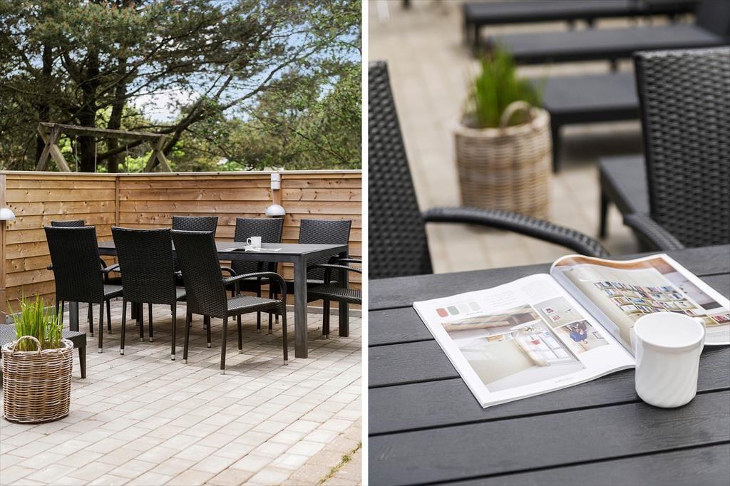 Terrassen er det perfekte sted, hvis du vil fordybe dig i en spændende krimi, drikke en kop kaffe til lyden af fuglesang eller bare slappe af og lade tankerne flyve. Et plankeværk skærmer opholdsmiljøet godt af, og der er både solrige og skyggefulde opholdspladser at vælge imellem. Under halvtaget er der etableret et simpelt udekøkken, som du kan benytte, når du vil forkæle familien med et nygrillet aftensmåltid – og hvis du har været ude på fisketur, er det måske også her, du skal rense din fangst. Omgivelserne er rolige og ugenerede, og også når du leger med børnene, er det herligt at være omgivet af naturgrundens smukke træer.