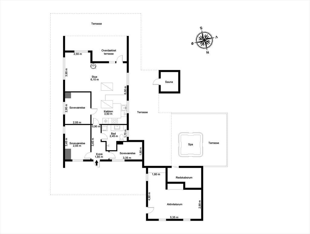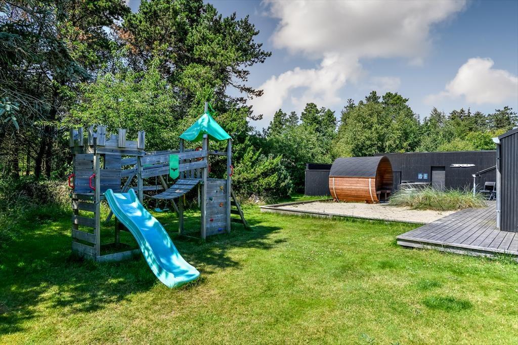 Den lukkede grund omkring sommerhuset skaber en privat oase, hvor du kan nyde udendørs livet i fulde drag. Det udendørs wellnessområde er en ægte perle, hvor du kan forkæle dig selv i det varme udespa og få en afslappende saunaoplevelse, alt imens du nyder udsigten til den omkringliggende natur. Den store terrasse er ideel til lange, solrige dage, hvor du kan slappe af i loungemøblerne, grille lækre måltider eller bare lade feriefreden sænke sig over dig. Børnene kan lege frit i klatretårnet, eller på den velholdte græsplæne, som er perfekt til både leg og afslapning.