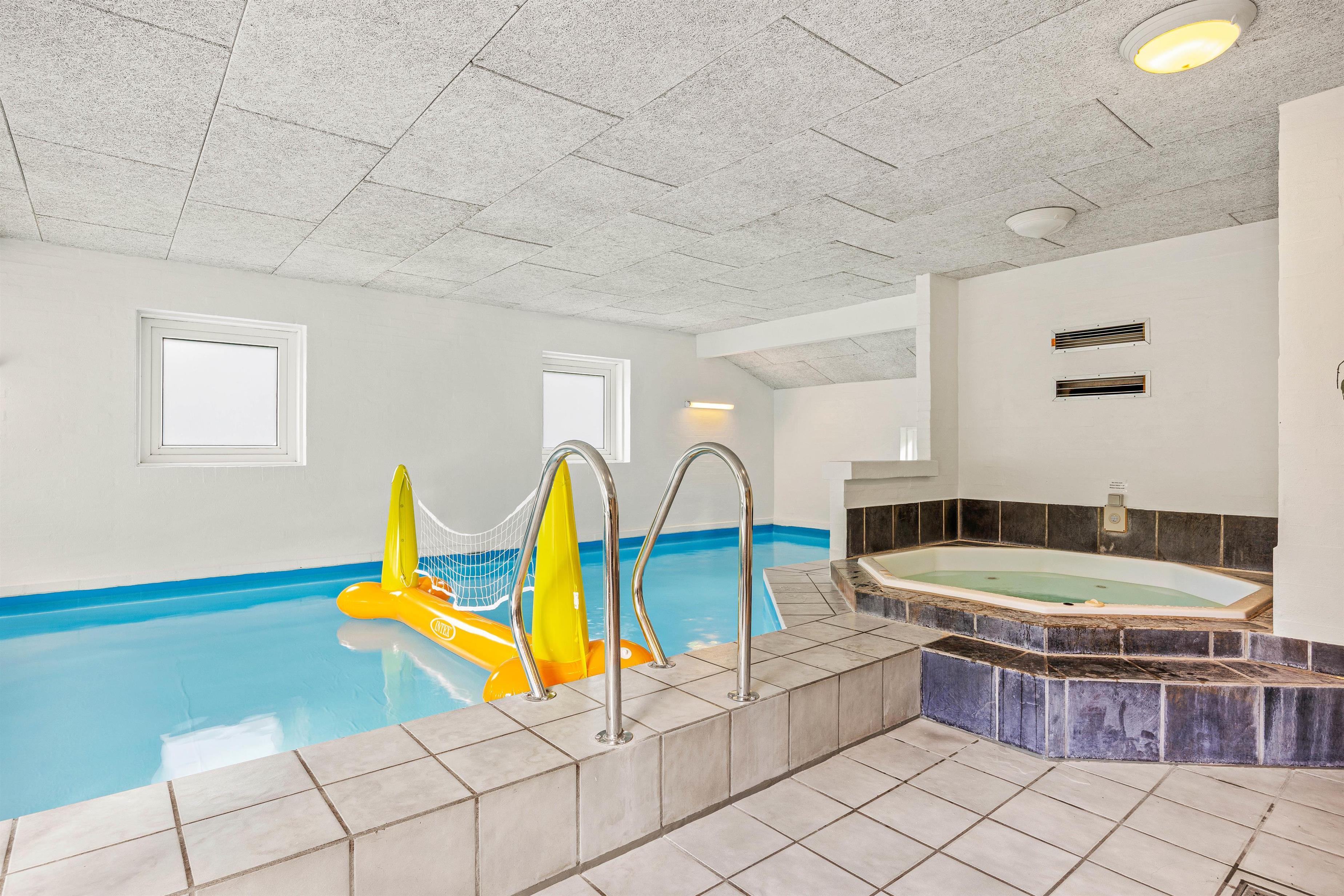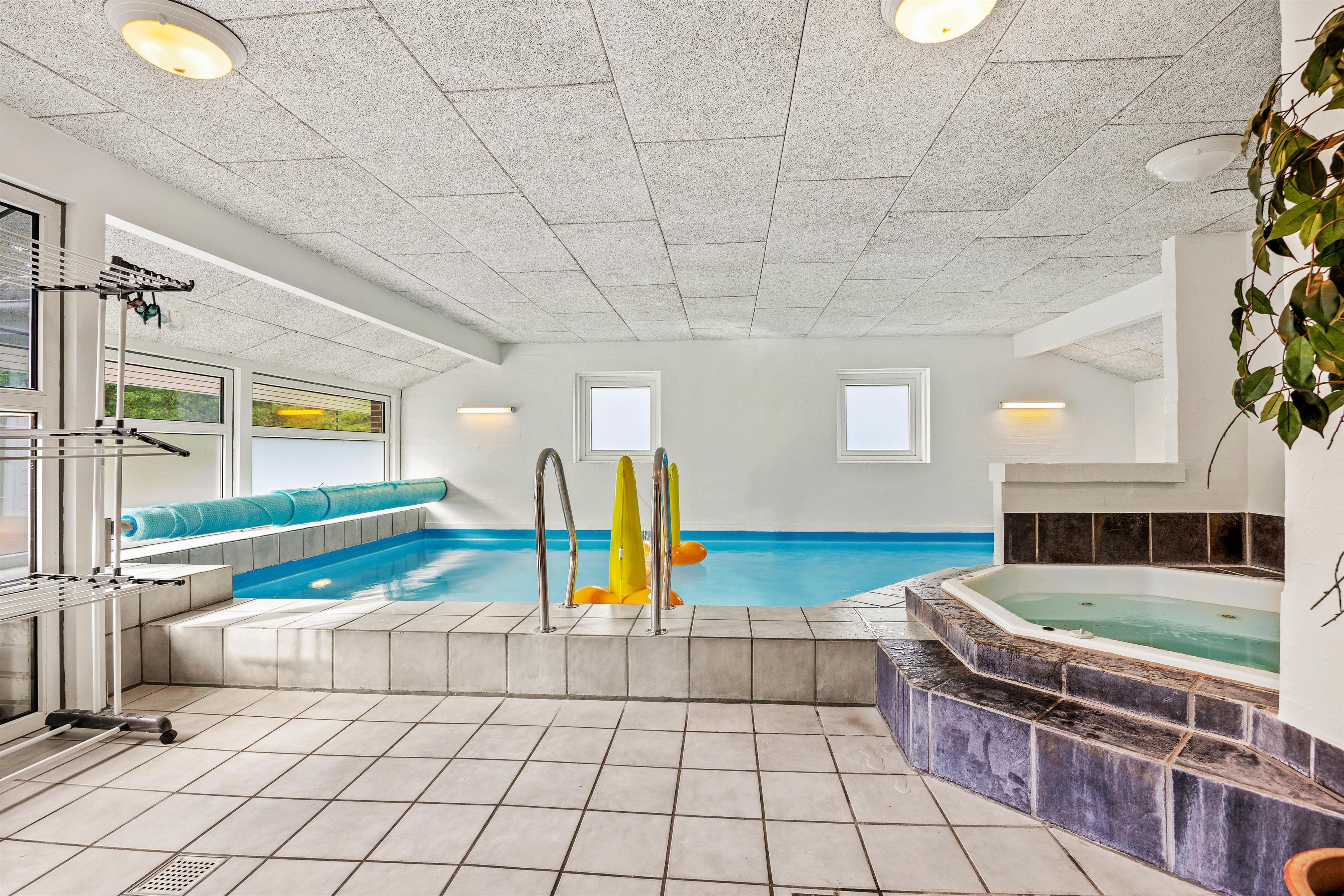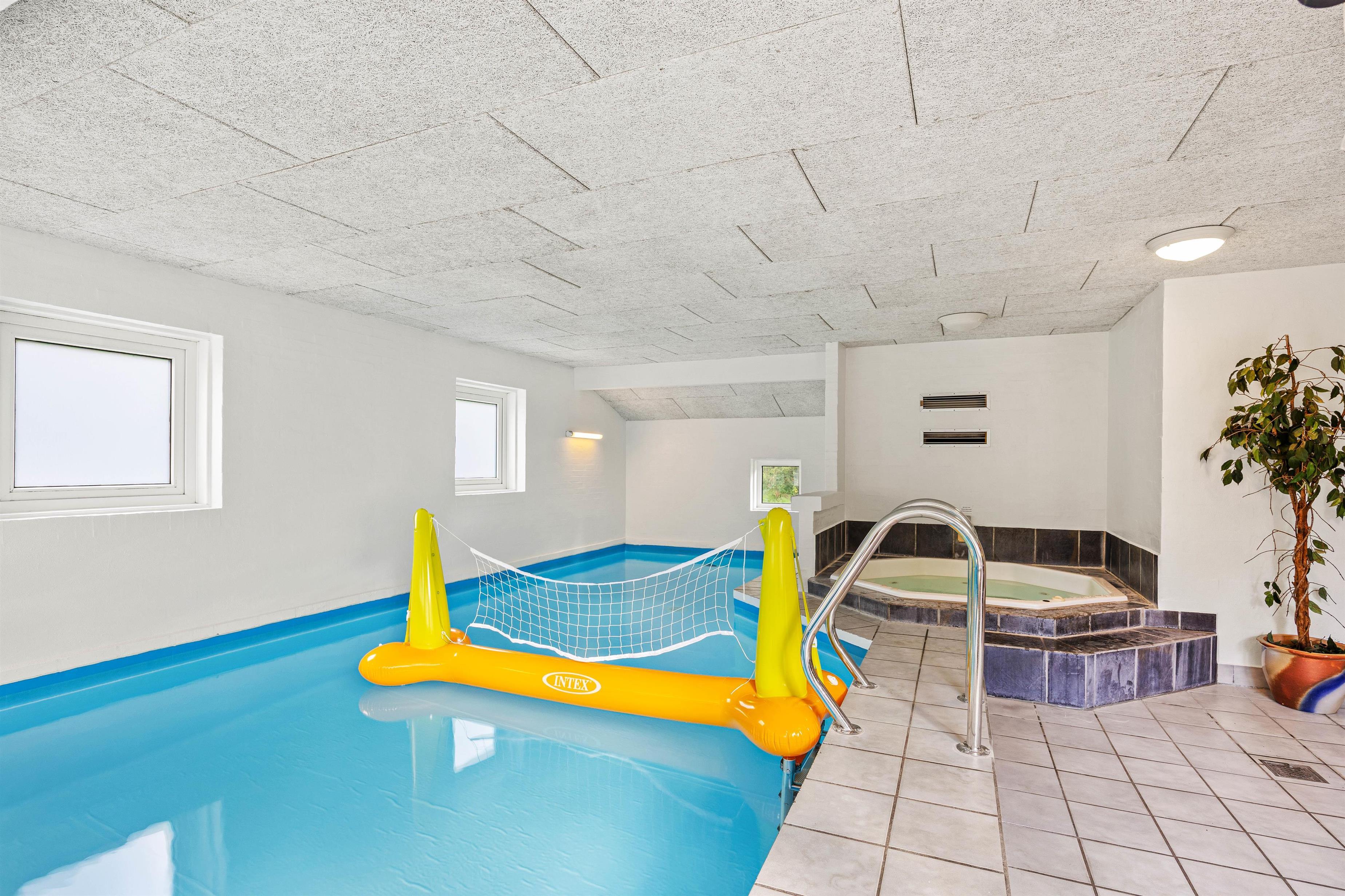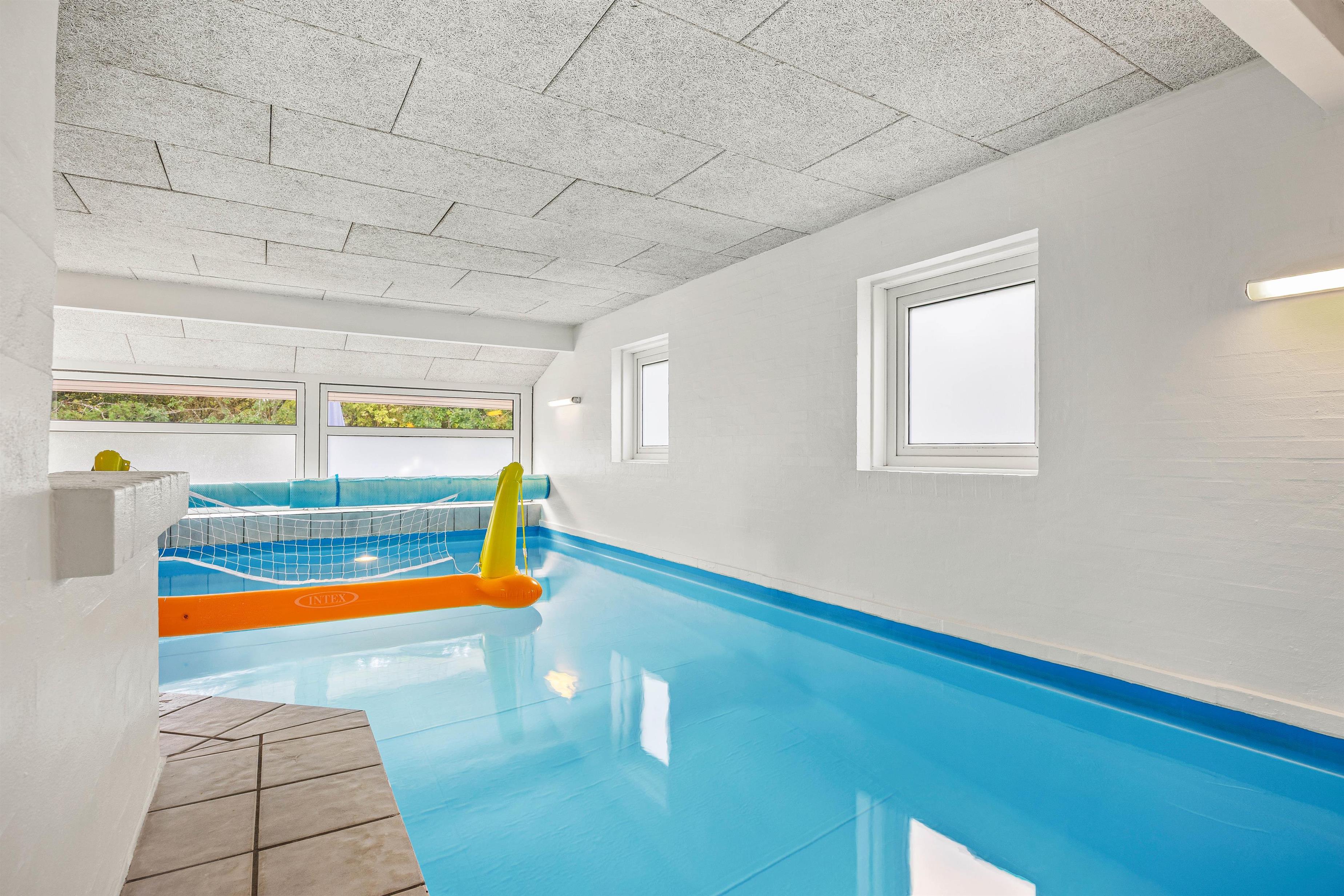 Højdepunkterne for dette dejlige feriehus er det det opholdsrum, hvor stue og køkken er i åben forbindelse, og selvfølgelig poolrummet. Her er den 23 m2 store swimmingpool samt spa og sauna til afslapning. Her er I sikret mange dejlige stunder uanset vind og vejr – poolen indbyder til både vandplaskeri, boldspil og dykning. Senere kan I alle samles omkring det lange spisebord. Lad opvaskemaskinen klare oprydningen, mens I slænger jer i den komfortable sofa. Pop popcornene, spil brætspil eller se film, mens brændeovnens varme breder sig i rummet.