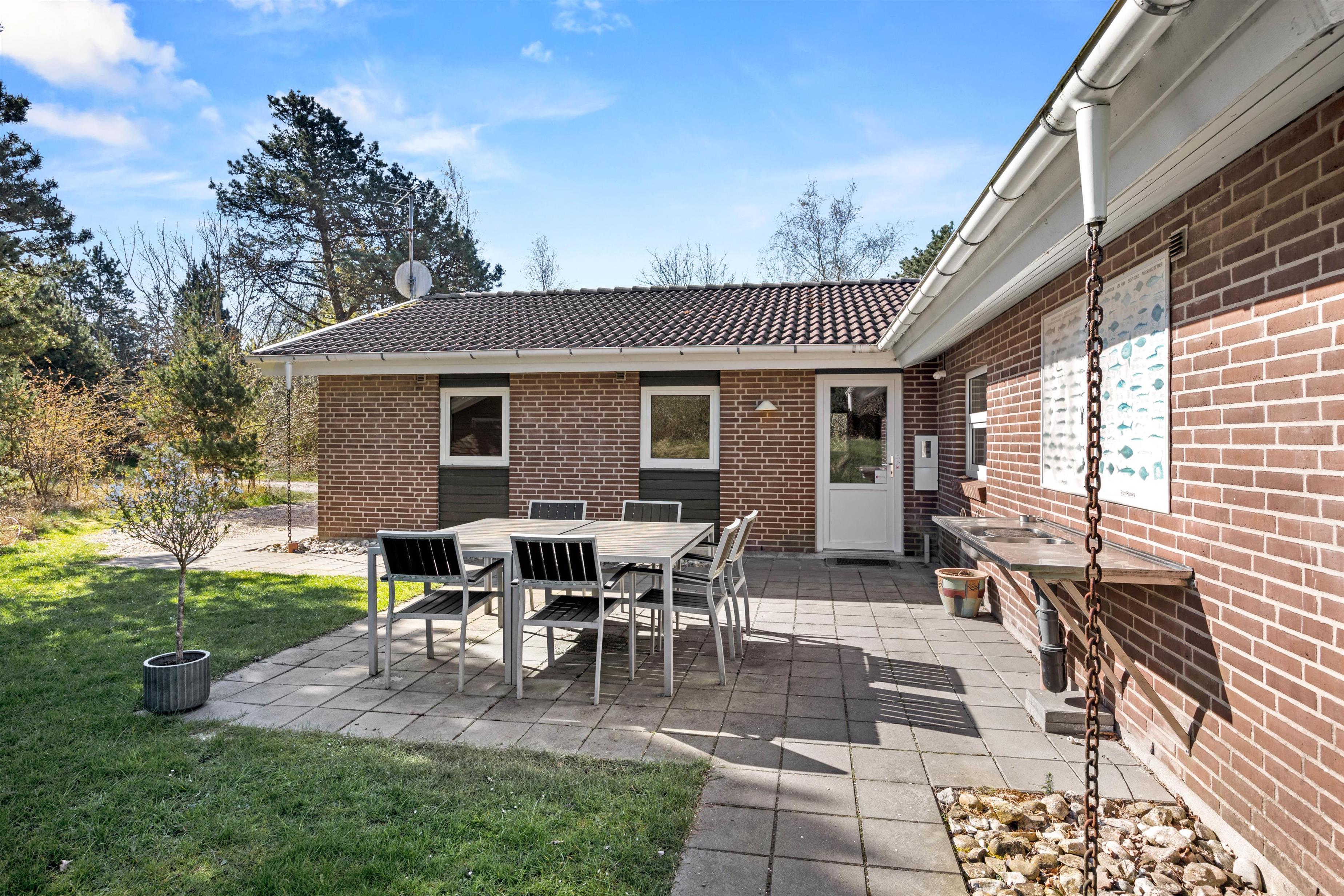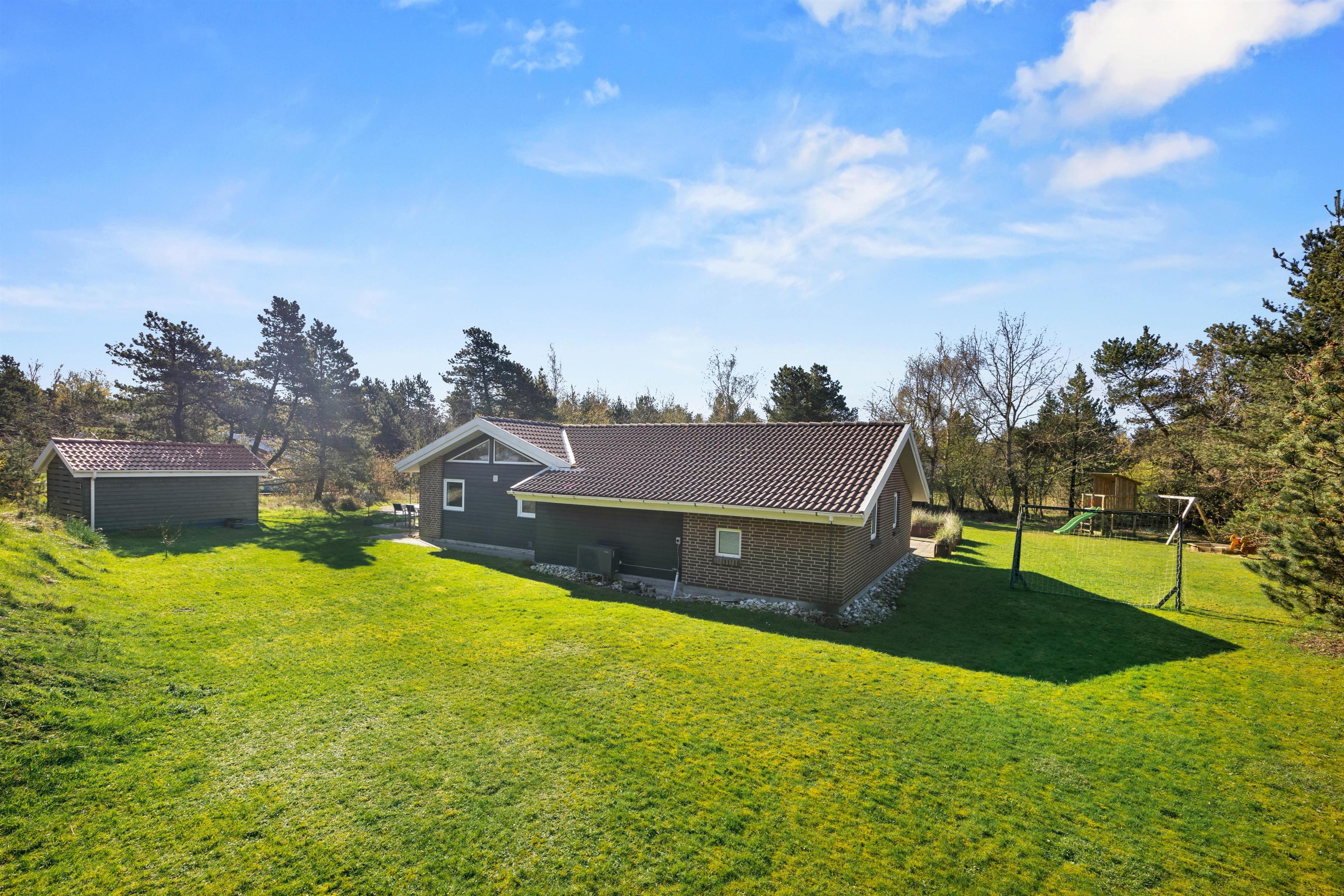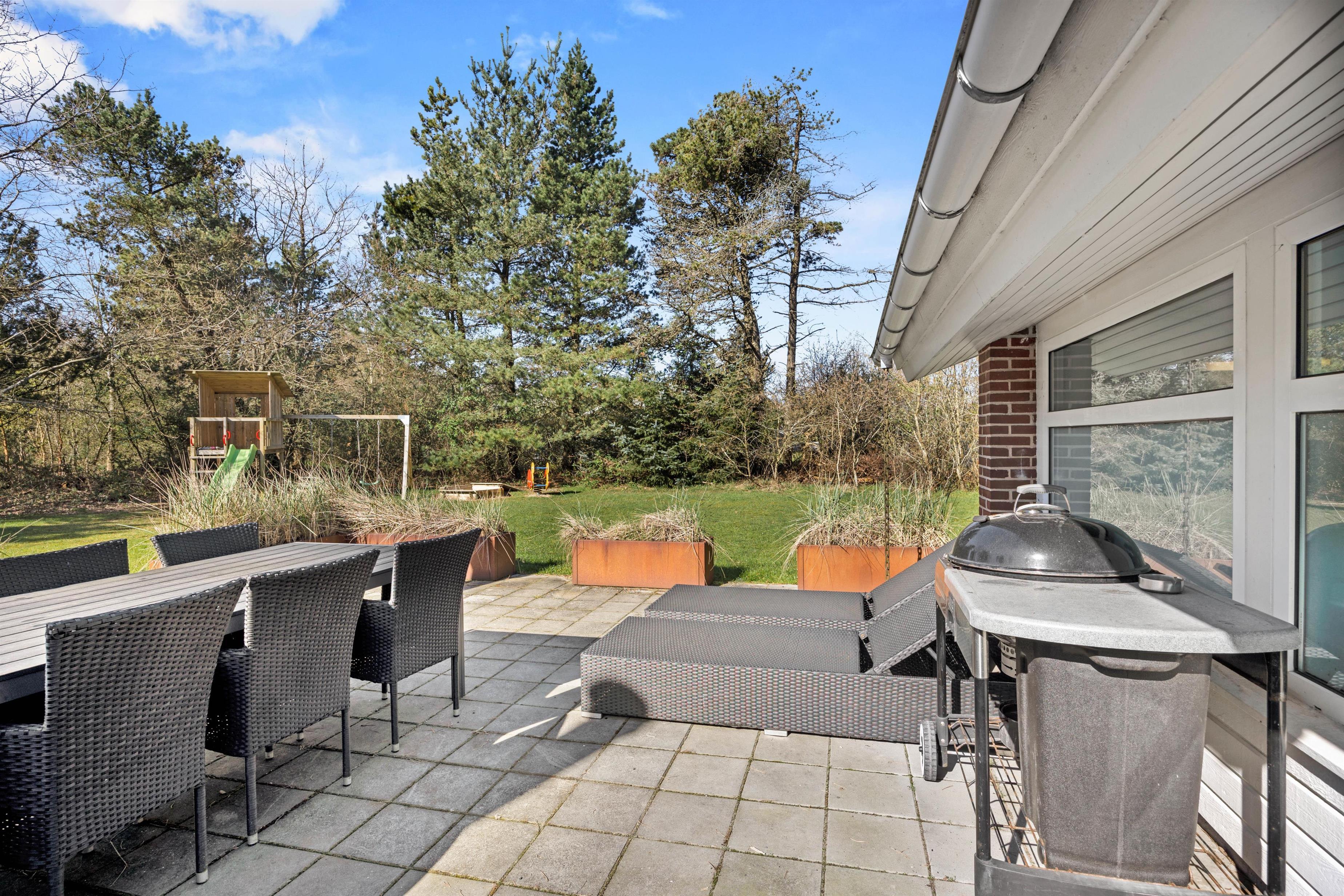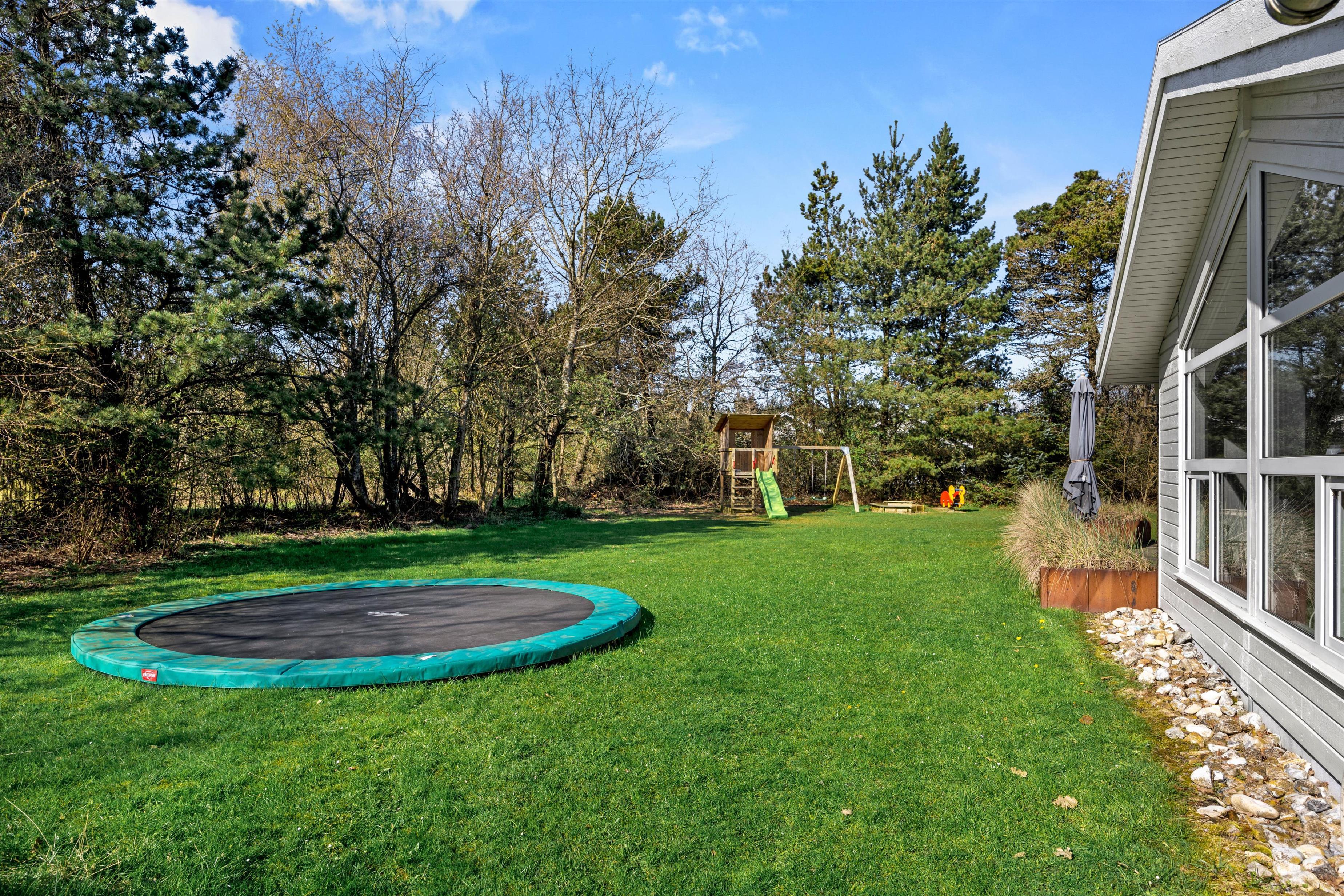I ly bag træer ligger feriehuset på en stor naturgrund. Her er så dejligt og virkelig tænkt på at få skabt et uderum for både store og små. Der er flere dejlige terrasser rundt om feriehuset, så I kan nyde solskinstimerne. Den flade græsplæne er perfekt til fodbold eller kongespil. I den indhegnede have er en stor nedgravet trampolin, en sandkasse og et legetårn med både gynger og rutsjebane. Mens ungerne hopper rundt, kan der solbades og slappes af på terrassen.