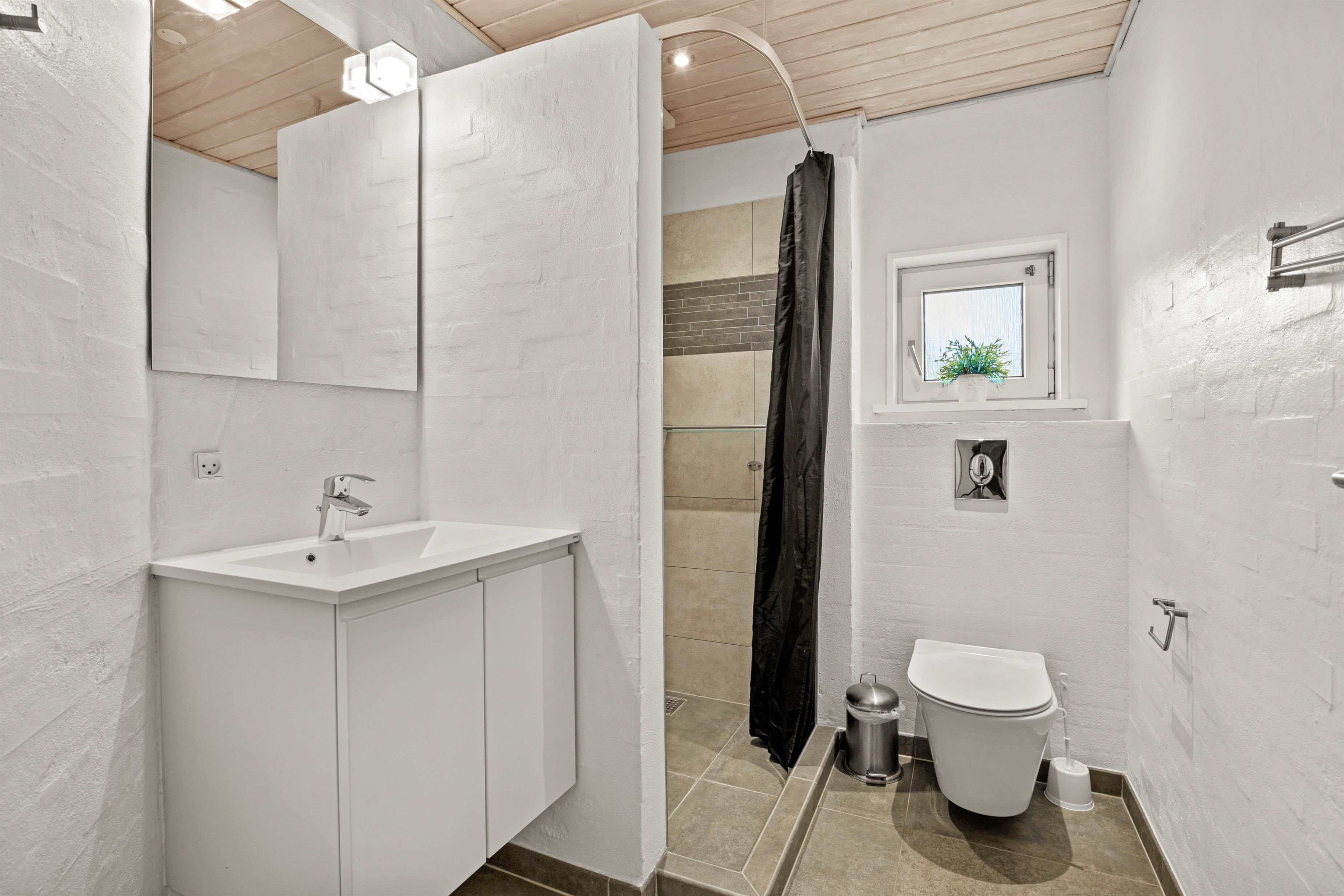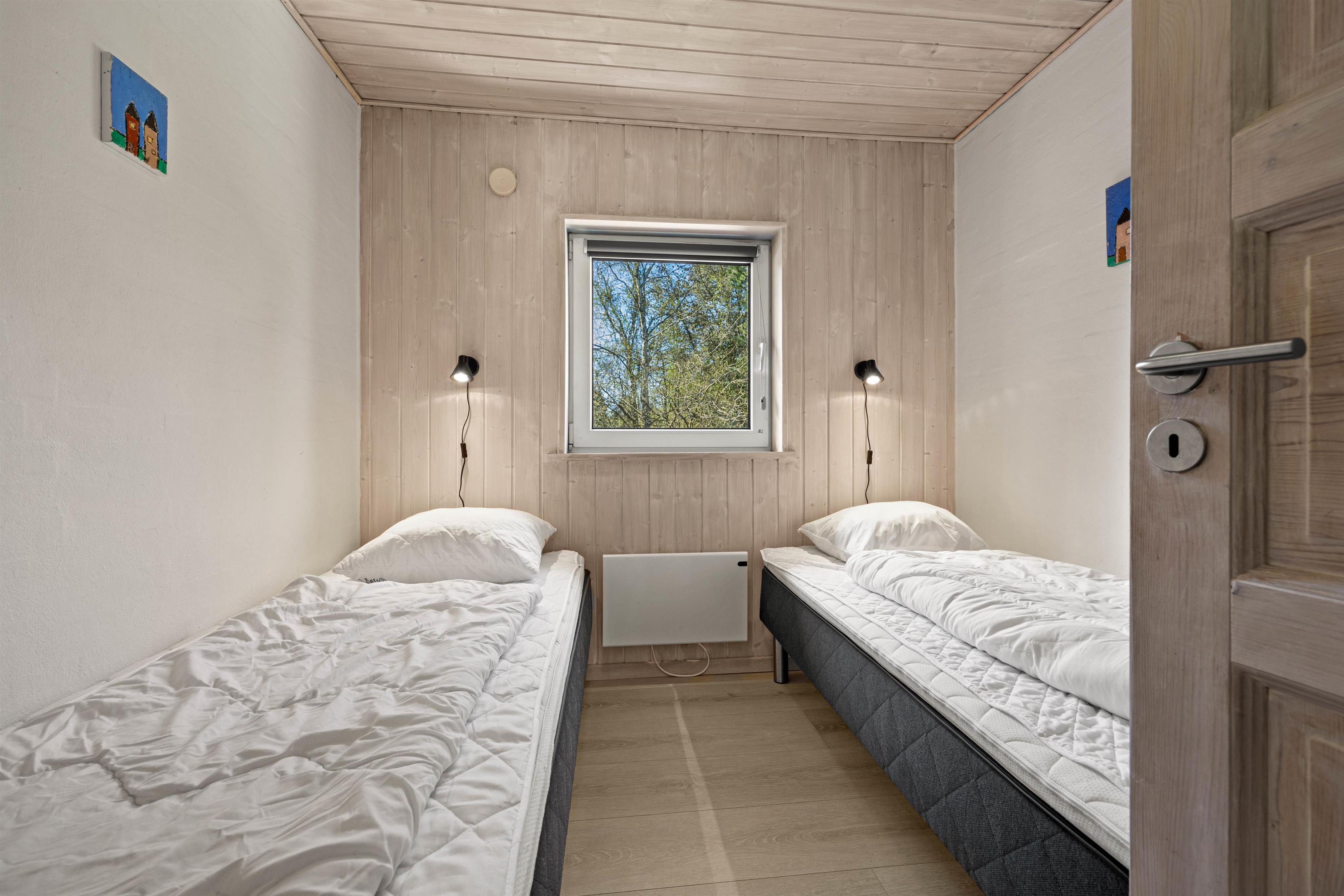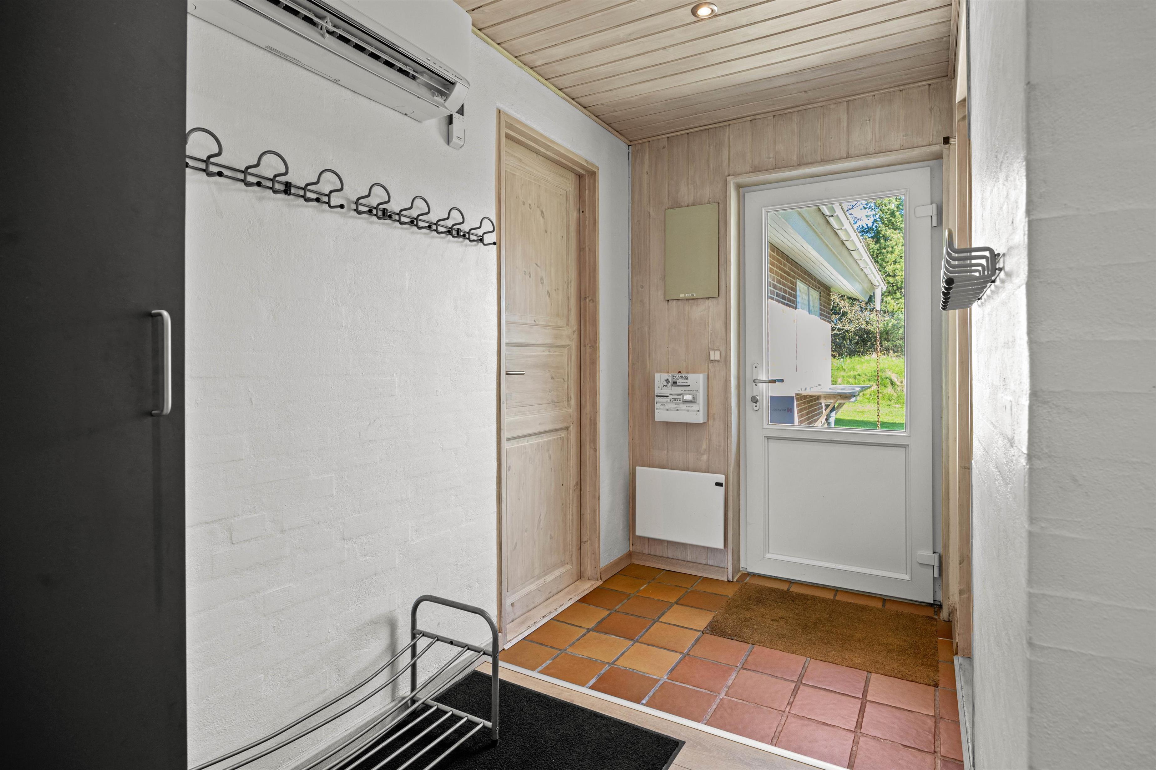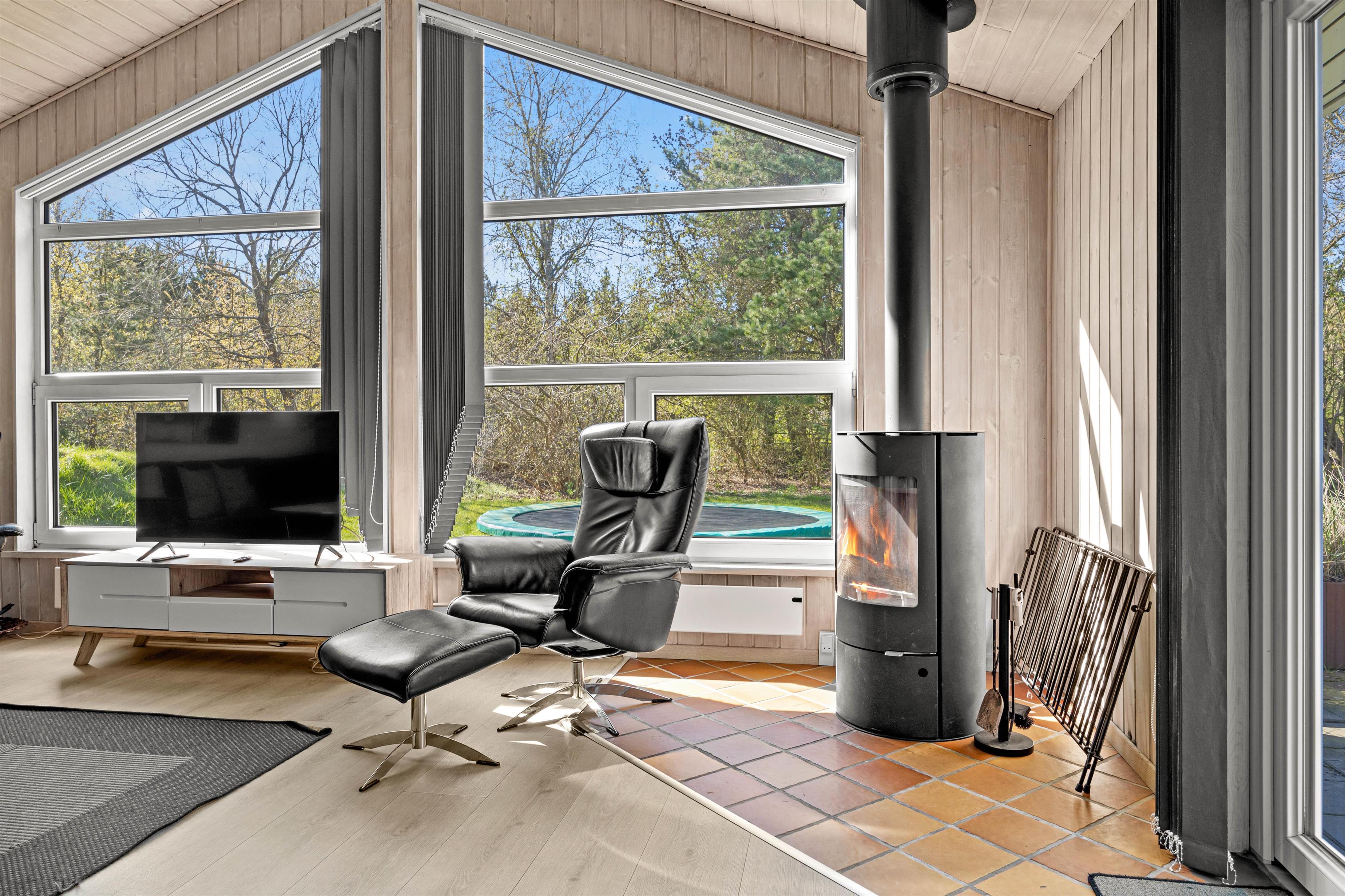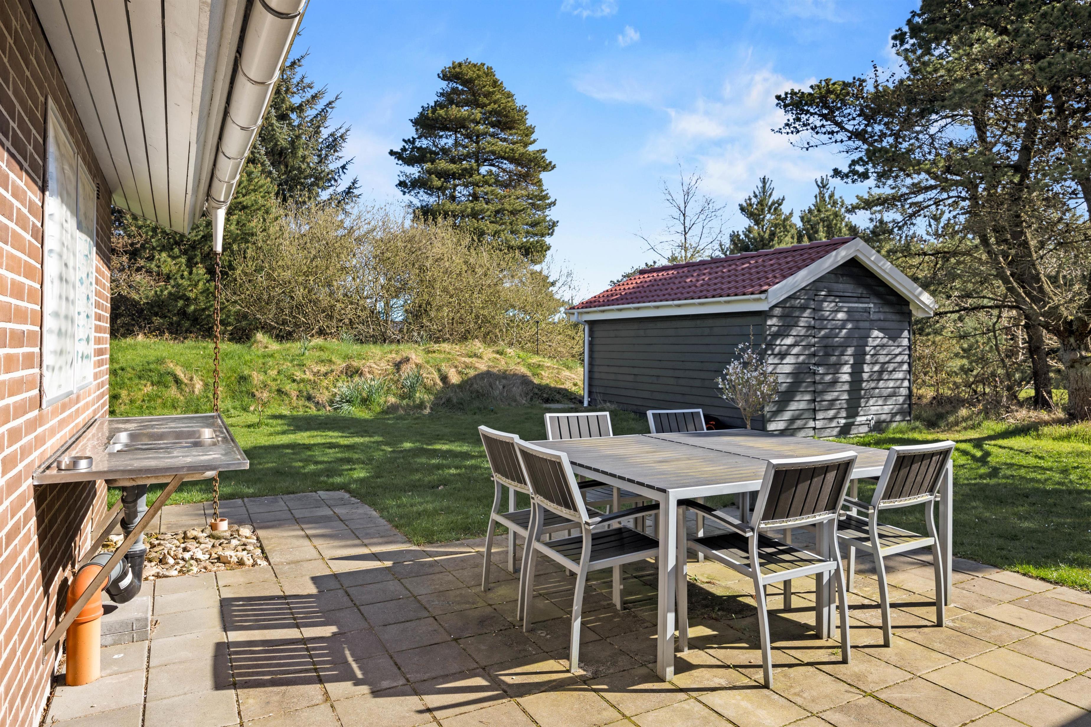 I ly bag træer ligger feriehuset på en stor naturgrund. Her er så dejligt og virkelig tænkt på at få skabt et uderum for både store og små. Der er flere dejlige terrasser rundt om feriehuset, så I kan nyde solskinstimerne. Den flade græsplæne er perfekt til fodbold eller kongespil. I den indhegnede have er en stor nedgravet trampolin, en sandkasse og et legetårn med både gynger og rutsjebane. Mens ungerne hopper rundt, kan der solbades og slappes af på terrassen.