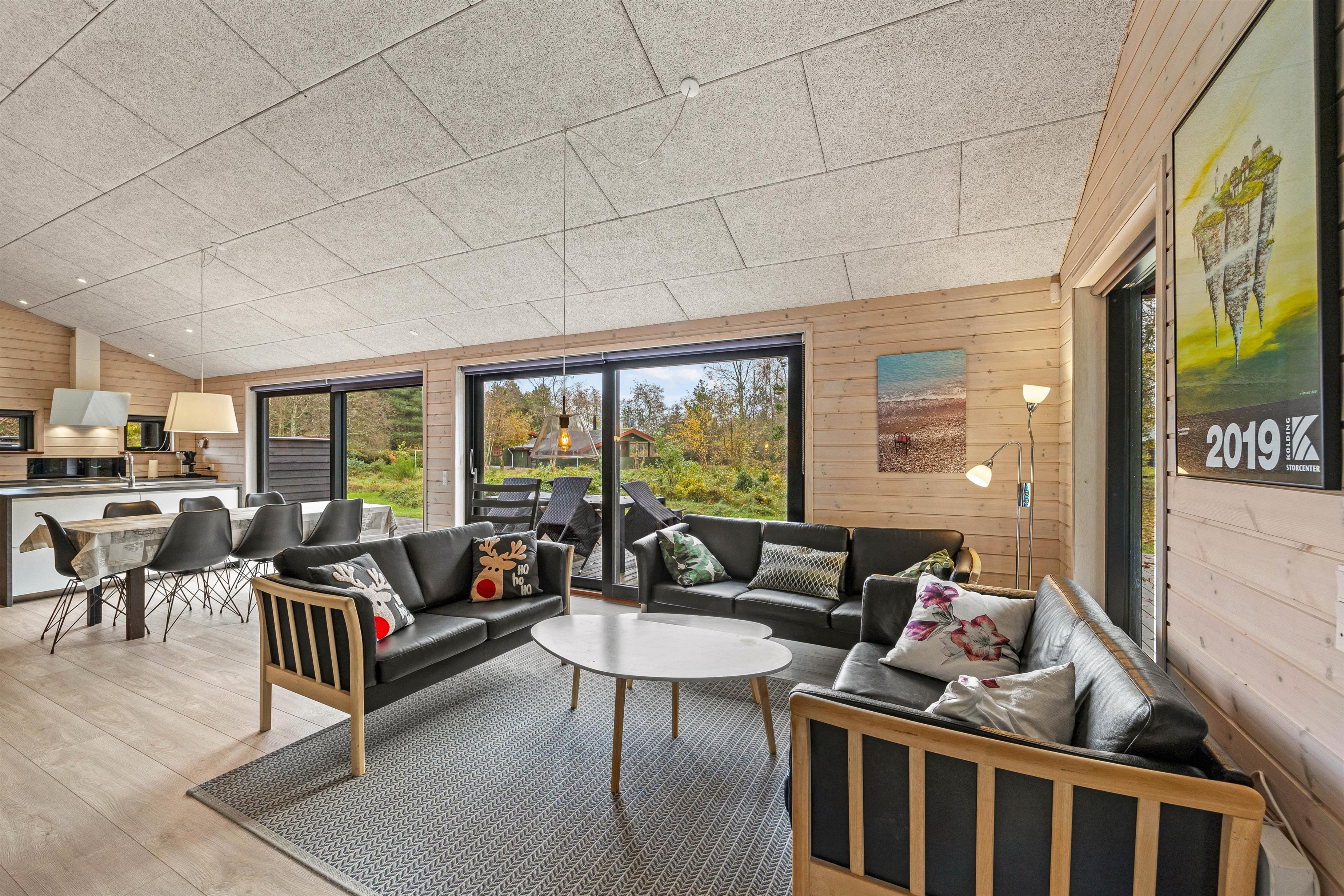 Straks I træder ind i den lille gang med plads til sko og overtøj, møder I den varme atmosfære og ro i feriehuset. Det moderne køkken er udstyret med opvaskemaskine, mikroovn og induktionskogeplade og god skabsplads. Det direkte udsyn til spisebordet lader kokken være en del af samtalen og dem, der slapper af i sofaerne ved brændeovnen, kan også deltage, for det store åbne rum giver mulighed for at være sammen – også hver for sig.