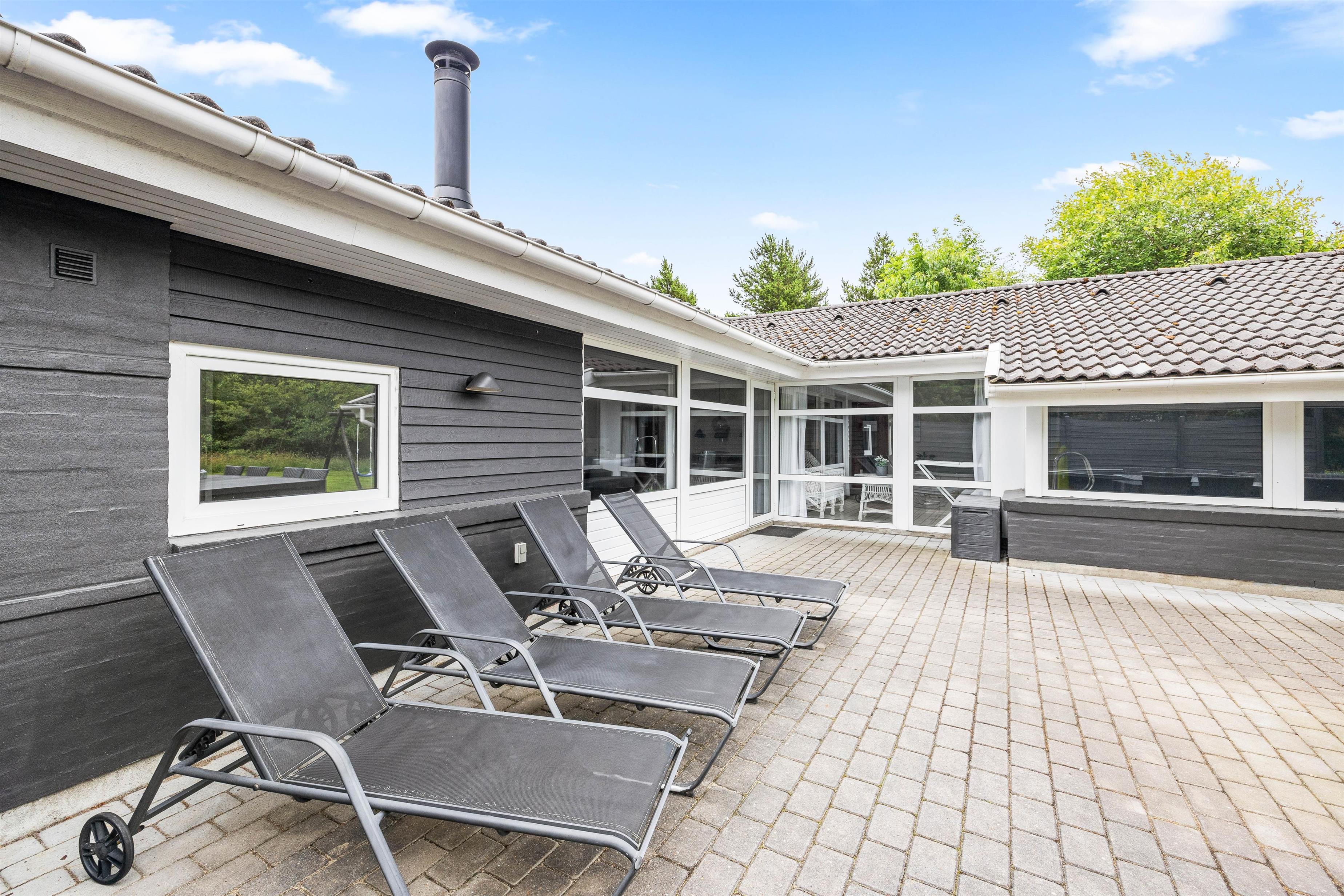 På de solrige dage kan I rykke feriehyggen ud på den store terrasse. Her står både havemøbler, liggestole og grill klar til jer. Den 2.500 kvadratmeter store grund er godt afskærmet af høje træer og råder over en stor græsplæne, hvor børnene og hundene kan tumle rundt, mens I ser på fra terrassen. Der er både gyngestativ, sandkasse og fodboldmål på grunden.