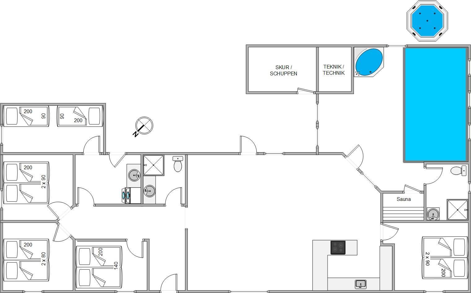 Det velindrettede køkken indeholder alt, hvad I behøver for at forkæle hinanden med hjemmelavede måltider. Især lystfiskere vil glædes over den separate fryser på 160 liter – her er nok plads til en fisk eller to. Ved det lange spisebord kan I spille om opvasken, selv om -maskinen tager det meste. Feriehuset indeholder 4 soveværelser med komfortable dobbeltsenge samt 1 soveværelse med 2 enkeltsenge, så I kan indrette jer i forhold til, hvad der passer jer bedst. De 2 badeværelser med gulvvarme bidrager til, at der ikke behøver at være kø til tandbørstningen. Der er vaskemaskine og tørretumbler til rådighed for jer.
