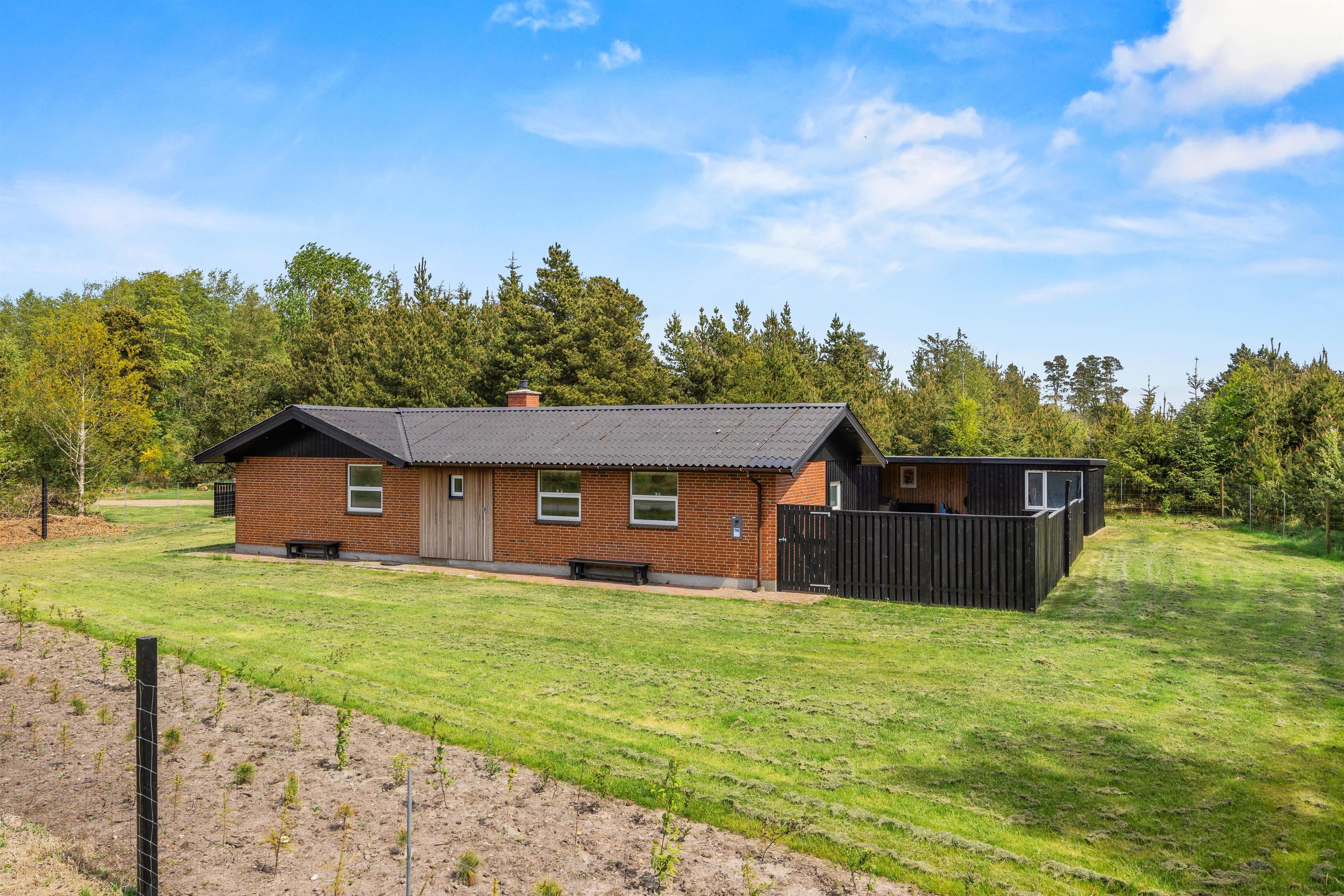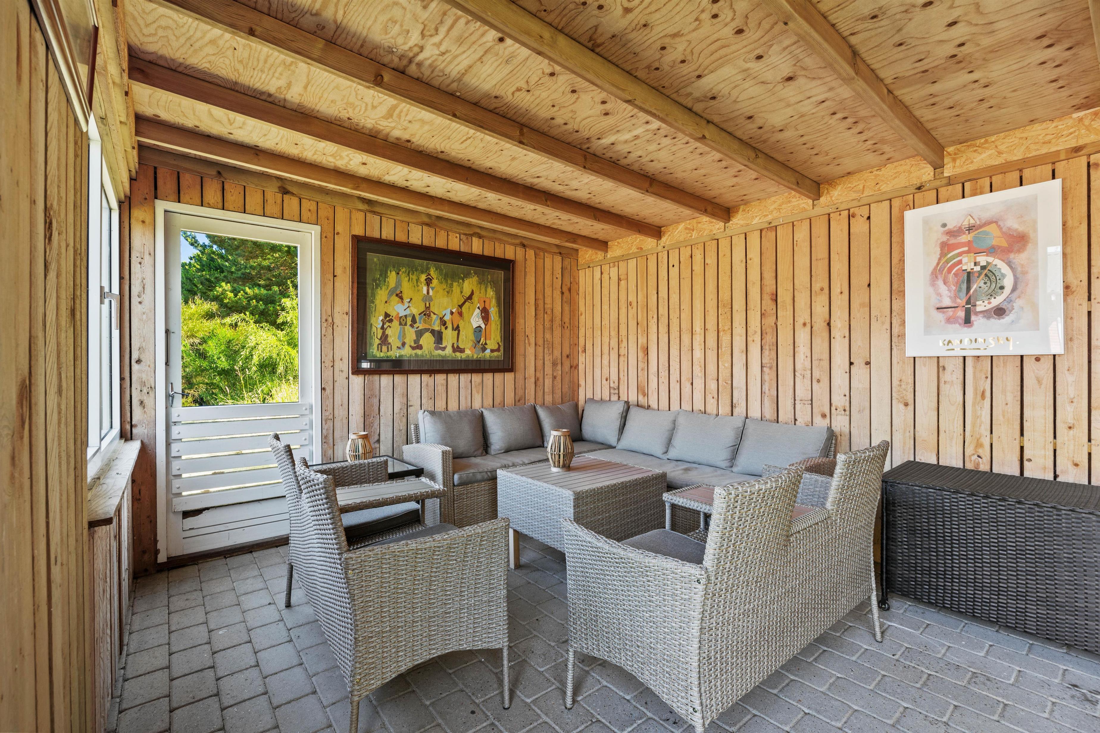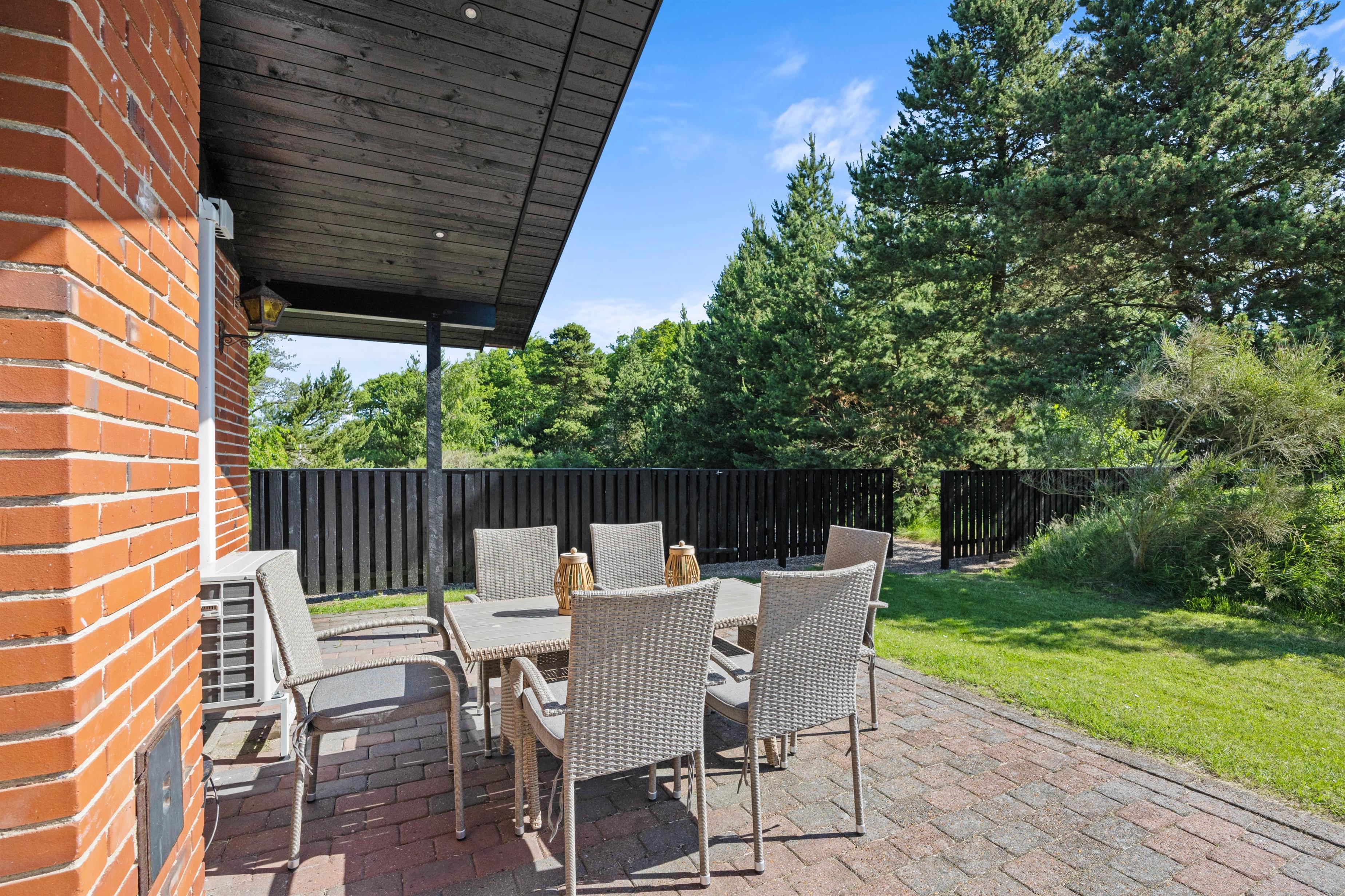 Fra feriehusets stue er der udgang til den dejlige delvist overdækkede terrasse med de lyse rattanmøbler, hvor I kan nyde dagens solskinstimer og måske et lækkert måltid fra grillen. Rundt om hjørnet står et par behagelige lænestole, som indbyder til at smække fødderne op og tage en middagslur. Hele grunden er desuden indhegnet, så I kan roligt lade hunden snuse rundt i haven.