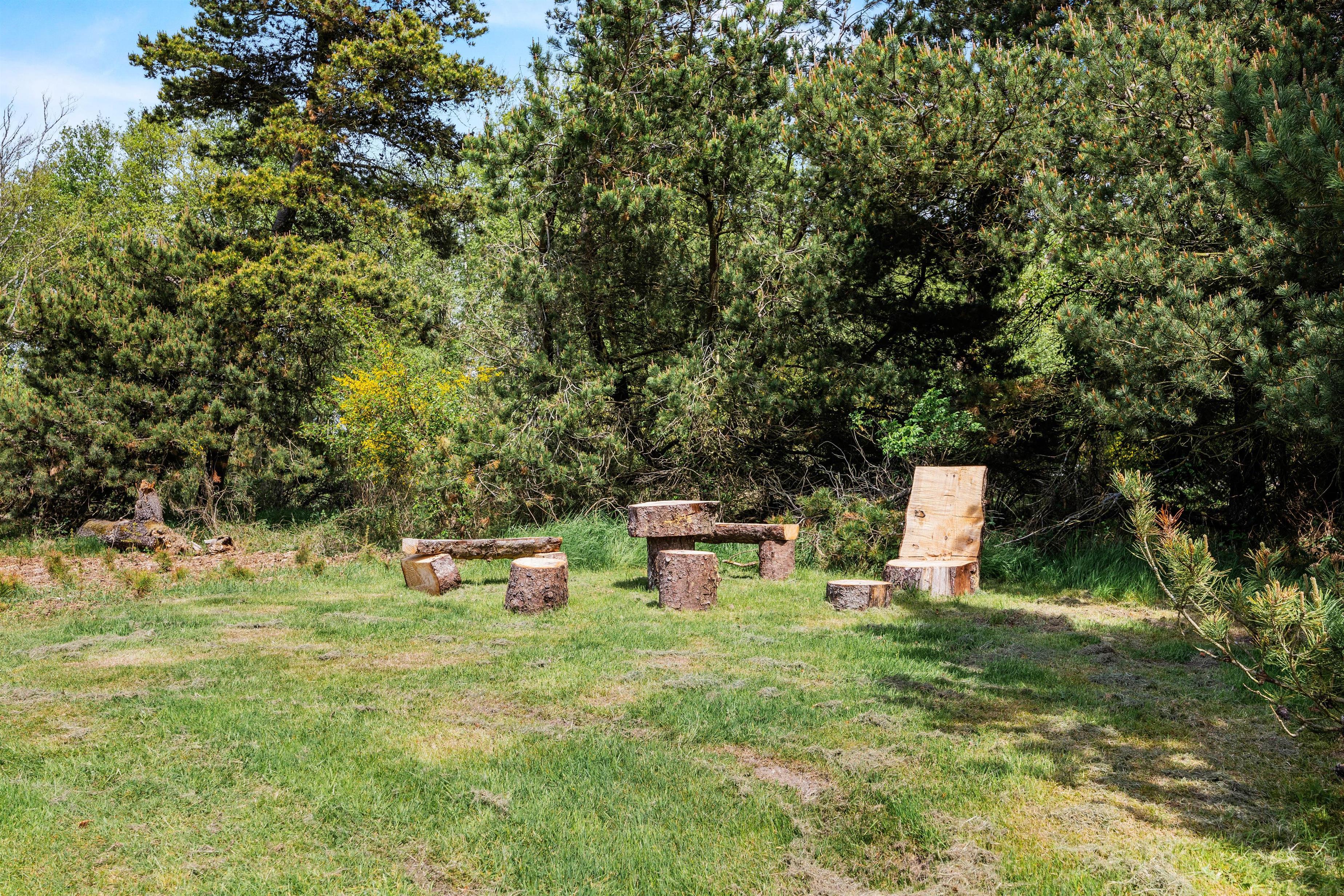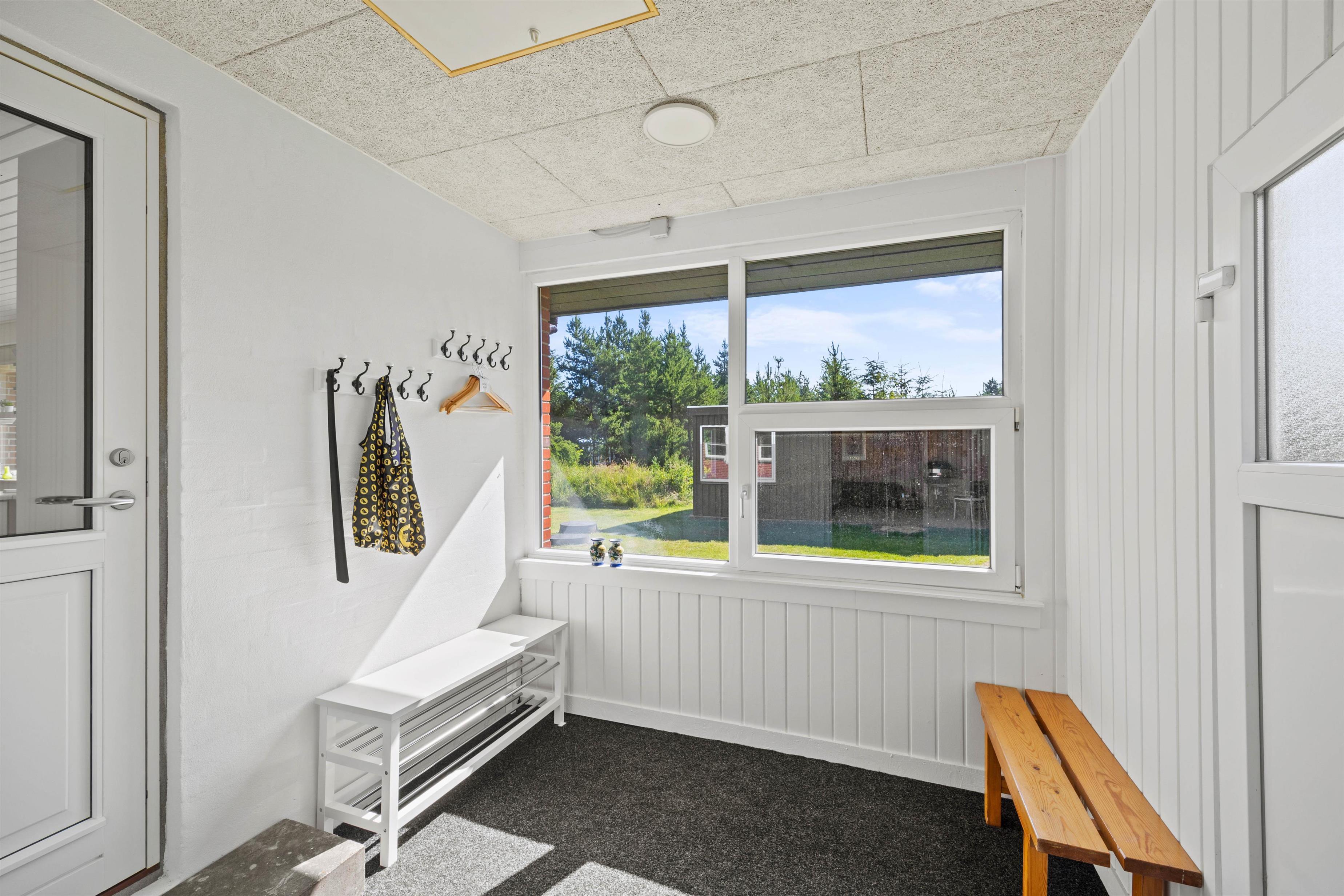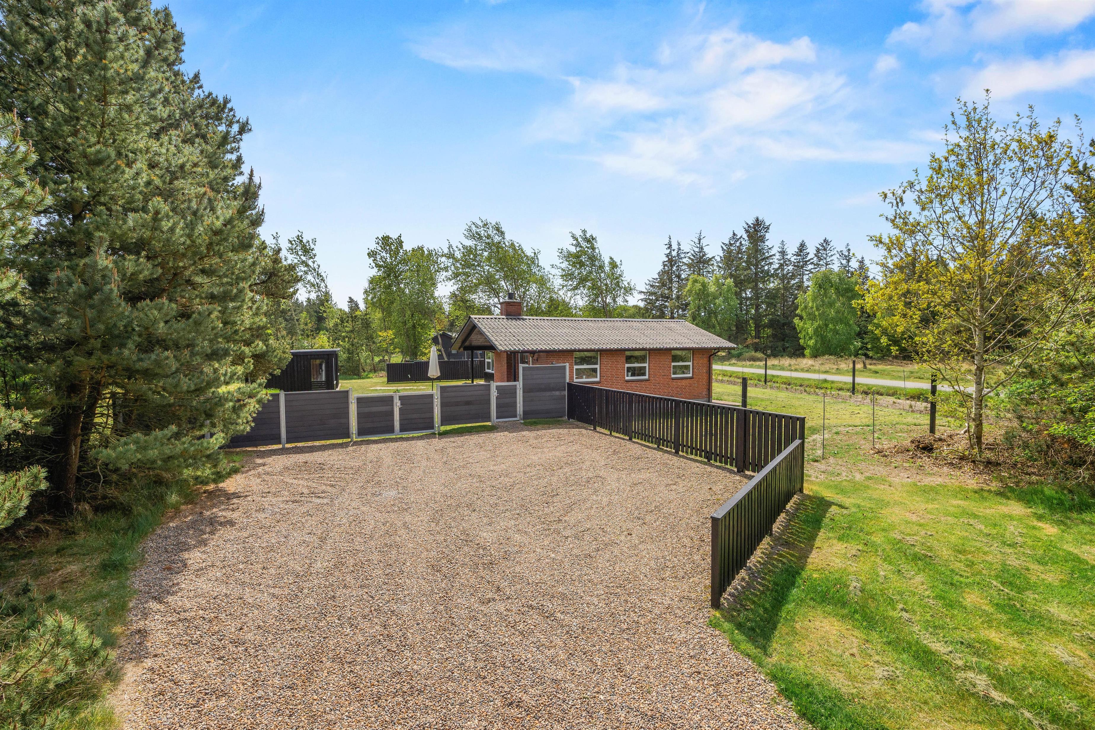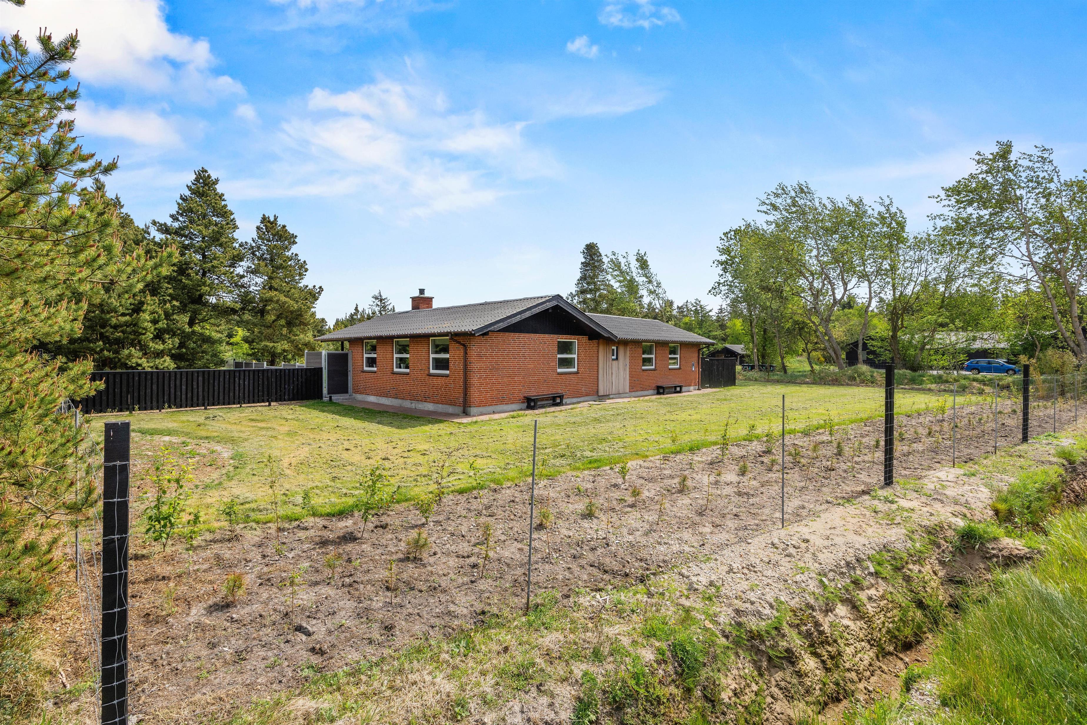 Fra feriehusets stue er der udgang til den dejlige delvist overdækkede terrasse med de lyse rattanmøbler, hvor I kan nyde dagens solskinstimer og måske et lækkert måltid fra grillen. Rundt om hjørnet står et par behagelige lænestole, som indbyder til at smække fødderne op og tage en middagslur. Hele grunden er desuden indhegnet, så I kan roligt lade hunden snuse rundt i haven.