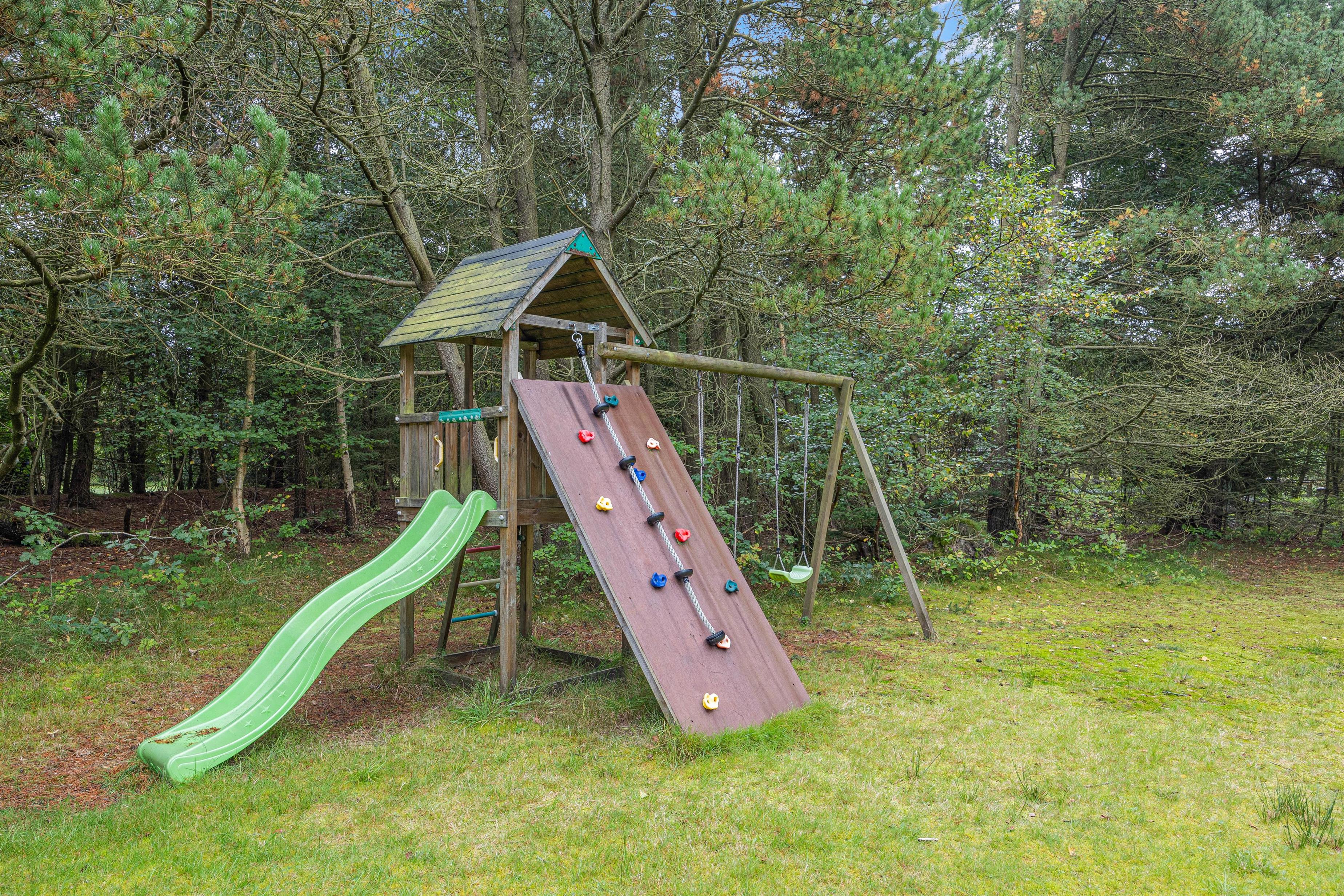 De solrige dage kan I nyde udenfor på den store terrasse. Her står både havemøbler, liggestole og grill klar til jer. Grunden er godt afskærmet af de høje træer og råder over en stor græsplæne, hvor børnene og hundene kan tumle rundt. Her kan I spille fodbold, kongespil og til familiens mindste er her også et gyngestativ.