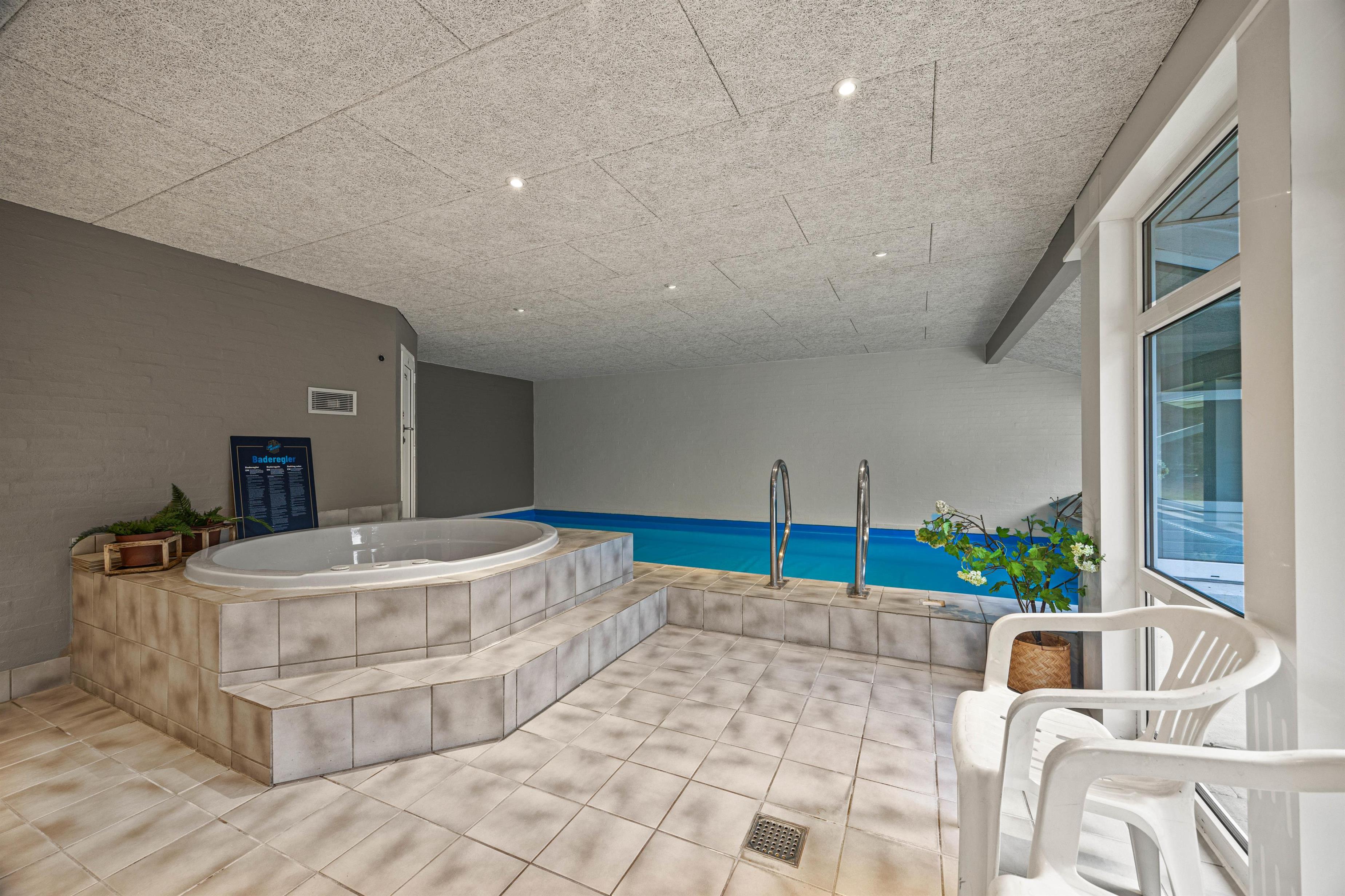 Et af højdepunkterne på Vestervænget 24 må uden tvivl være poolrummet, der gør jer uafhængige af vejret. Her kan I spille bold og plaske rundt i den 23m2 stor swimmingpool eller slappe af i den varme 4-personers spa – skønt er her også en sauna. Feriehuset rummer 2 badeværelser, begge med gulvvarme og det ene med vaskesøjle. Med vaskemaskine og tørretumbler kan I nemt opfriske strandhåndklæderne under opholdet.
