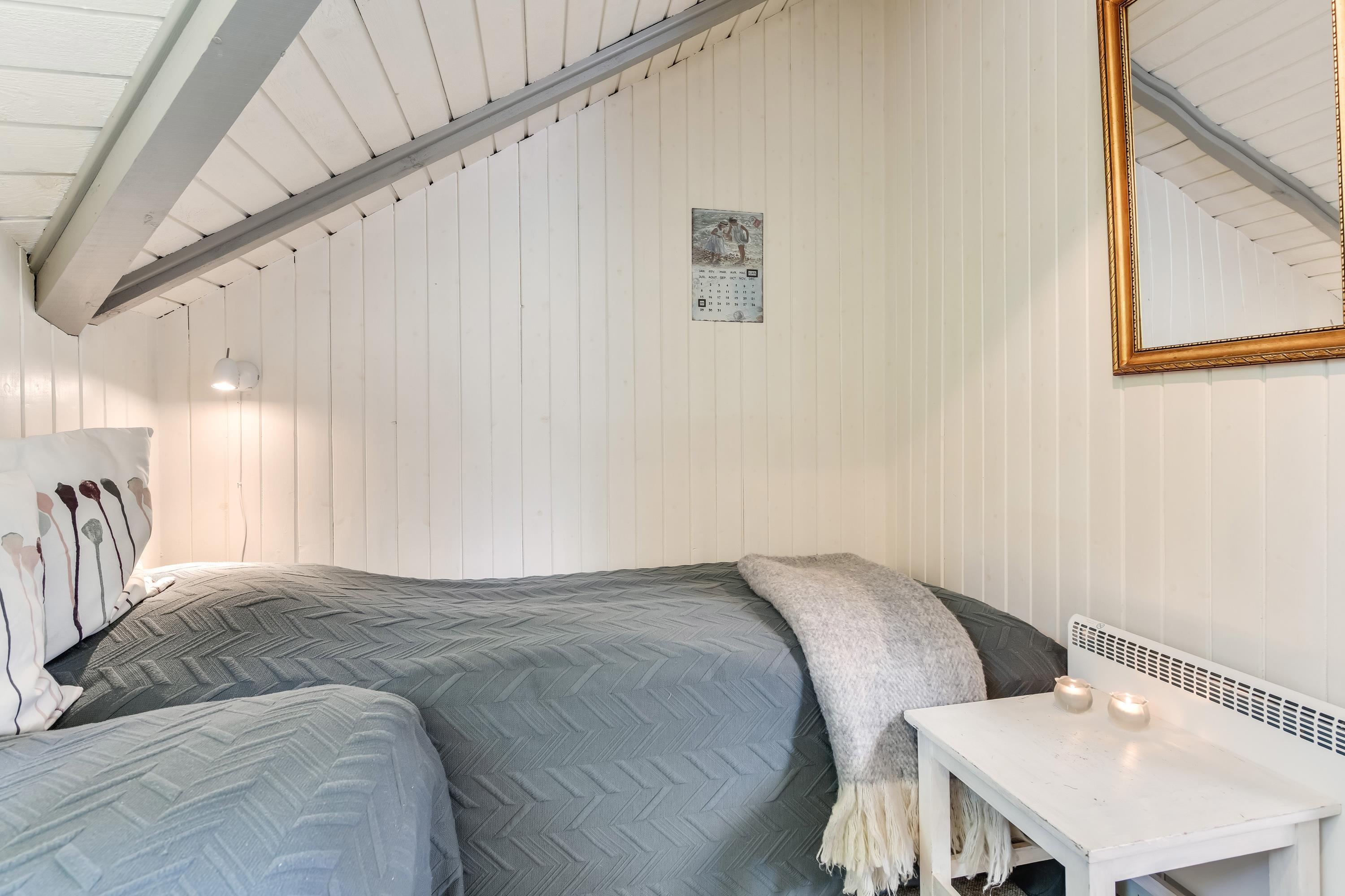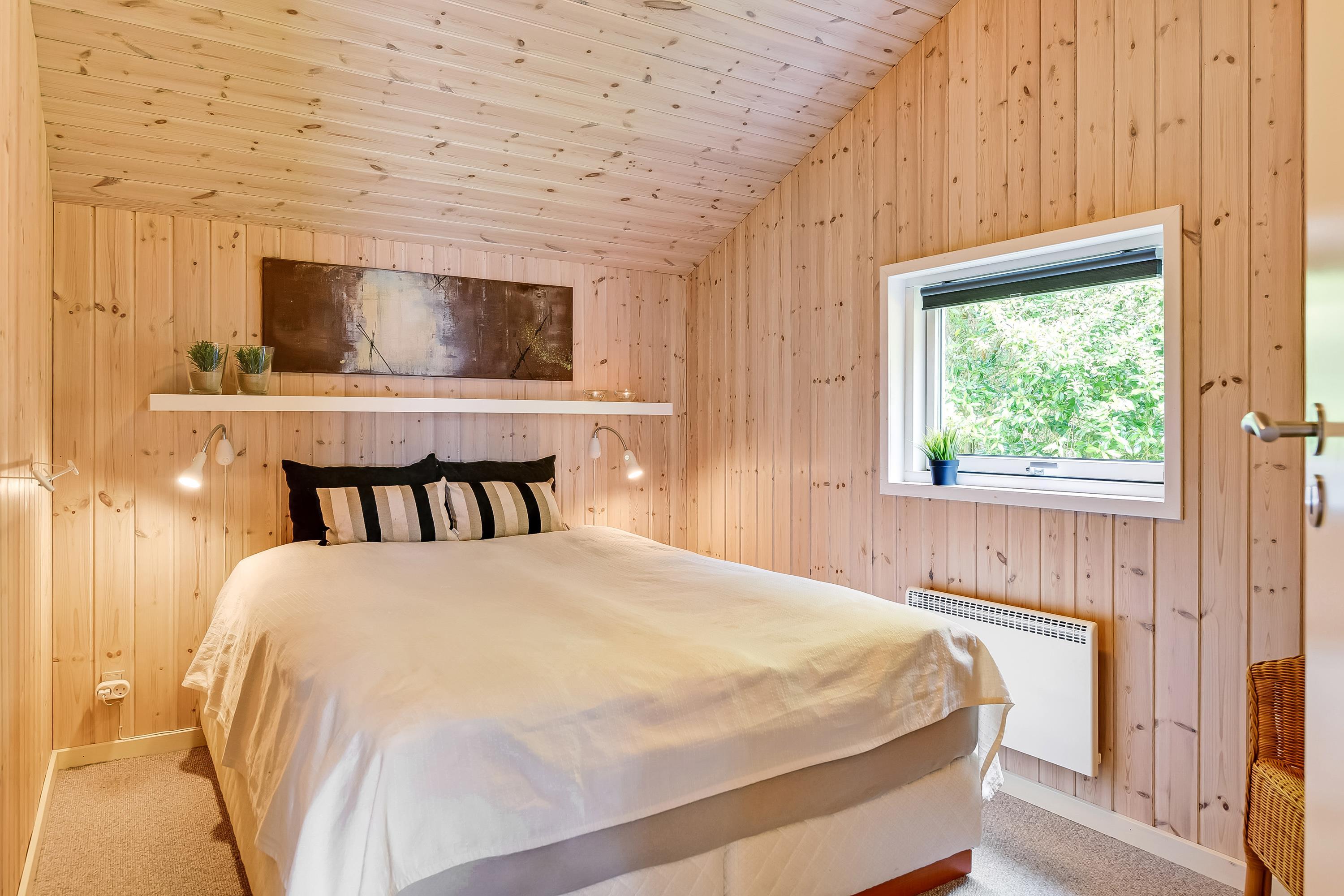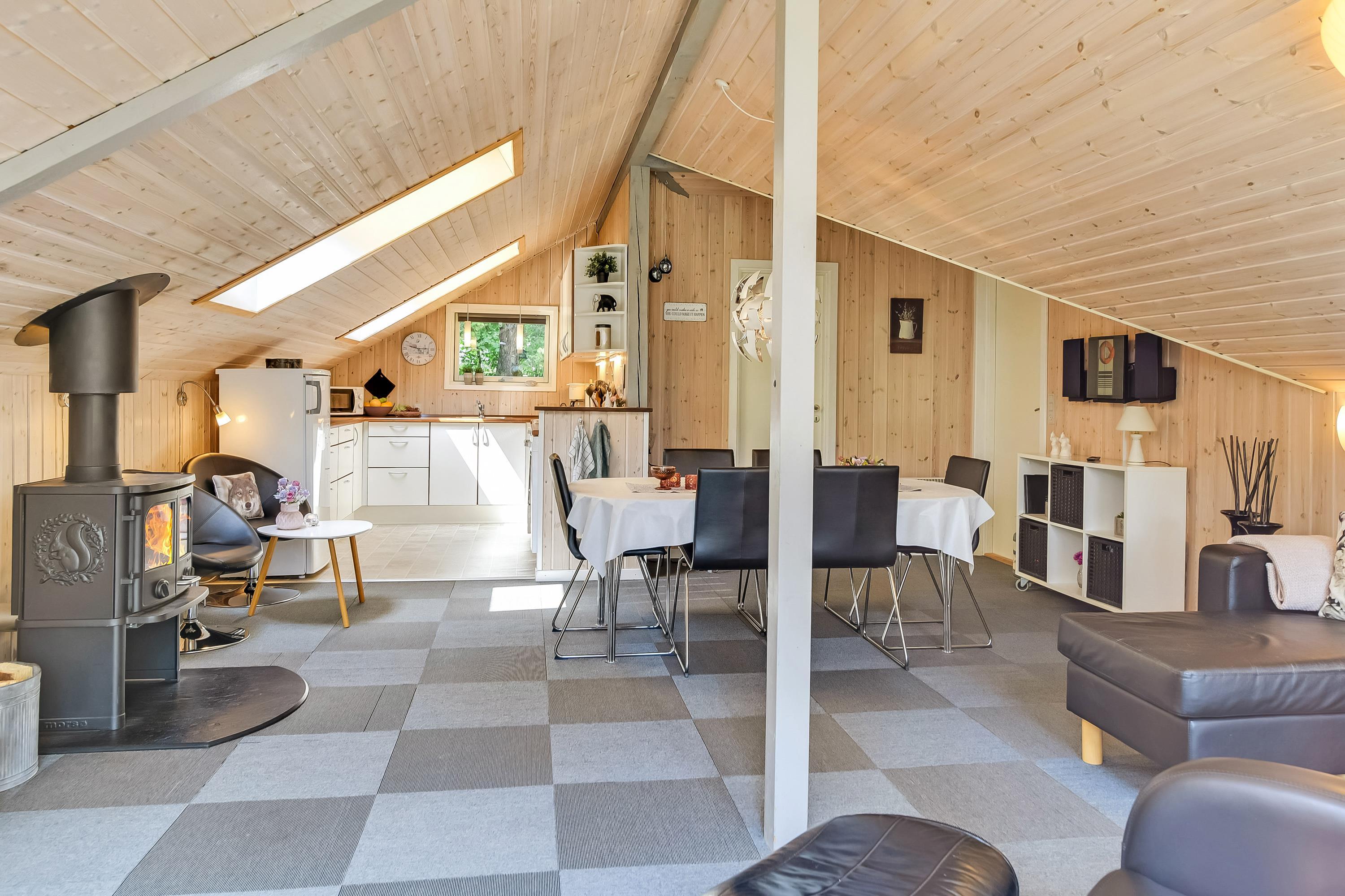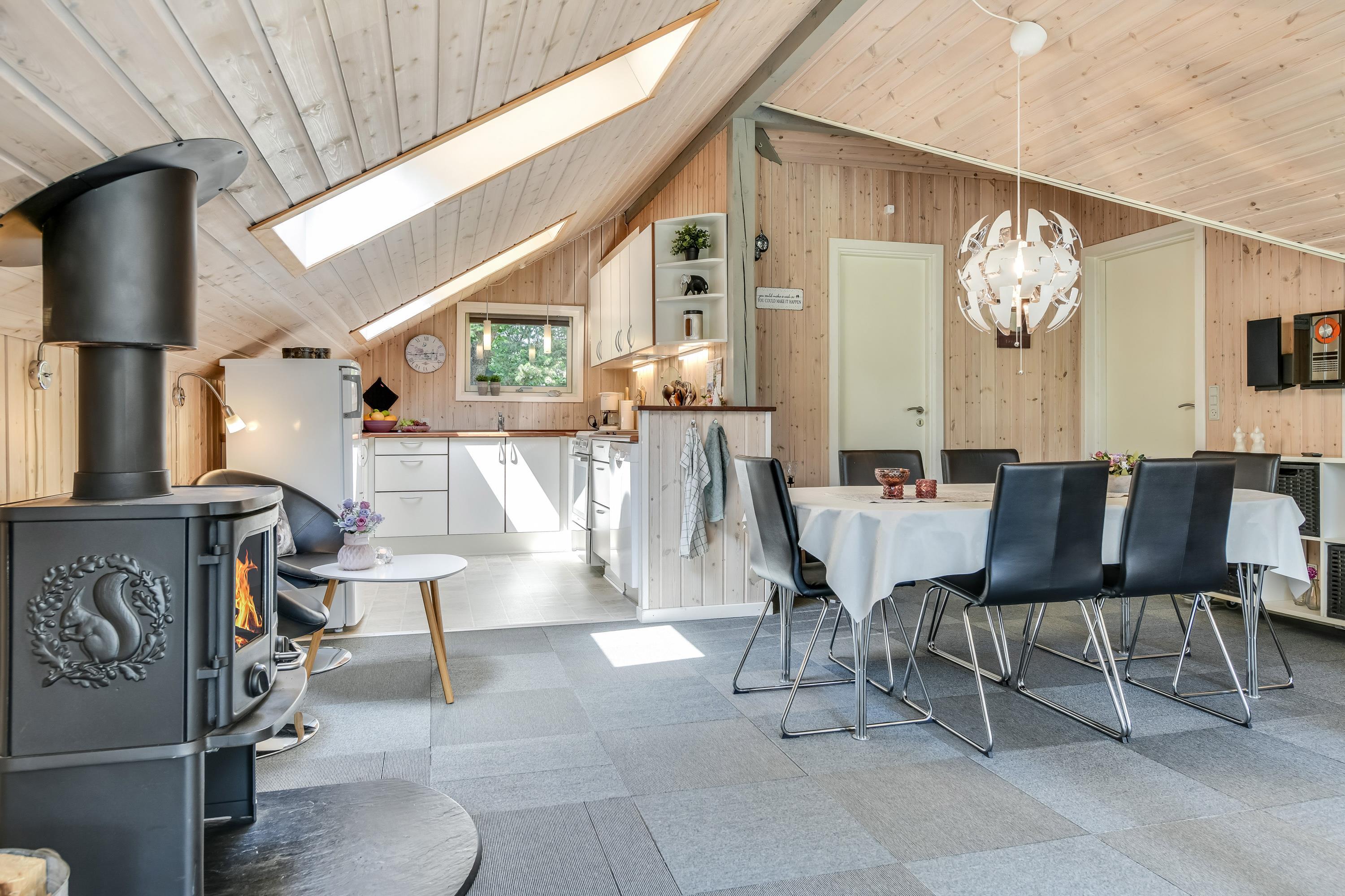 Ud over badeværelset er der i sommerhuset også 3 soveværelser, 2 med dobbeltsenge og 1 med enkeltsenge, og et køkken med åben forbindelse til stuen, der tilsammen udgør sommerhusets opholdsrum. Her vil I med garanti tilbringe mange skønne feriestunder sammen. For ekstra hygge kan I tænde op i brændeovnen.
