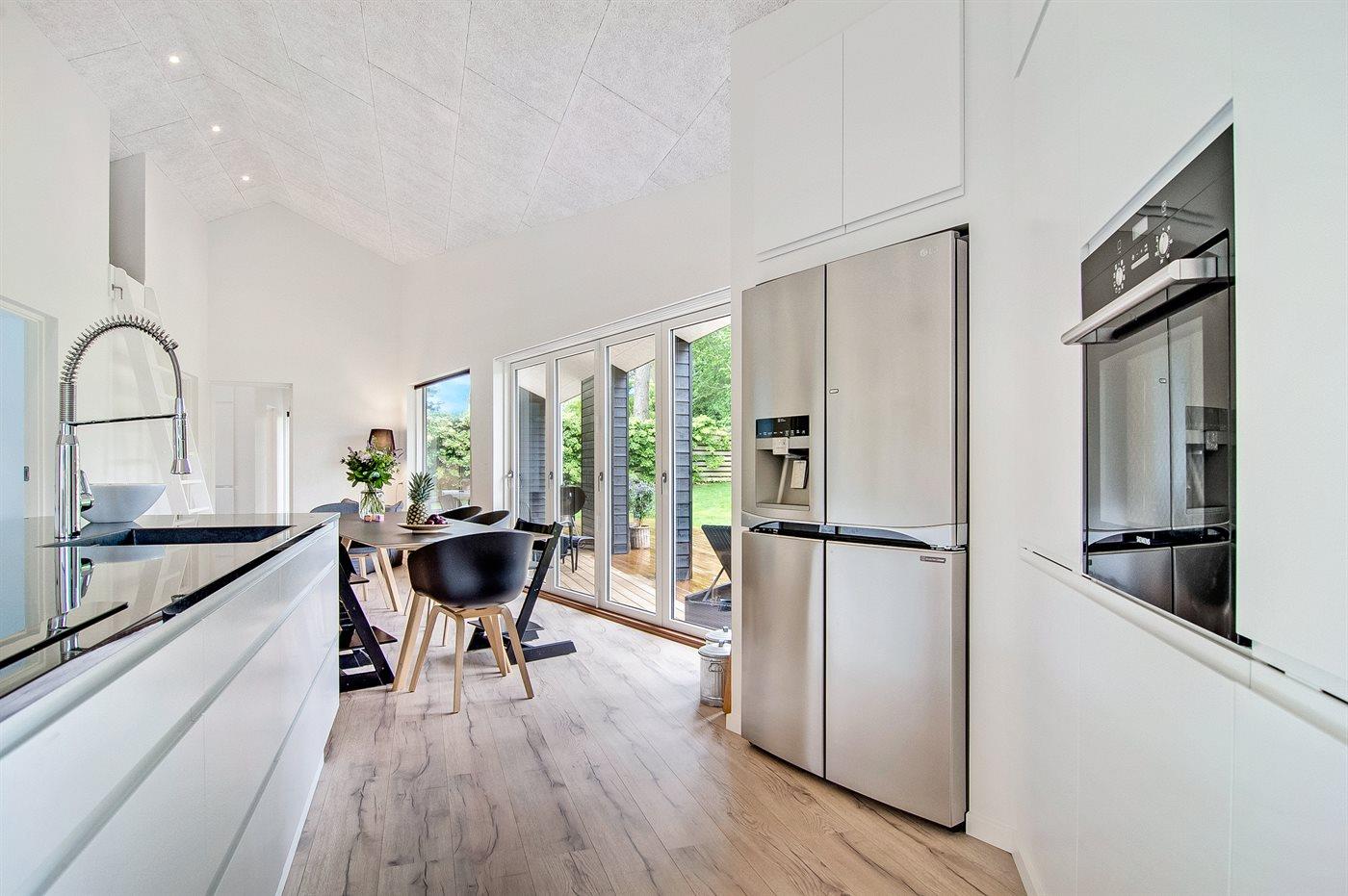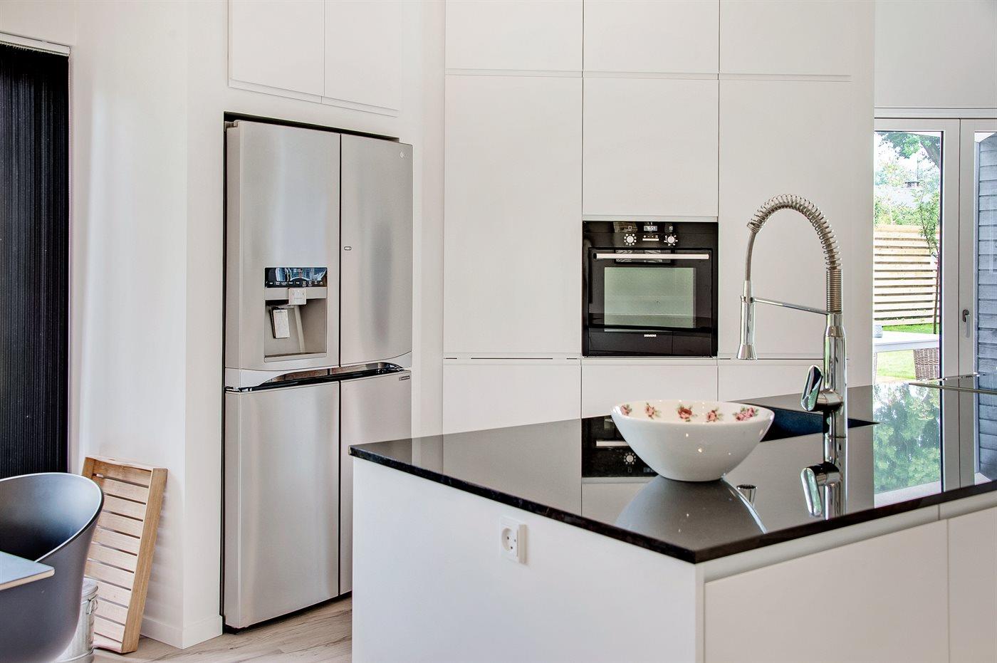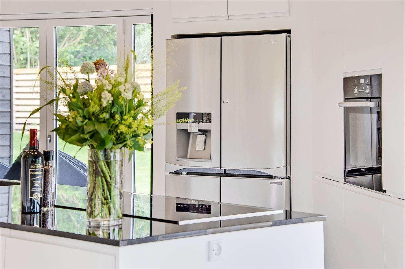 Køkkenet er udstyret med 1 amerikansk køleskab. Der er 5 induktionskogeplader, varmluftovn samt opvaskemaskine.