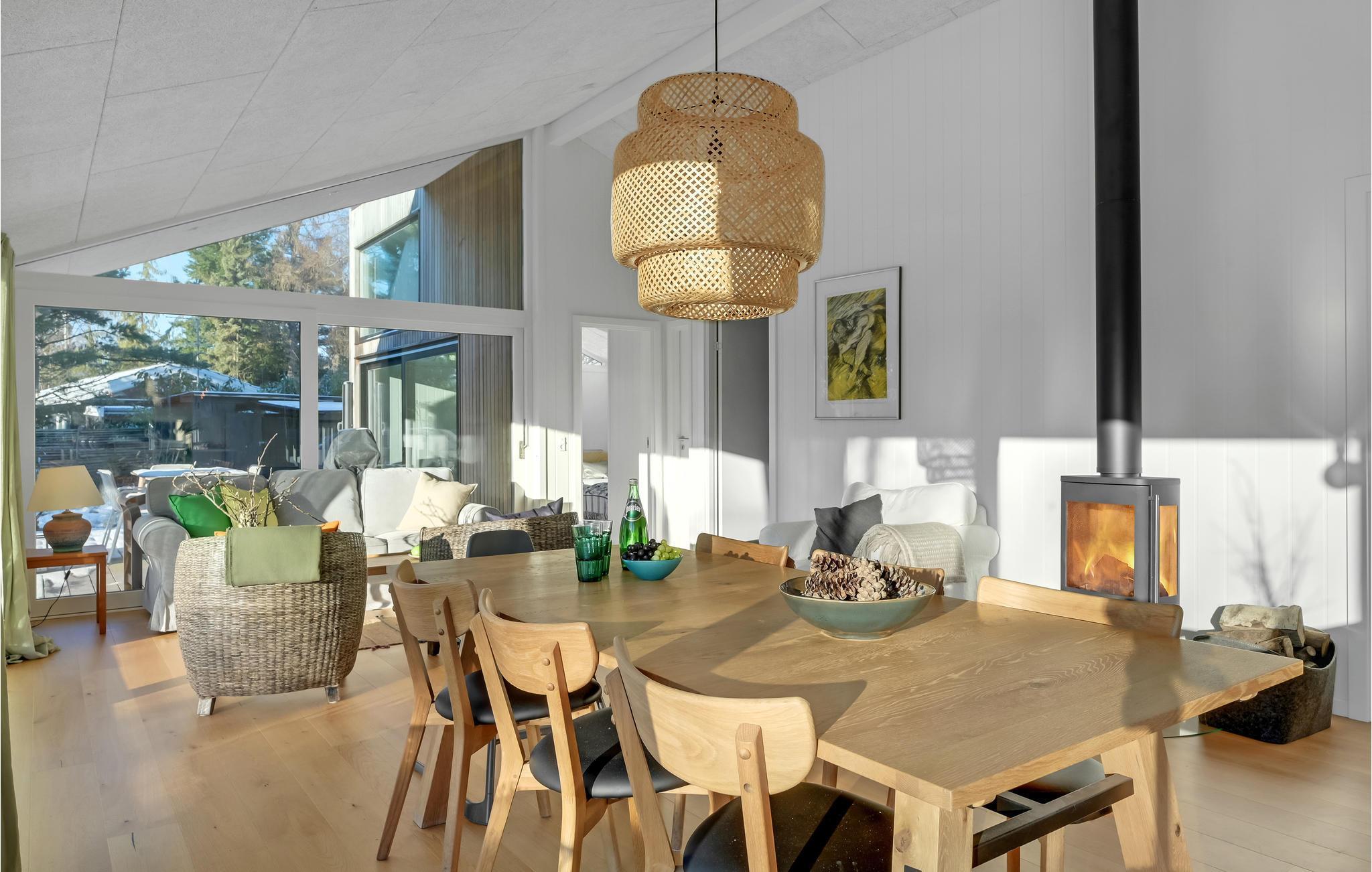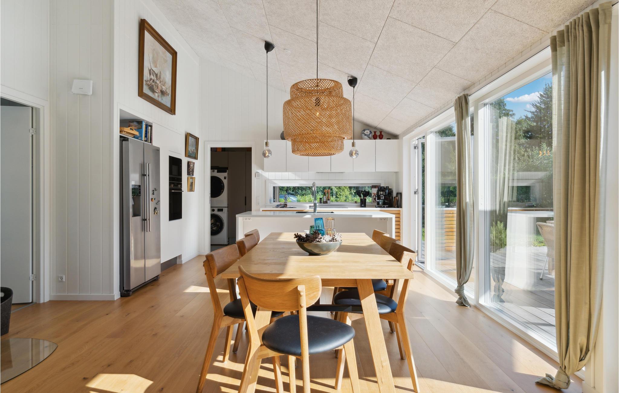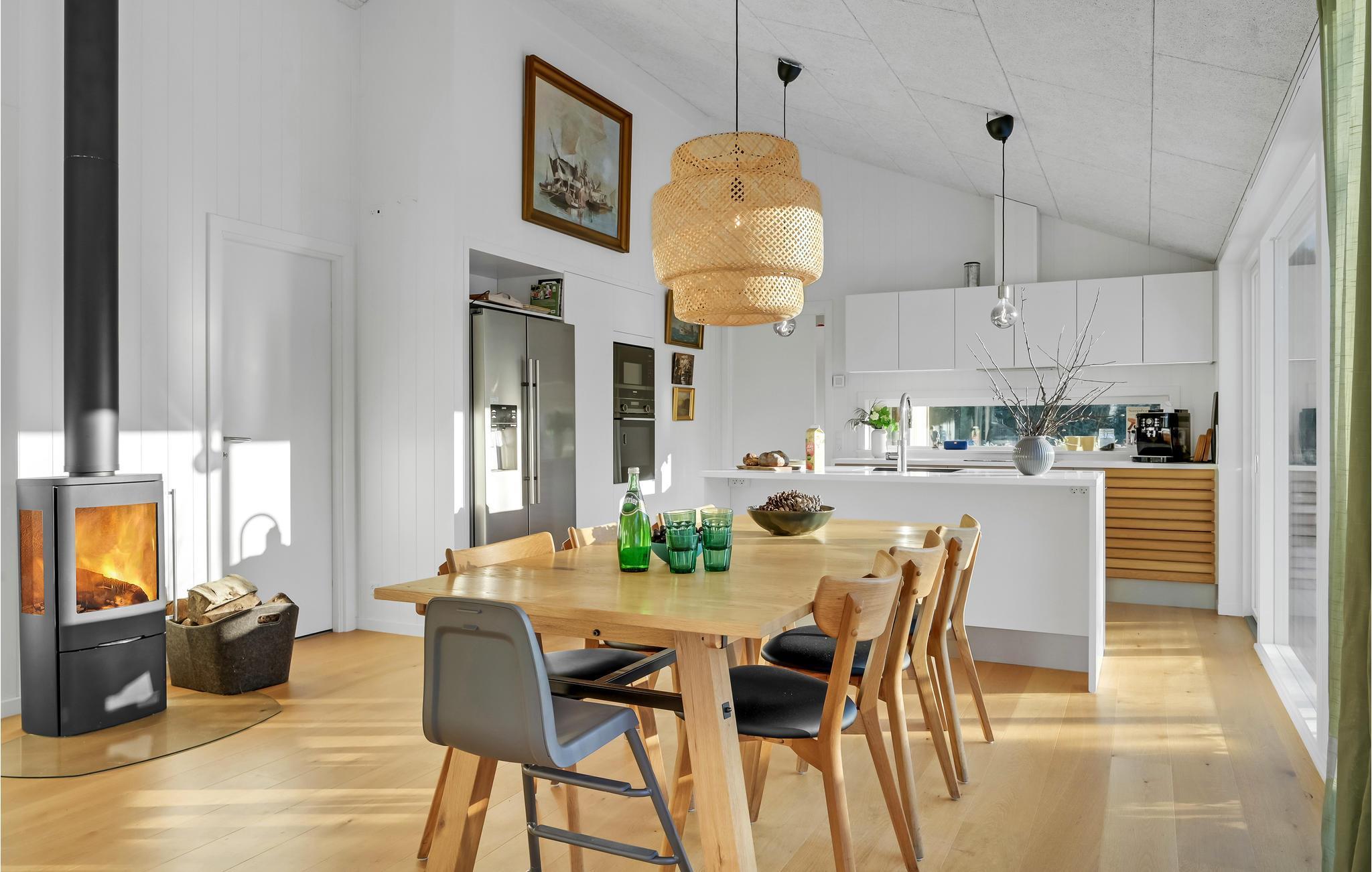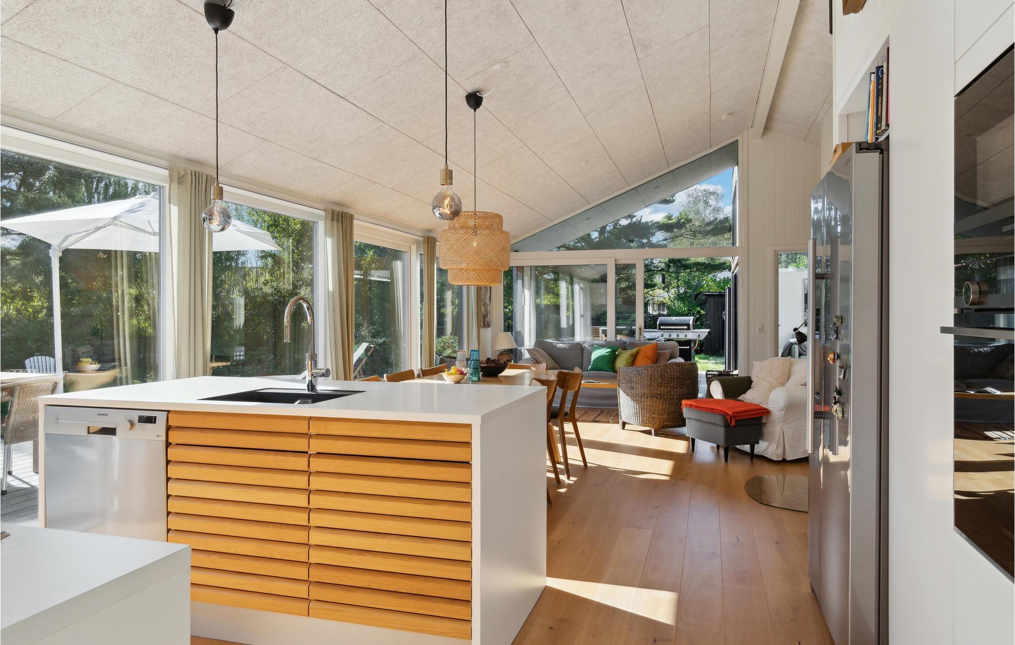 Velkommen til et fejende flot feriehus, som har alt til en ferie for den store familie. Her kan I se frem til lækre kvalitetsløsninger og dejlige opholdsrum. Det store køkken med amerikansk køleskab lægger op til hyggelige madlavningsaftener. Når I er færdige med at snitte og brase i køkkenet, kan I læne jer tilbage i sofaerne og spille brætspil, mens ilden knitrer i brændeovnen. Fra hele stuen er der en dejlig udsigt til haven, så de grønne omgivelser inviteres indenfor.