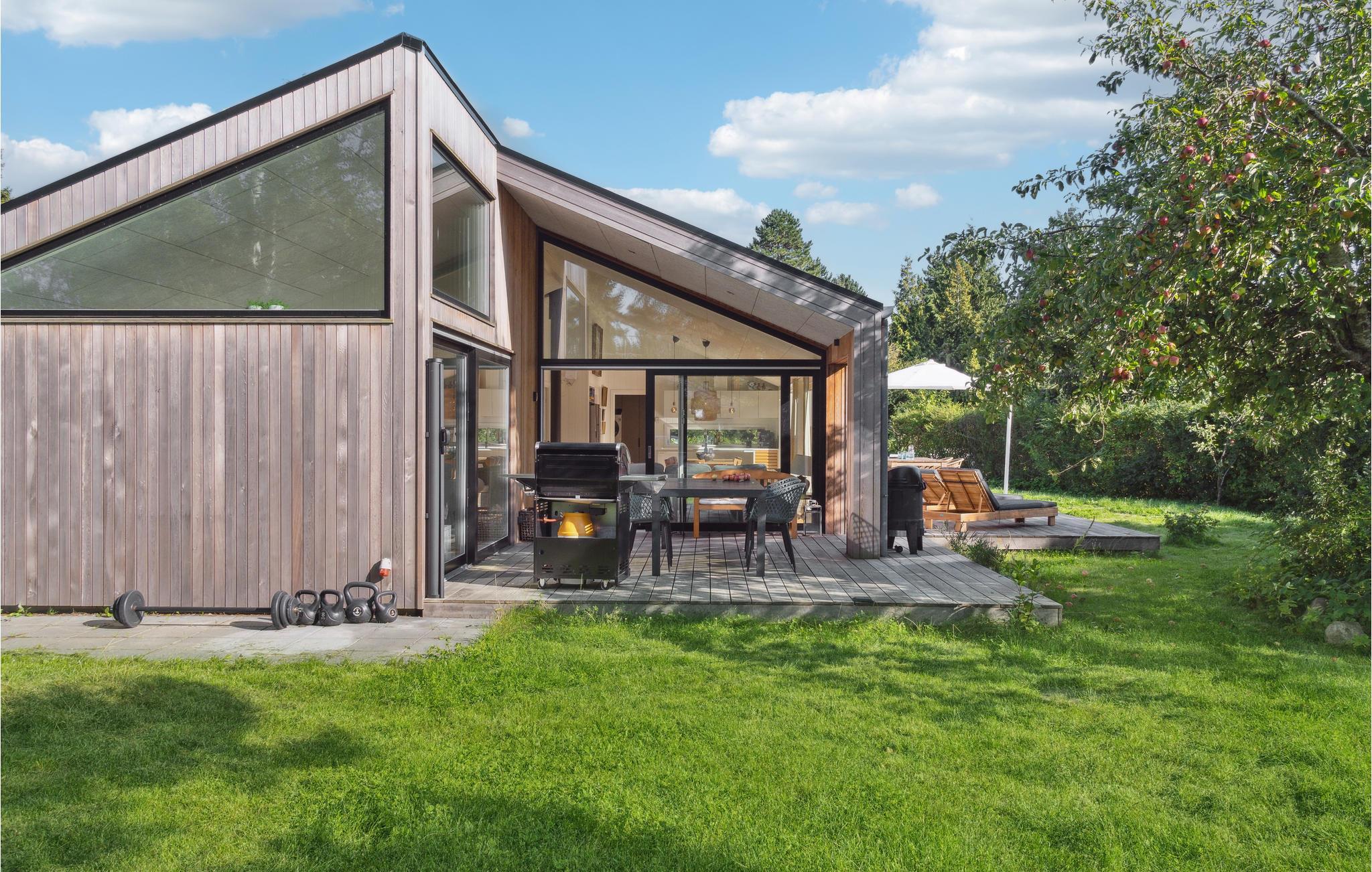 Komfortabelt og moderne feriehus med flot cedertræsfacade og store vinduespartier i Hornbæk.