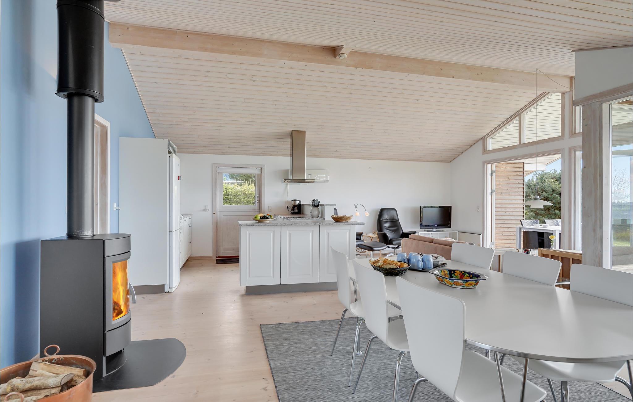 Husets centrum er den lyse opholdsstue med åbent køkken og spiseplads, hvor familien kan hygge sig sammen. Slap af i sofaen med en god film, eller lav mad til familie og venner i det veludstyrede køkken. Efter en lang gåtur spreder ilden i pejsen varme og hygge. Der er også tre soveværelser med to dobbeltsenge og en køjeseng.