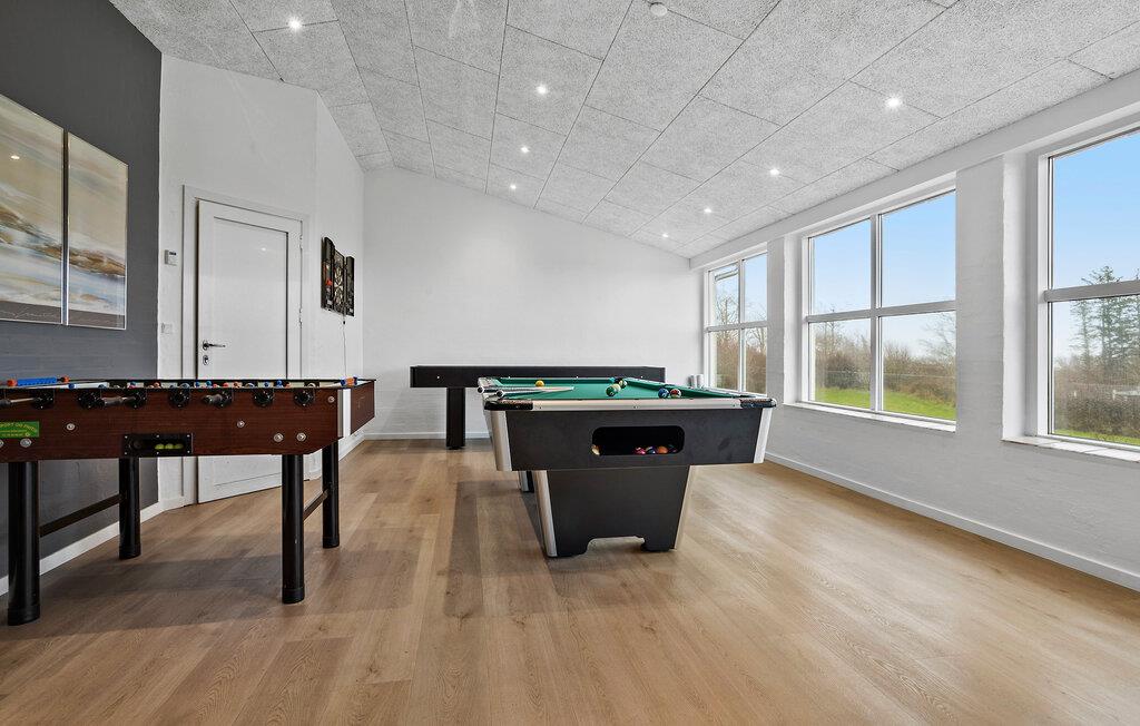 Velkommen til Hostrup Strand, hvor der få minutters gang fra Limfjorden venter jer en vidunderlig base i dette rummelige og komfortable hus. Her får I mange kvadratmeter at boltre jer på og gode faciliteter, der gør det til en ren drømmebolig for den større familie på tværs af generationerne. Indretningen fremtræder moderne og stilsikkert med et komfortabelt møblement og et veludstyret køkken, hvor familiens kokke kan tage sig god tid med madlavningen til den store festmiddag. Efter I har ryddet af, kan I gøre klar til den helt store familieturnering med pool, bordfodbold eller shuffleboard i aktivitetsrummet eller holde formen ved lige med fitness-udstyret. Når pulsen har lagt sig, kan I forkæle jer selv med lidt lækker wellness i boblebadet eller saunaen og rense godt ud i krop og sind efter en herlig feriedag.
