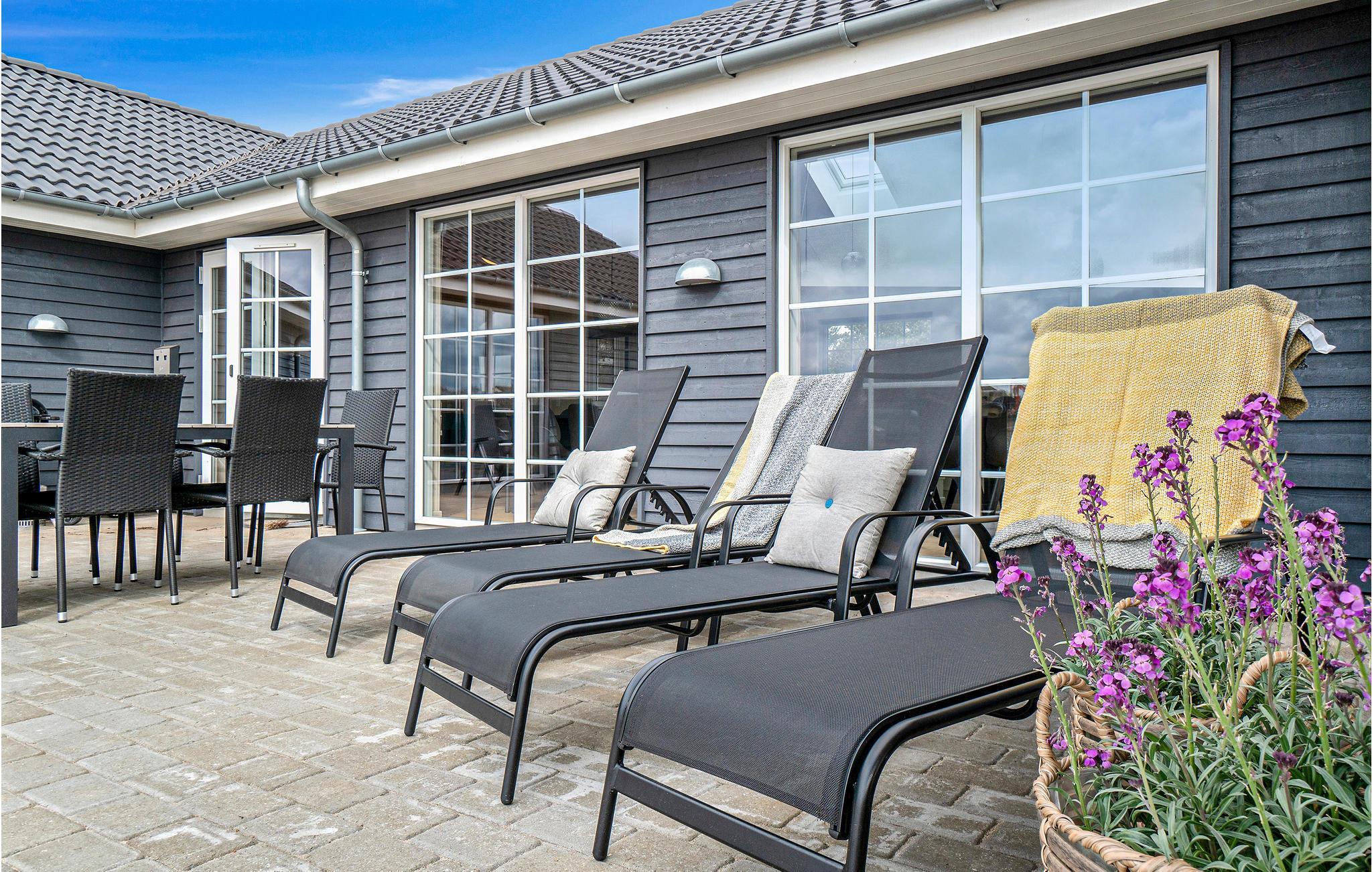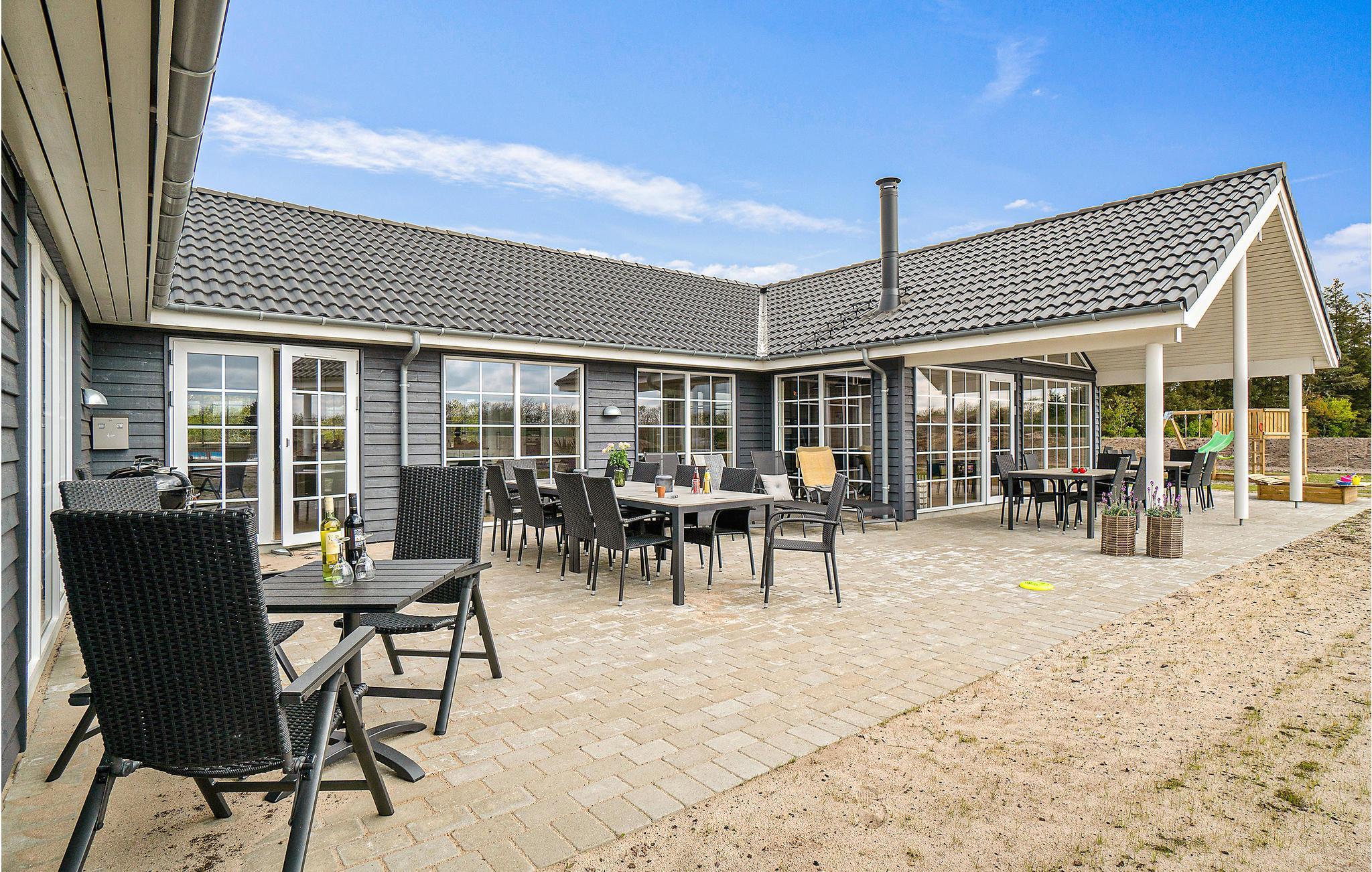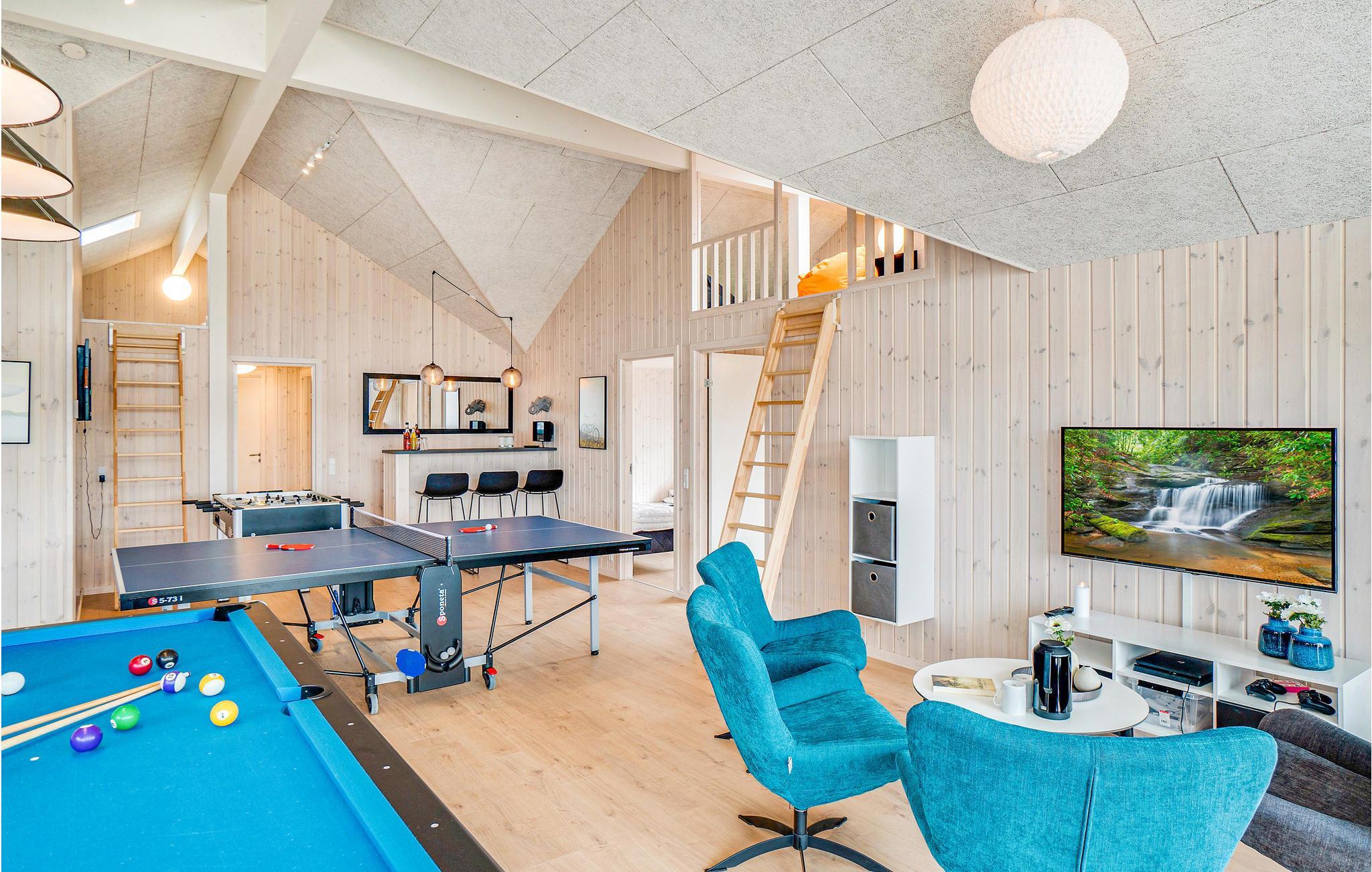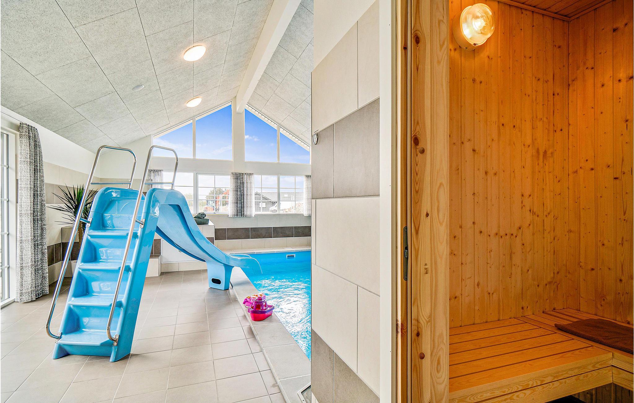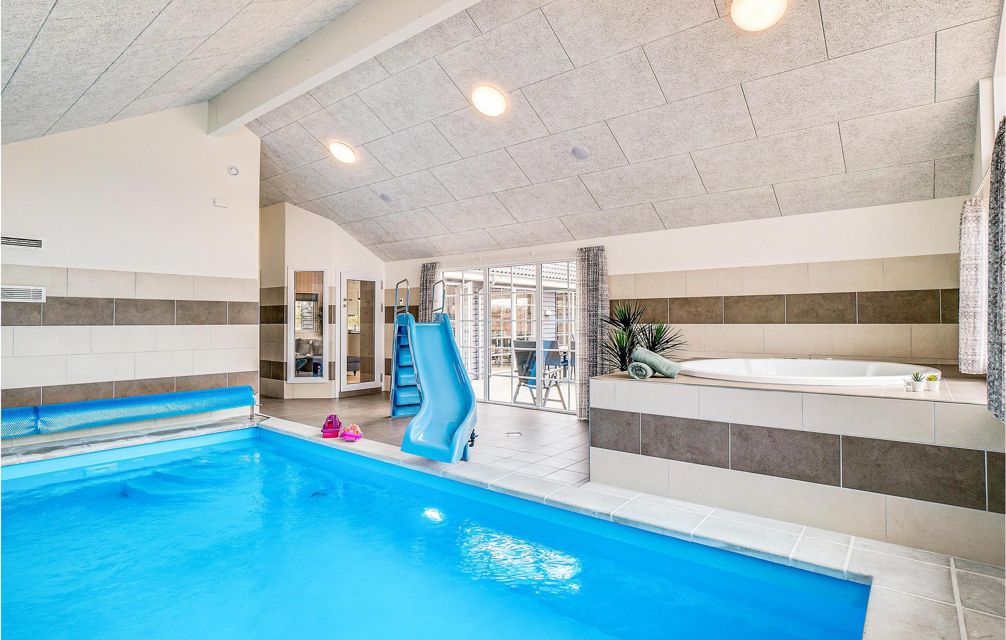 Her har I mulighed for en gennemført ferieoplevelse, uanset om I er til afslapning eller til aktiviteter. Er I til aktiv ferie, så har sommerhuset rigeligt at byde på, hvad angår indendørs aktiviteter. Aktivitetsrummet indeholder både billard, bordtennis og bordfodbold og fra baren i hjørnet kan tilskuerne nyde en kølig drink. I husets eget badeland kan I nyde godt af poolen med vandrutsjebane, modstrømsanlæg, stort spabad med plads til 4-6 personer og sauna. Det flotte, moderne køkken er stilfuldt indrettet og udstyret, og har direkte forbindelse til stuen hvor I finder spiseområdet med plads til alle husets gæster. Udendørs kan I hygge jer på den sydvendte terrasse som er delvist overdækket. Mens I nyder solen kan børnene lege på trampolin, gynge eller legetårnet med rutsjebanen. Senere kan I tilberede familiens livretter i den udendørs pizzaovn og nyde et lækkert måltid under aftensolen.