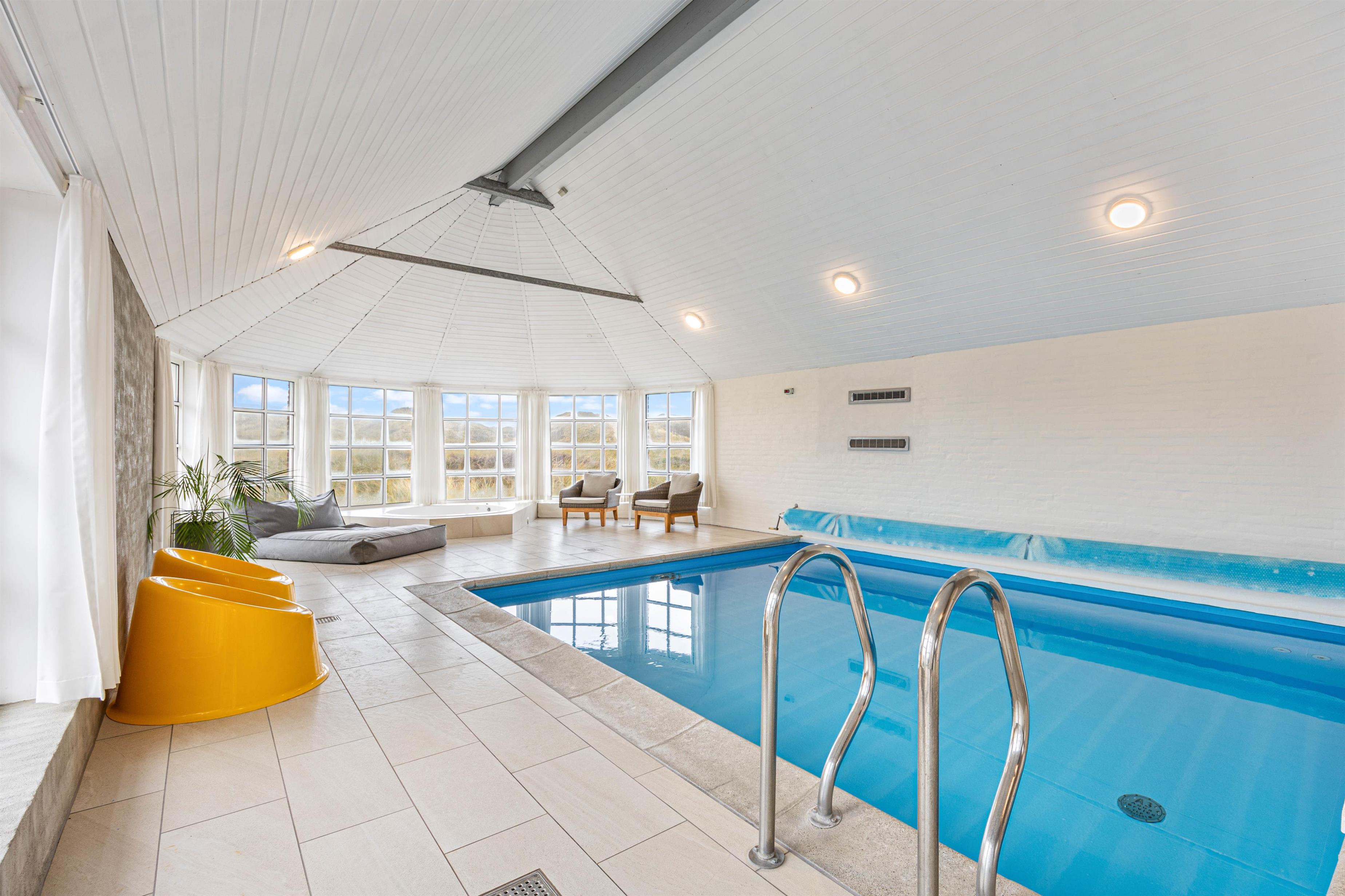 Med dette sommerhus er I ikke afhængige af vejret udenfor. Den 16 m2 store pool byder på timevis af underholdning for store og små i alle aldre. Selv når landskabet ligger dækket af en blød dyne af hvid sne, kan ungerne hoppe i vandet i husets pool. Poolen bliver opvarmet med en energivenlig varmepumpe, hvilket betyder et mindre forbrug. Sommerhuset har desuden en dejlig sauna og et stort spabad til 4 personer. Fra spabadet har du en helt fantastisk udsigt til det bølgende klitlandskab udenfor. Det giver velvære til krop og sjæl efter en lang dag i den friske luft.