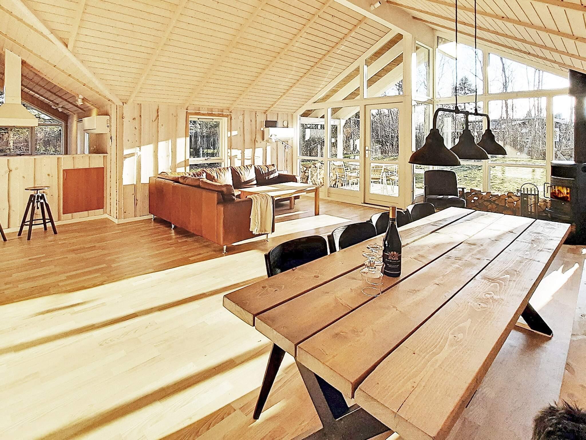 Sommerhuset indeholder stort åbent køkken forsynet med et almindeligt bredt udvalg af køkkenredskaber til brug for madlavning og bagning. En stor opholds- og spisestue med god brændeovn. I stuen er der smart-TV med airplay, som er tilsluttet chromecast med mulighed for at streame tv, film eller musik. Der er danske og tyske luftkanaler. Musik kan afspilles til en transportabel bluetooth højttaler. Badeværelset har gulvvarme, og der er adgang til spabad og sauna. 2 værelser identisk indrettet med brede dobbeltsenge og skabsplads. Et værelse med køjeseng, og mulighed for hjemmearbejdsplads, hvor der kan bruges hævesænke bord samt indstillelig konferencestol. Der er et udvalg af forskellige spil, bl.a. bræt - og puslespil til både voksne og børn. Husets indretning er moderne.