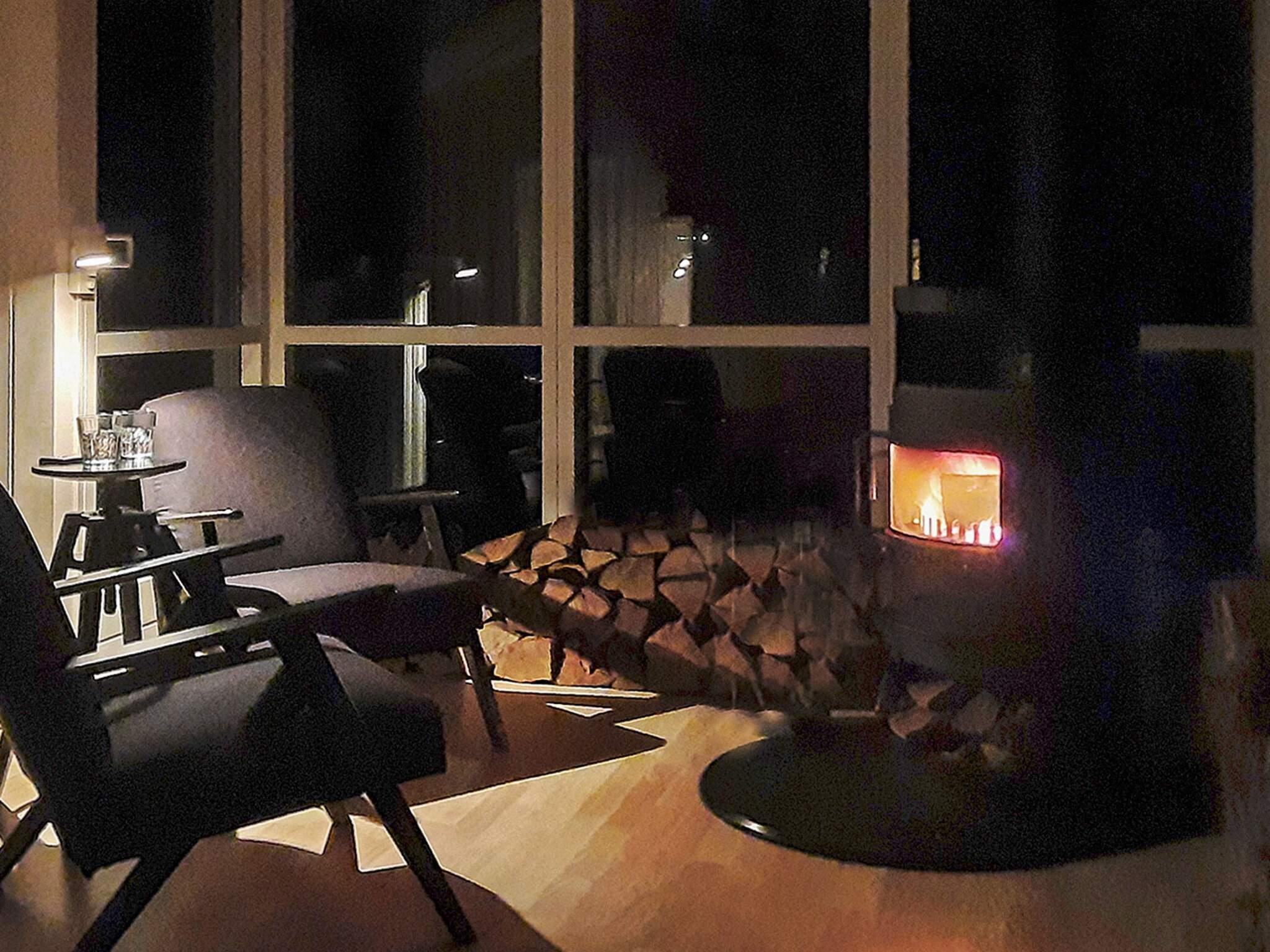 1 Opholdsstue: Brændeovn, Chromecast, tv, høj stol