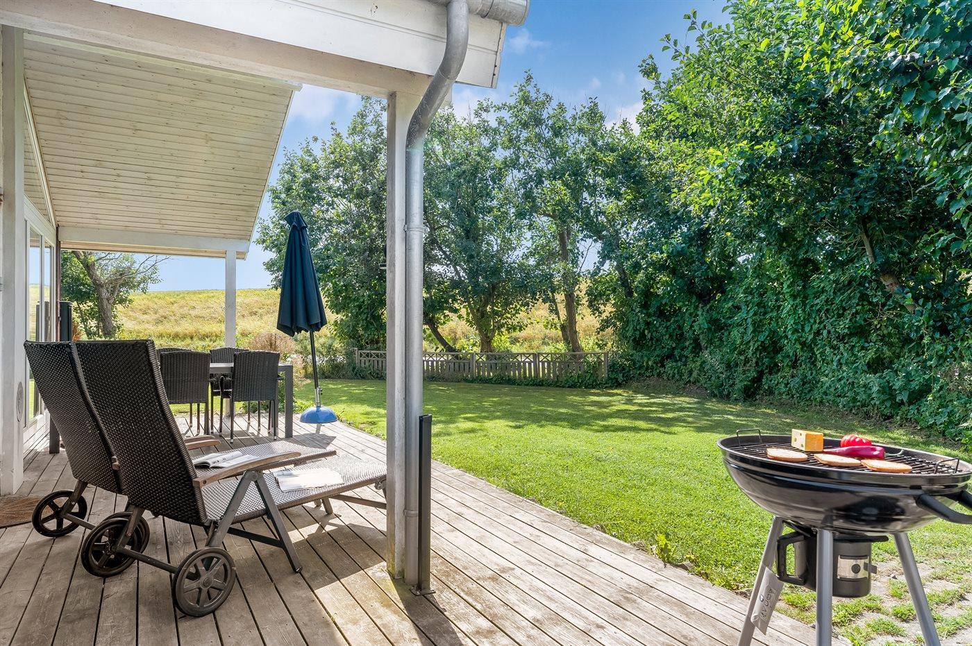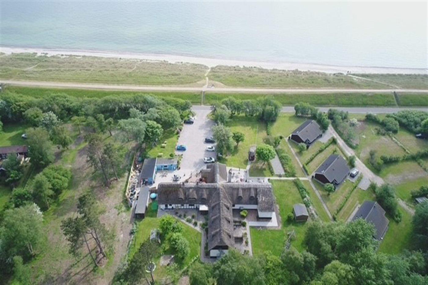 Ferieboligen er beliggende på en 650 m² stor havegrund. Der er 45 m til havet. Til ferieboligen hører åbent terrasseareal. Desuden er der overdækket terrasse. Parkering ved ferieboligen.