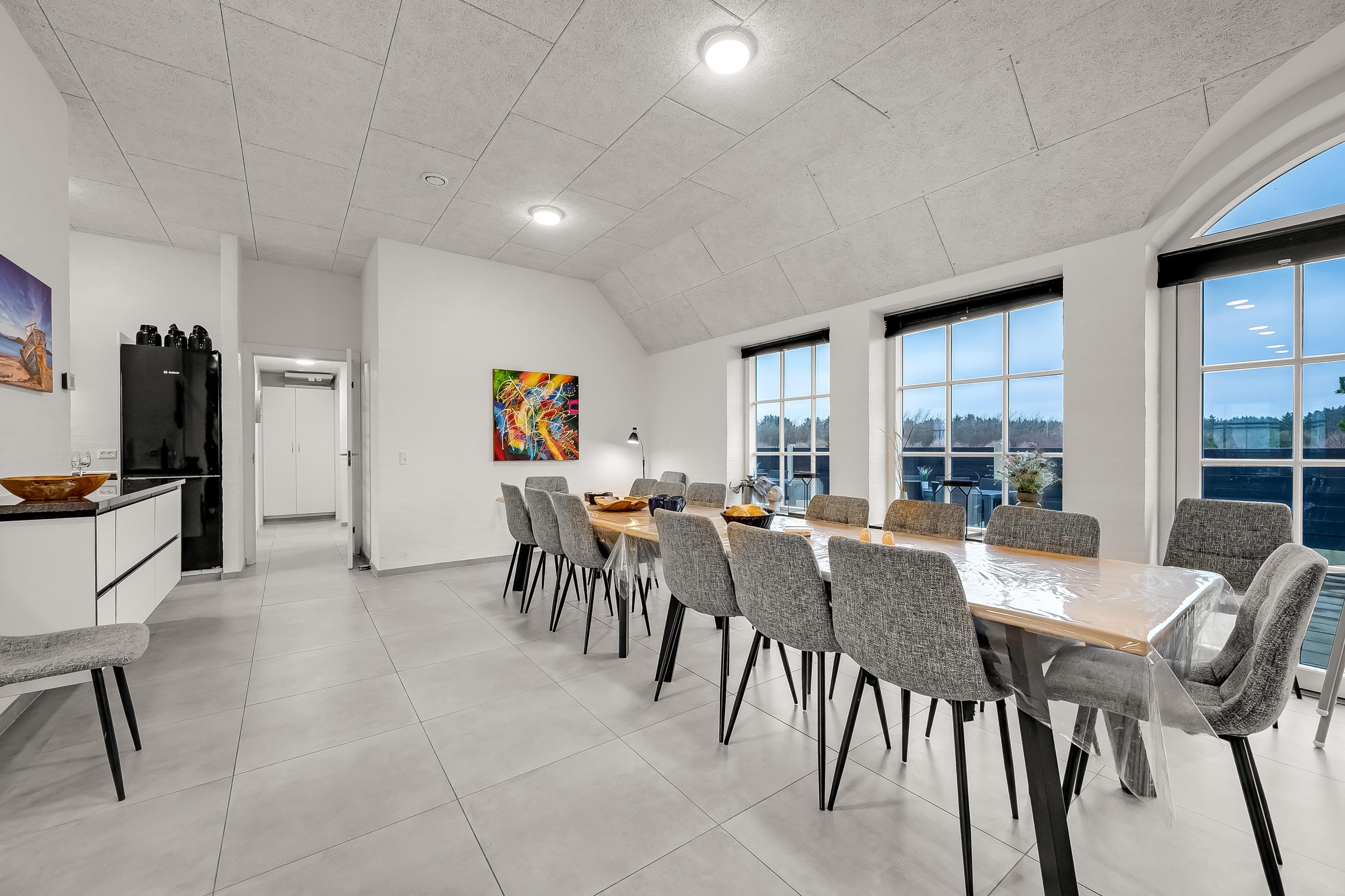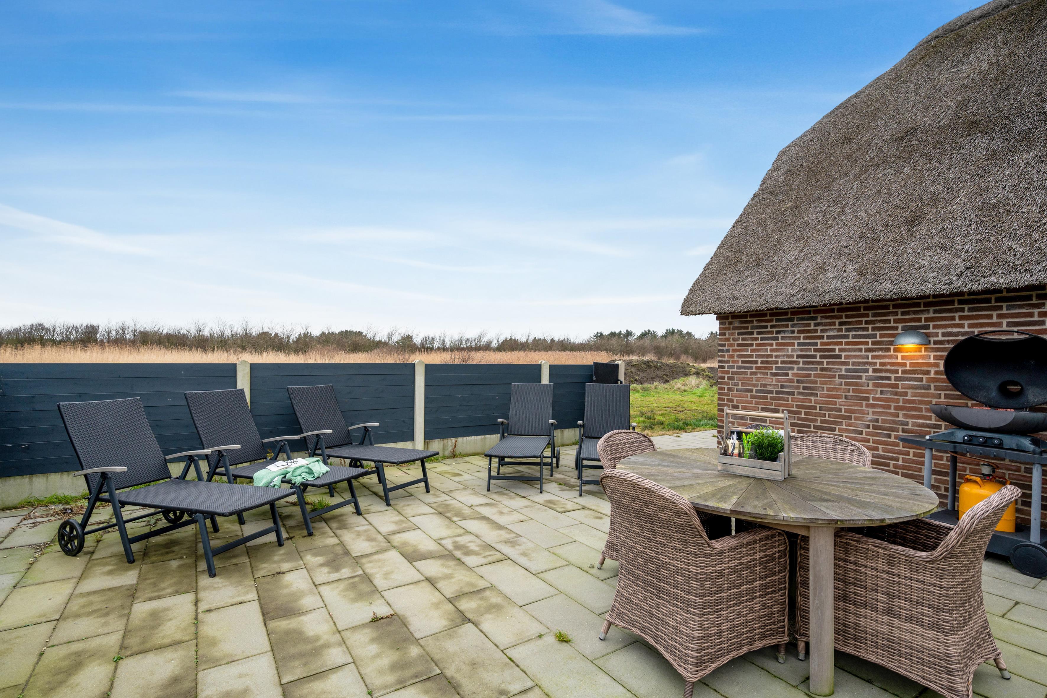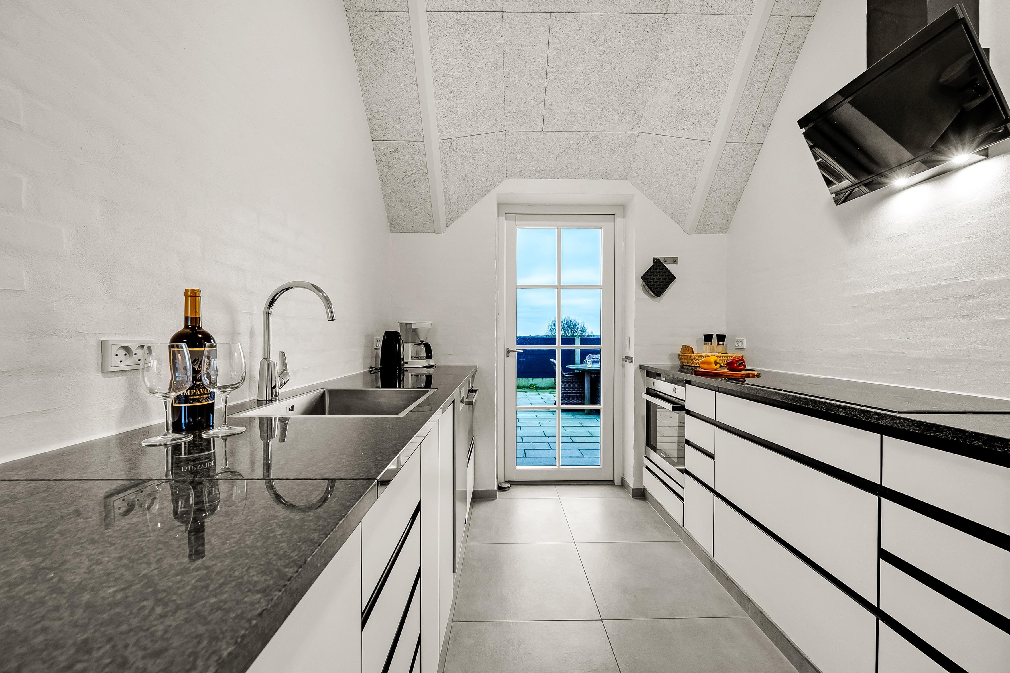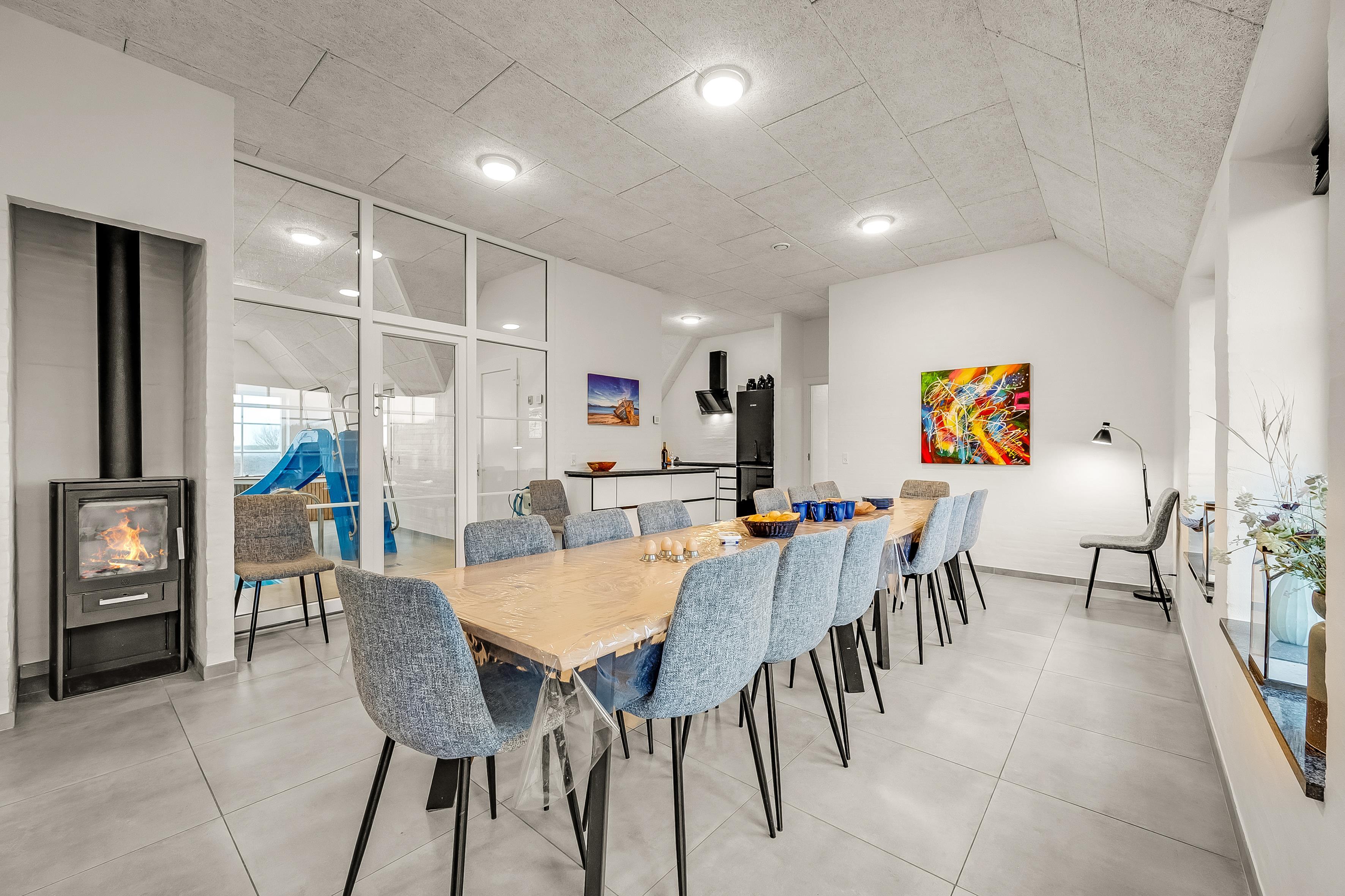 Husets stue er indrettet med en hyggelig brændeovn, der skaber en varm og indbydende atmosfære. Her kan I samle jer efter en dag med aktiviteter og nyde hinandens selskab. Den åbne planløsning mellem stuen og køkkenet gør det nemt at socialisere, mens der tilberedes lækre måltider. Køkkenet er fuldt udstyret med moderne apparater, herunder induktionskomfur, ovn, mikroovn, opvaskemaskine og et stort køleskab med fryser. Det er ligeledes muligt at tilberede mad på grillen, der findes på terrassen.