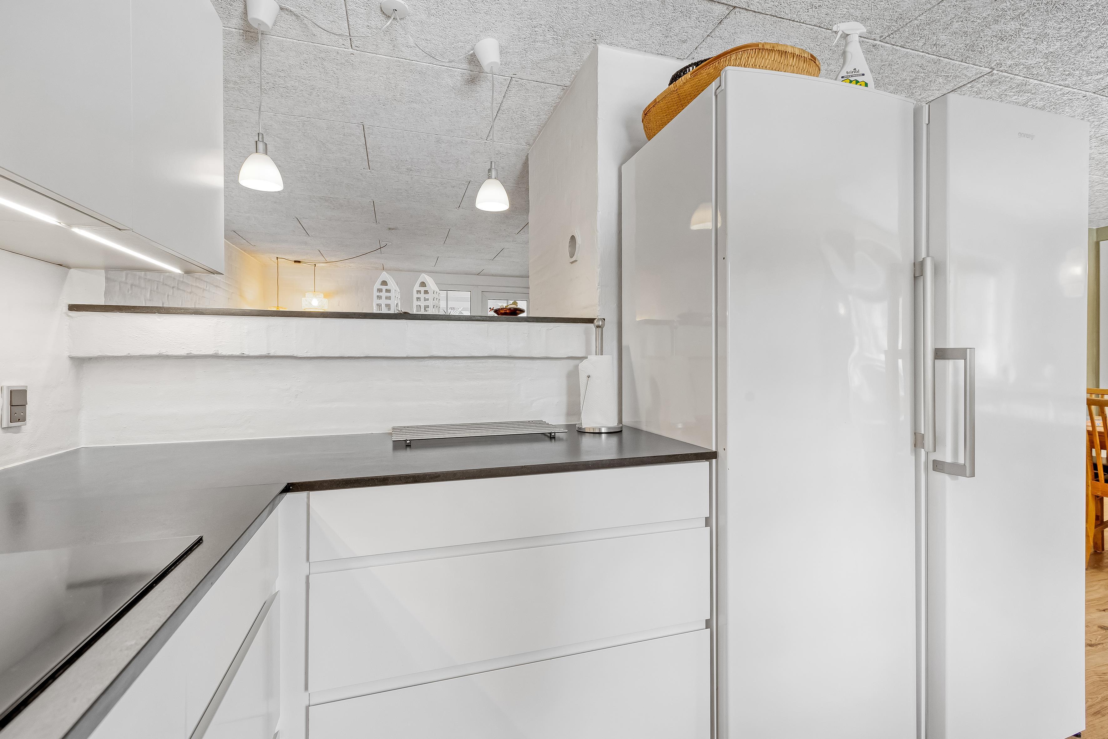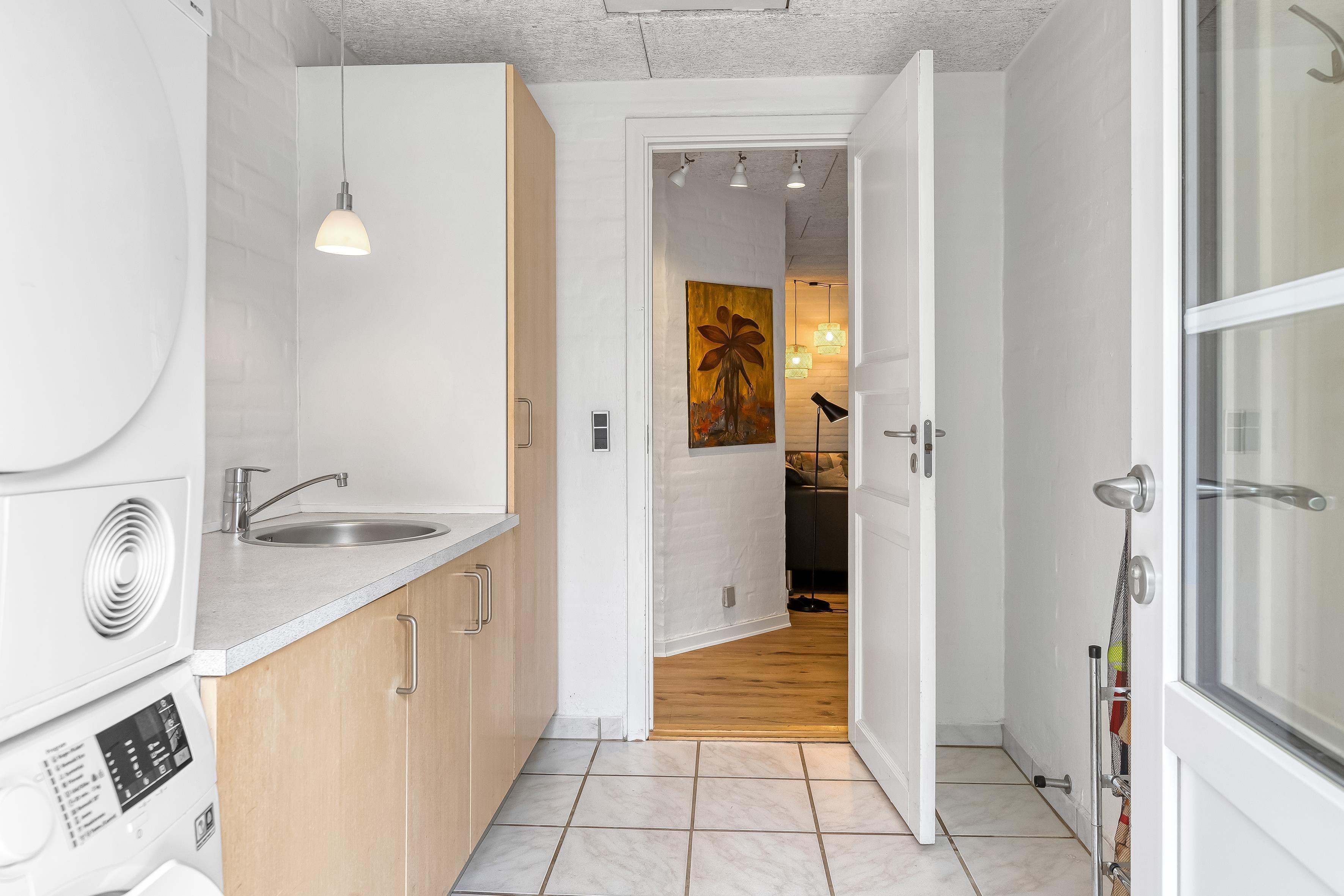 Køkkenet er yderst funktionelt og moderne, med en opvaskemaskine, mikrobølgeovn, ovn, køleskab og kaffemaskine – alt hvad du behøver for at tilberede lækre måltider. Der er også en tørretumbler og vaskemaskine til rådighed, hvilket gør det nemt at holde huset pænt og ryddeligt under dit ophold.